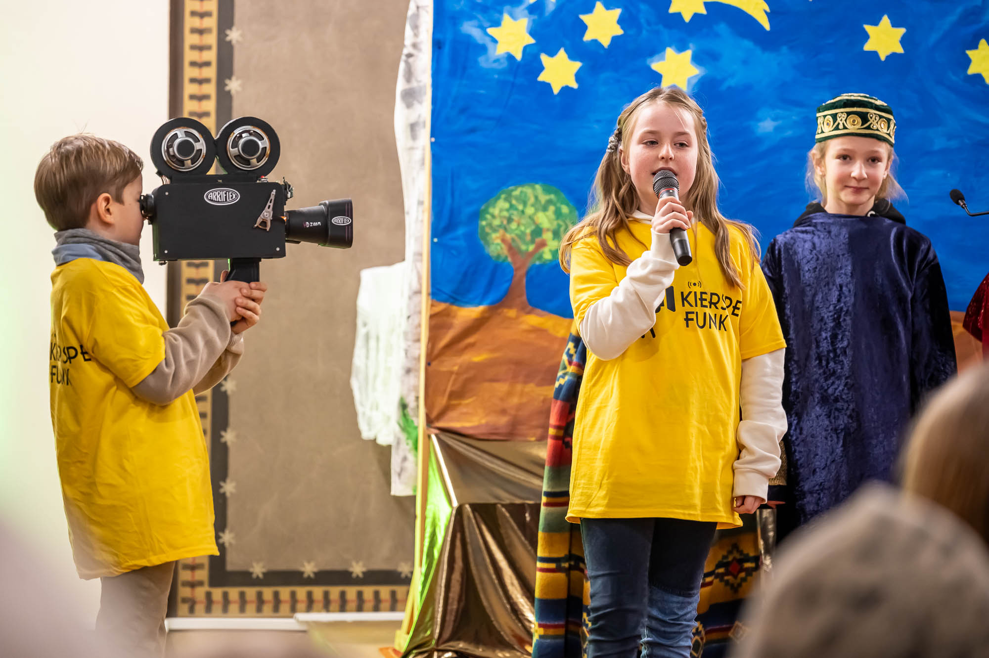 Ganz neu war das Konzept nicht, aber so wie es beim diesjährigen Heiligabend-Gottesdienst in der Kiersper Christus-Kirche umgesetzt wurde, war es überwältigend. Ein Krippenspiel ist ein wichtiger und beliebter Teil von Weihnachtsgottesdiensten, und doch eine kreative Herausforderung, wenn man die Geschichte um die Geburt Christi aus einer anderen Perspektive erzählen möchte. Jutta Betzendorfer-Fröhlich und das Team für den KU3-Unterricht und die Kindergottesdienste haben dafür quasi einen neuen Fernseh-Sender erschaffen: Den Kierspe-Funk. Die Reporterinnen und Reporter der imaginären TV-Station haben einen medialen Coup gelandet, und sind bereits frühzeitig auf Maria und Josef aufmerksam geworden, die sich auf einen beschwerlichen Weg nach Betlehem machen mussten. Dass am Ende sogar eine Liveschaltung kurz nach der Geburt des Heilandes glücken sollte, war zu diesem Zeitpunkt noch garnicht absehbar. Jedenfalls haben Kameramänner, Moderatorinnen und Nachrichtensprecherinnen in wirklich hochprofessioneller Weise von der Weihnachtsgeschichte “berichtet”.
