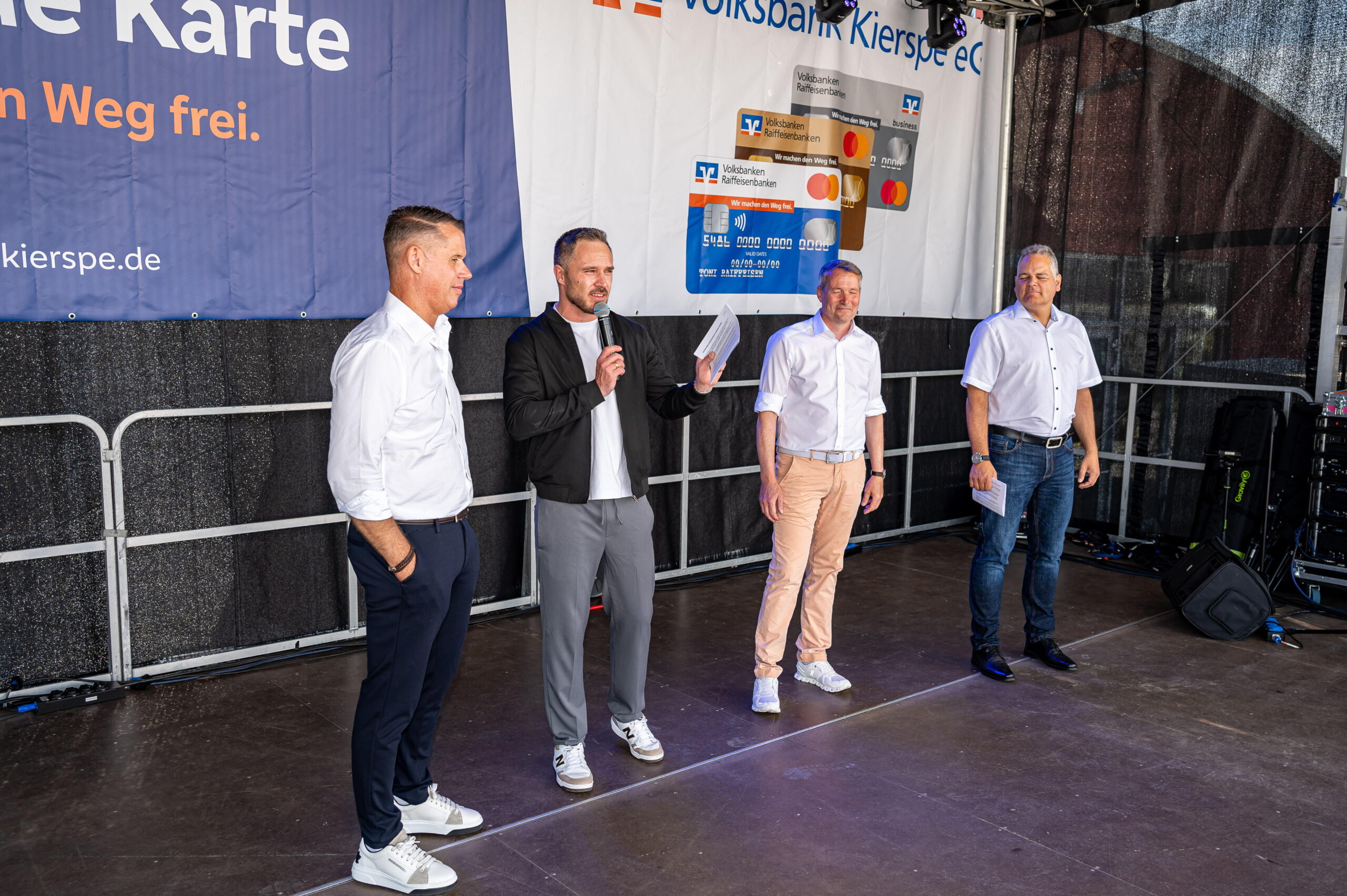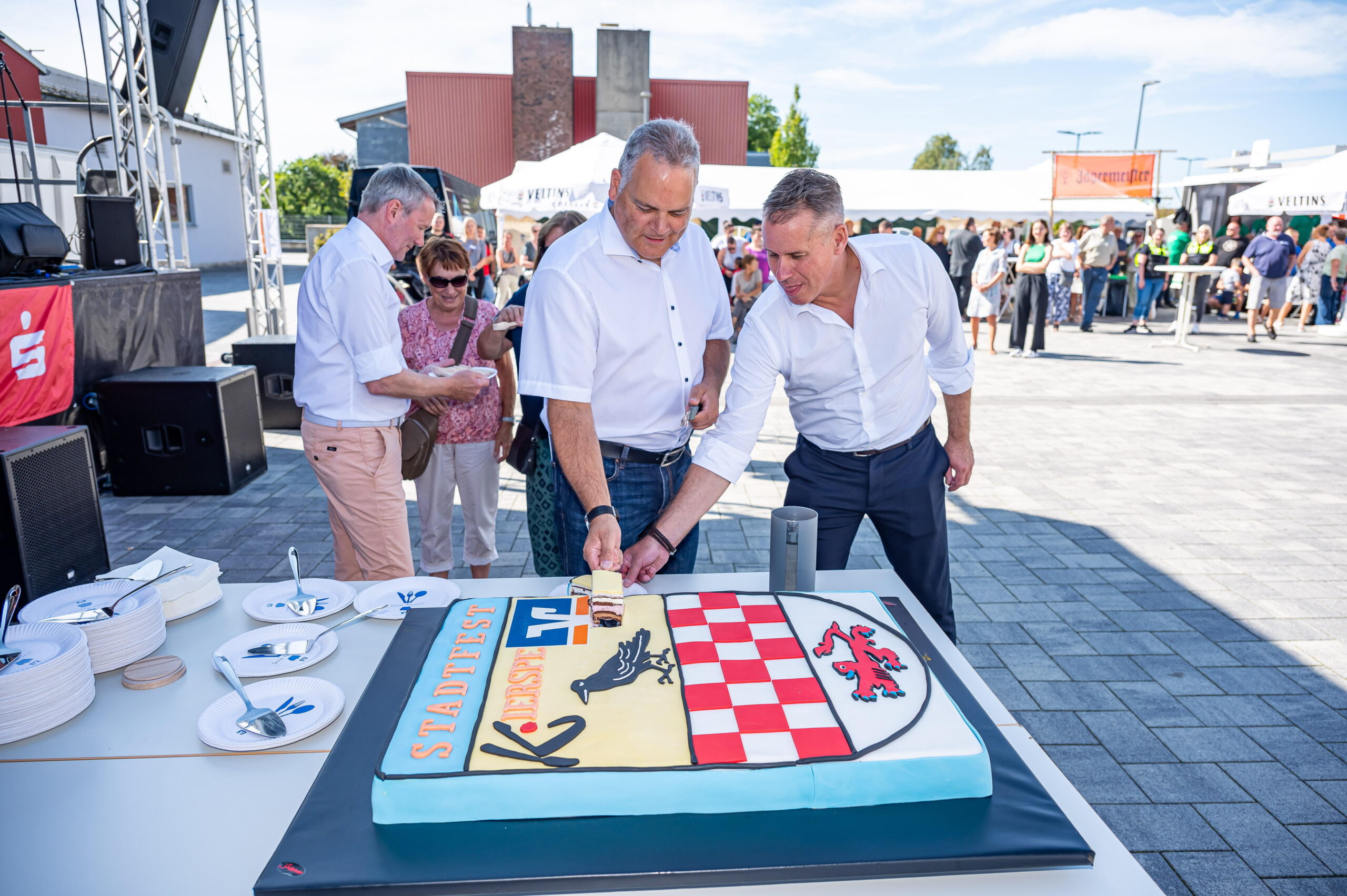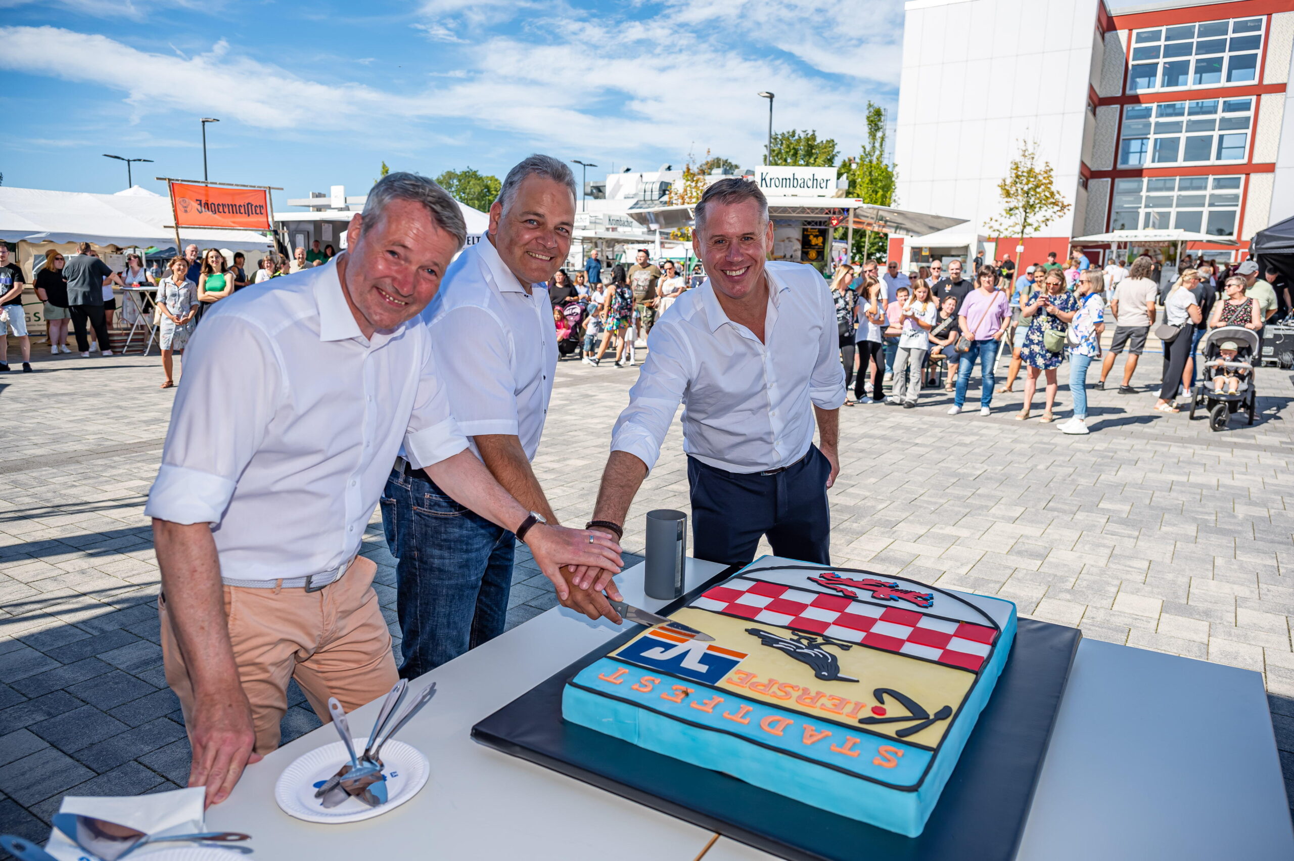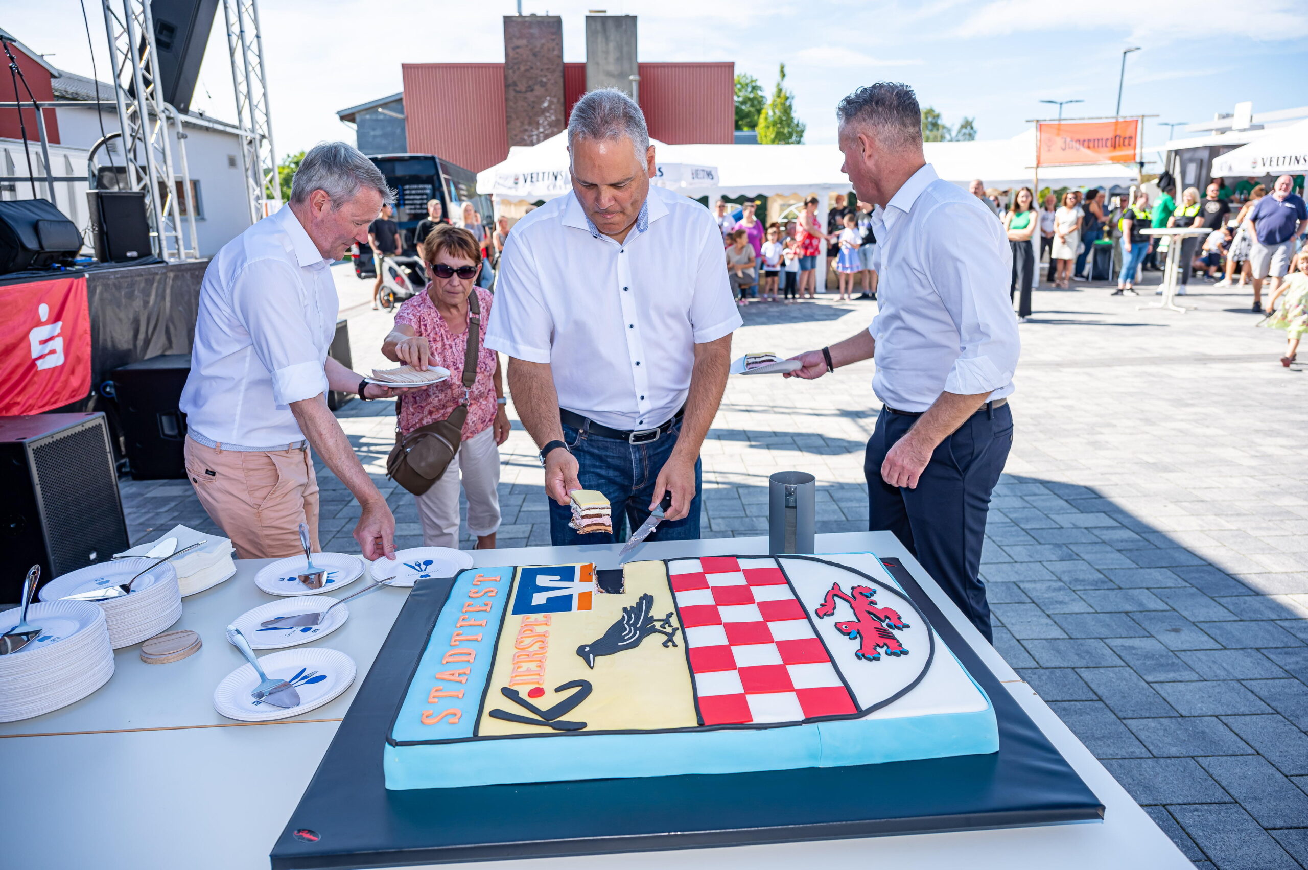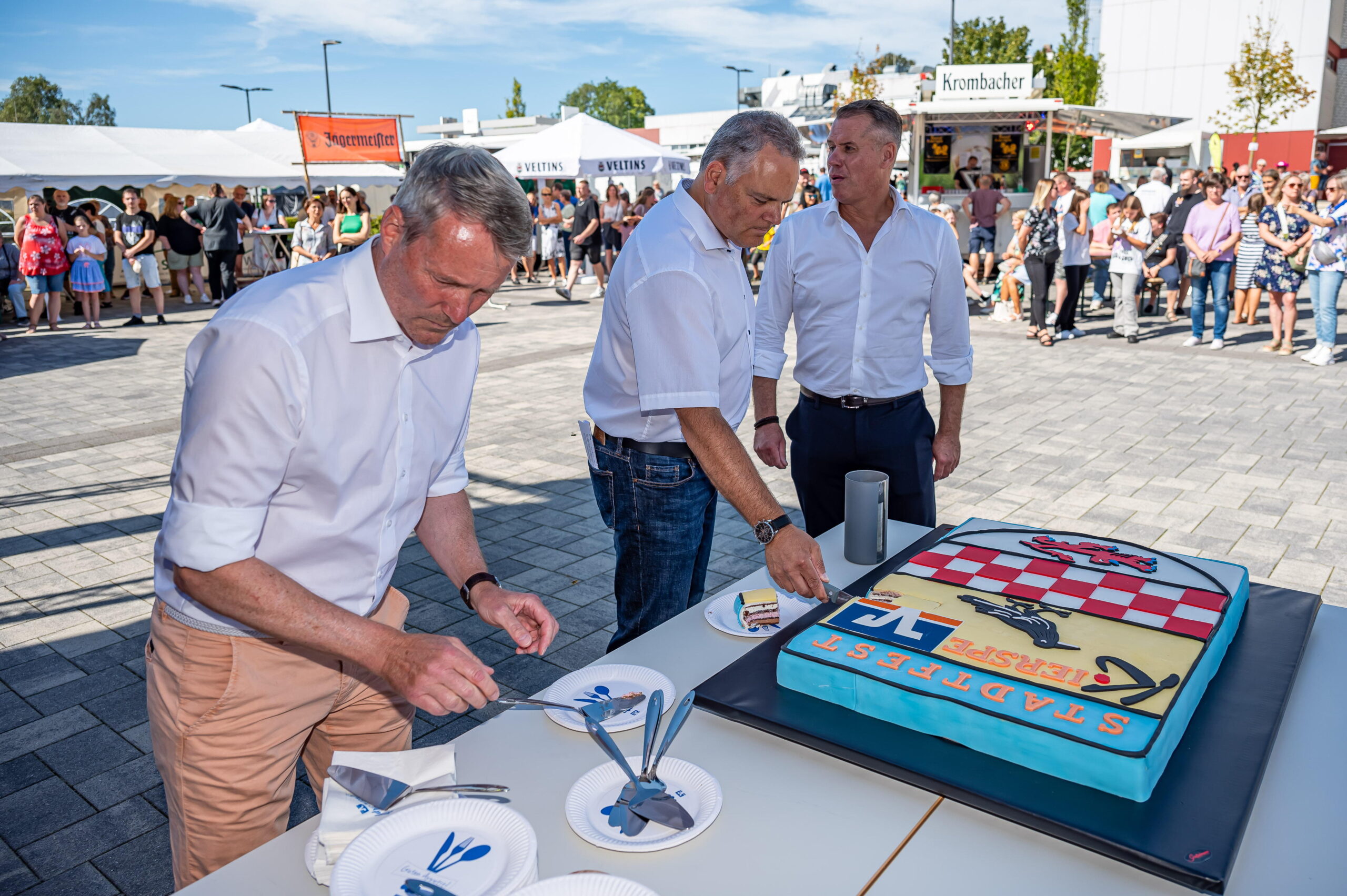 KIERSPE (mk) Sonnig-warm ist es, und so strömen viele Menschen zum Forum vor der Gesamtschule. Hier wurde am heutigen Samstag das Stadtfest eröffnet. Bürgermeister Olaf Stelse begrüßte die Gäste mit einer kurzen Ansprache, und wurde dabei, vor allem beim anschließenden Tortenanschnitt von den Volksbank-Vorständen Stephan Baldschun und Stephan Böhme tatkräftig unterstützt. Die Volksbank ist diesmal der Hauptsponsor des Stadtfestes.