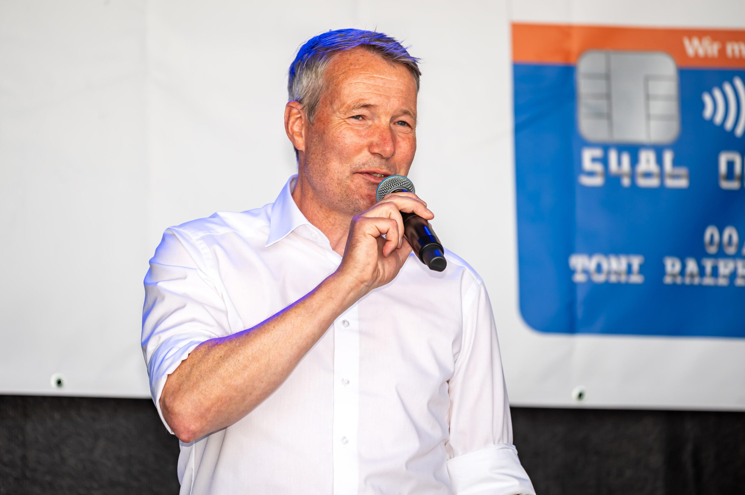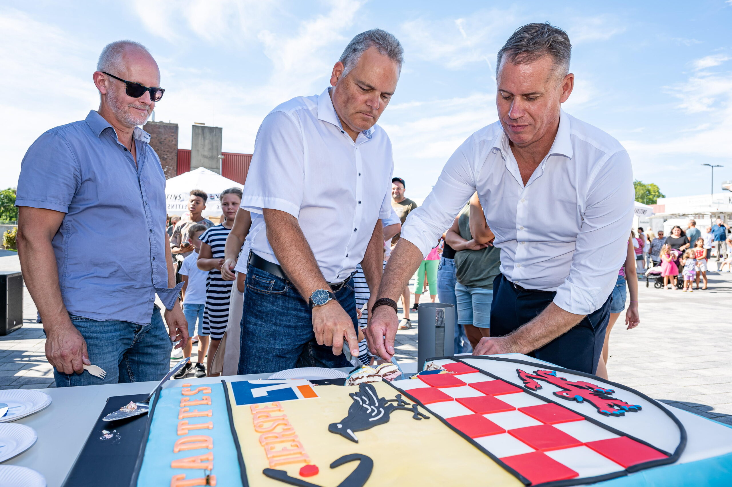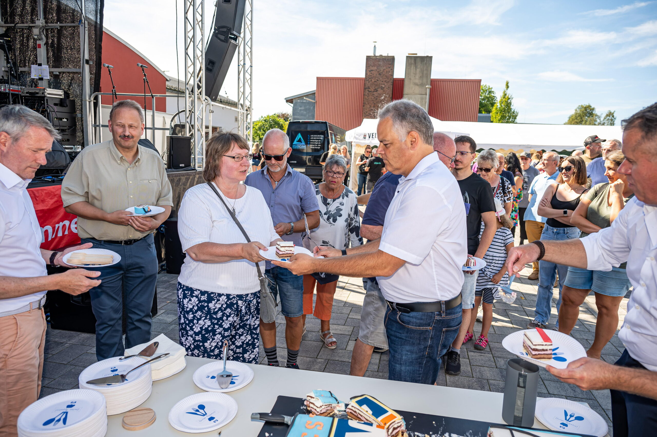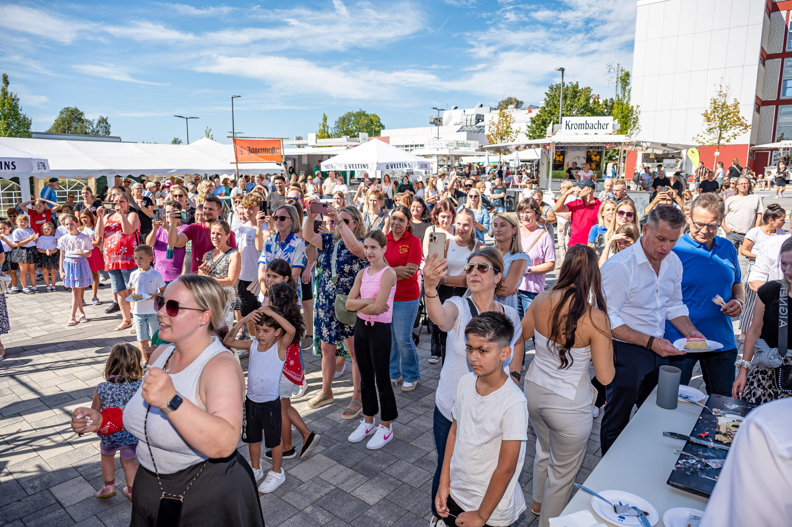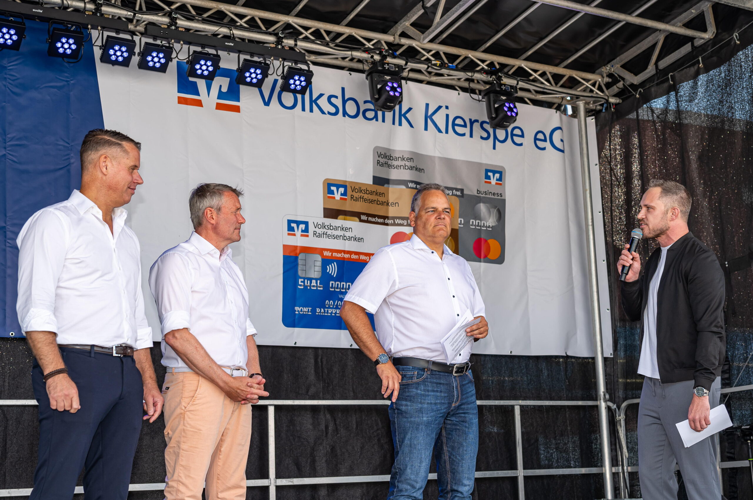 KIERSPE (mk) Sonnig-warm ist es, und so strömen viele Menschen zum Forum vor der Gesamtschule. Hier wurde am heutigen Samstag das Stadtfest eröffnet. Bürgermeister Olaf Stelse begrüßte die Gäste mit einer kurzen Ansprache, und wurde dabei, vor allem beim anschließenden Tortenanschnitt von den Volksbank-Vorständen Stephan Baldschun und Stephan Böhme tatkräftig unterstützt. Die Volksbank ist diesmal der Hauptsponsor des Stadtfestes.