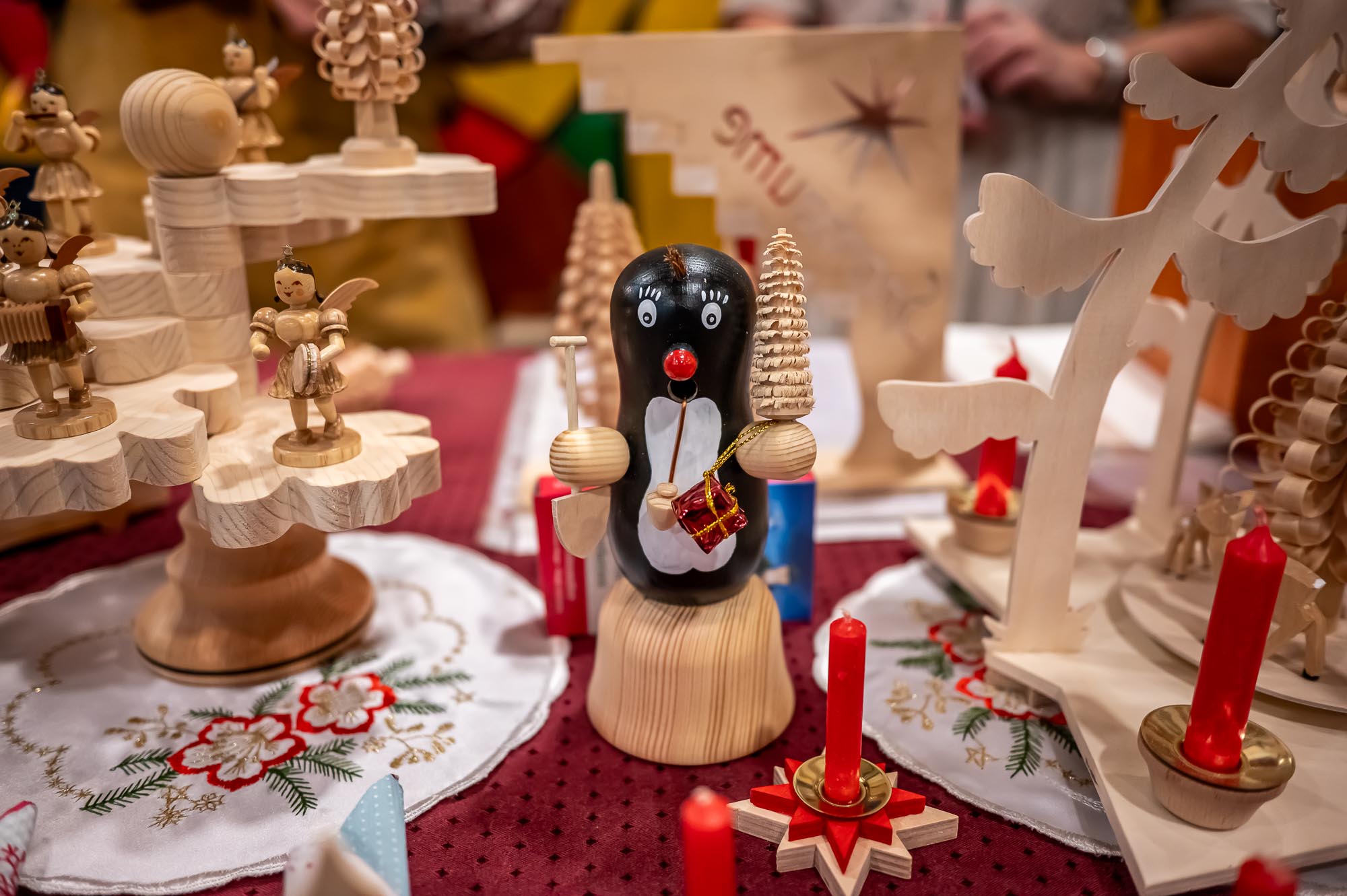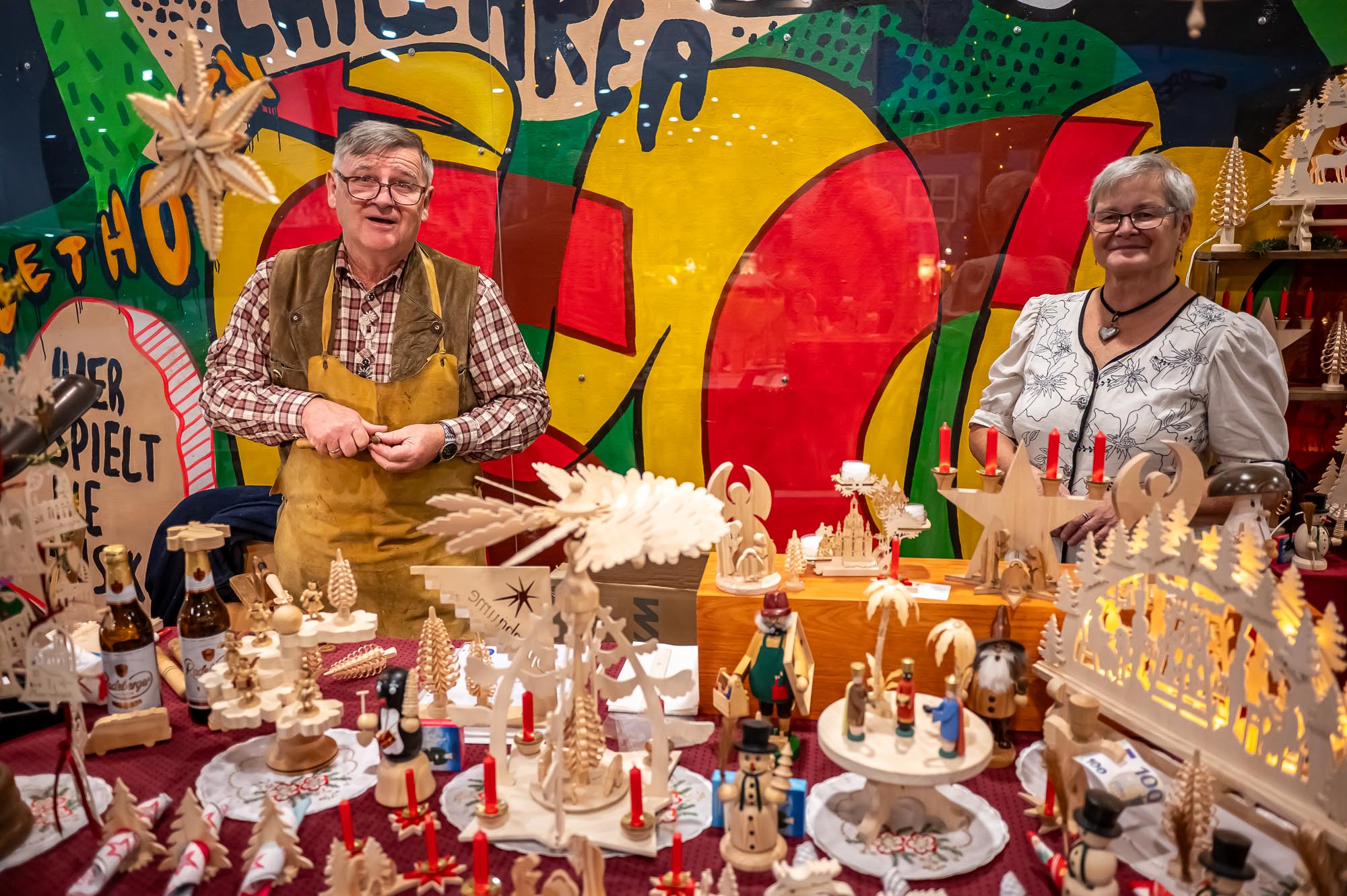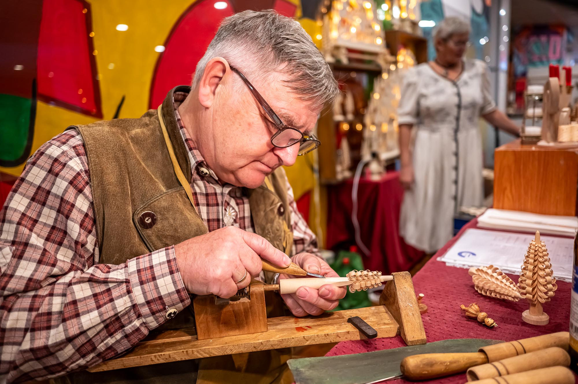 Holz ist auch der Grundstoff, mit denen Hans-Jörg und Elke Berthold ihre Schnitz-Arbeiten fertigen. An ihrem Stand kamen unwillkürlich verschneite Landschaften im Erzgebirge in den Sinn, denn dieser Stilrichtung widmen sich das Plettenberger Paar. Spanbaumstechen konnten die Besucher hier live erleben, und bekamen so eine konkreten Einblick, wieviel liebevolle Arbeit in den Werken steckt.