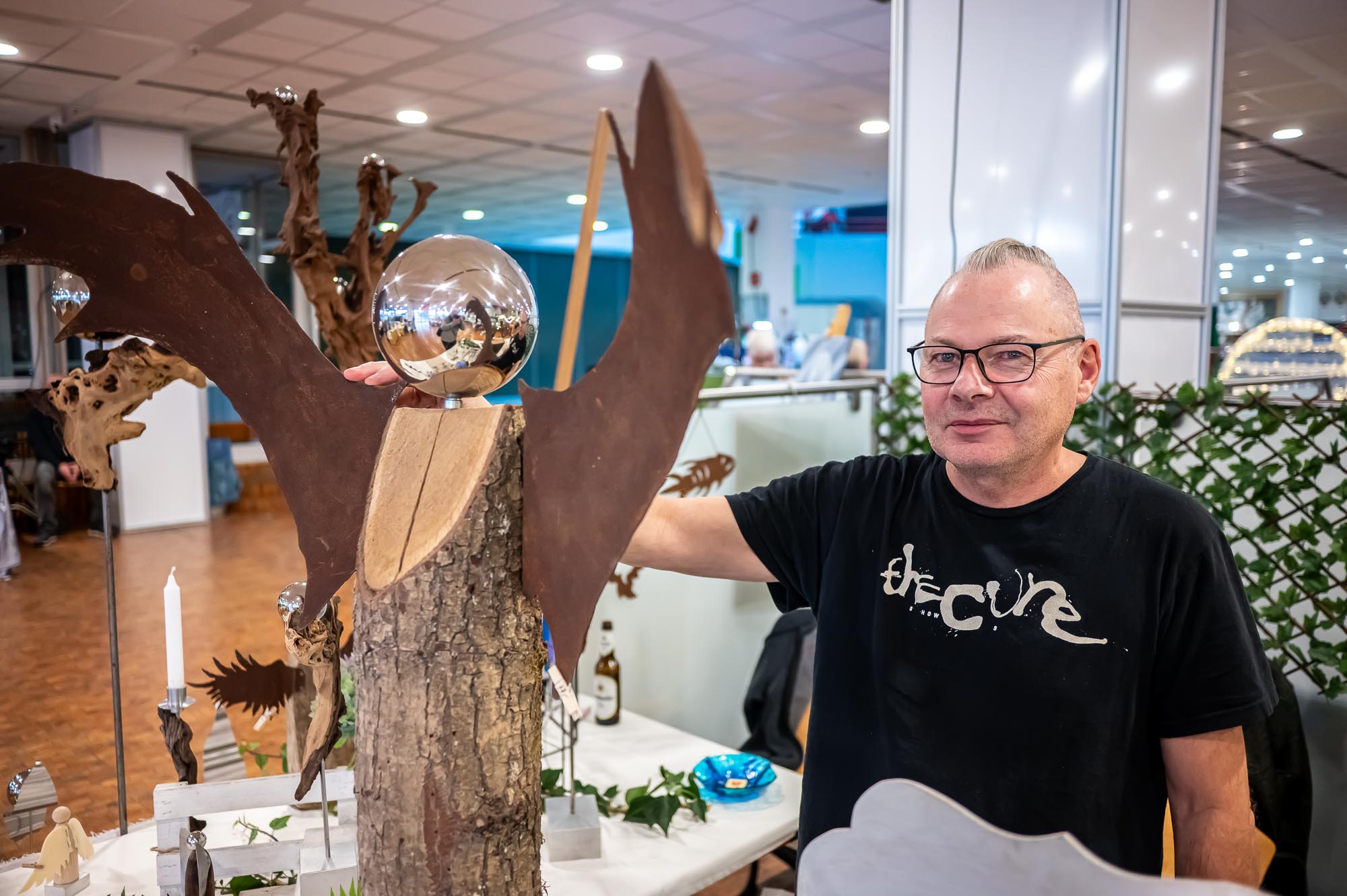 Die Ausstellenden kamen überwiegend aus dem oberen Volmetal, jedoch nicht alle. Aus dem oberbergischen Wiehl stammt Stefan Müller, der seine Werkstoffe statt mit Pinsel eher mit schwerem Werkzeug bearbeitet. Während viele der Künstler auch vor Ort ihrer Leidenschaft nachgingen, kam das für ihn, dessen Frau aus Kierspe stammt, nicht in Frage: „Meinen Plasma-Schneider wollte ich nicht mitbringen“, schmunzelt Müller, der gerne mit Treibholz und Metall Skulpturen baut. Gerne in größerer Art, für den Garten.