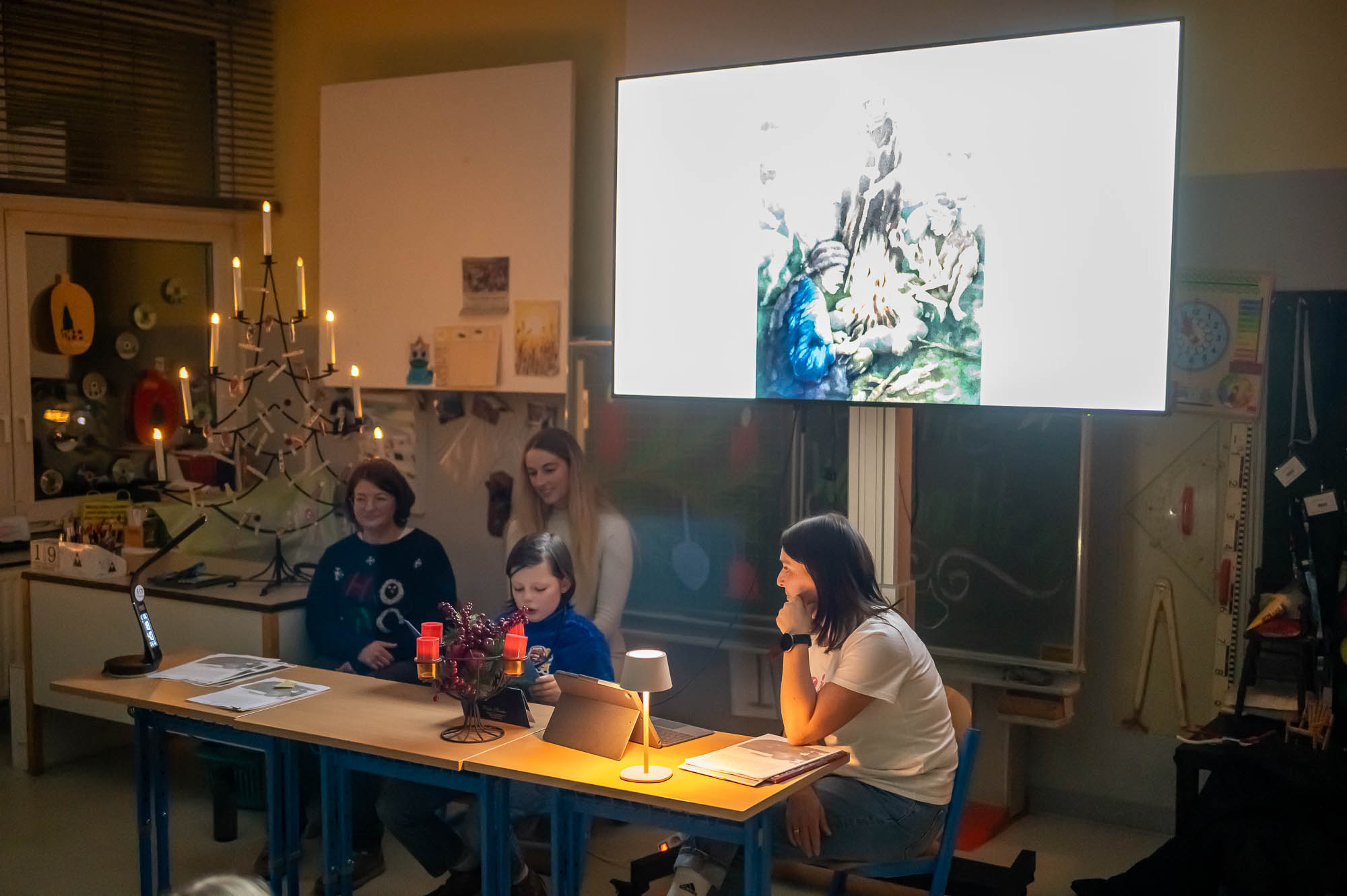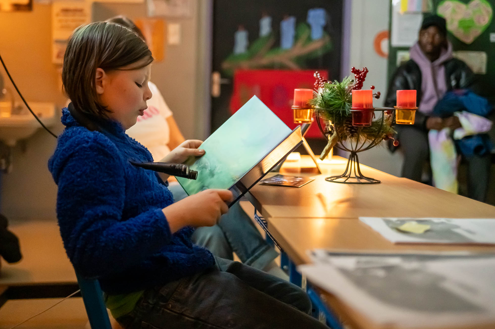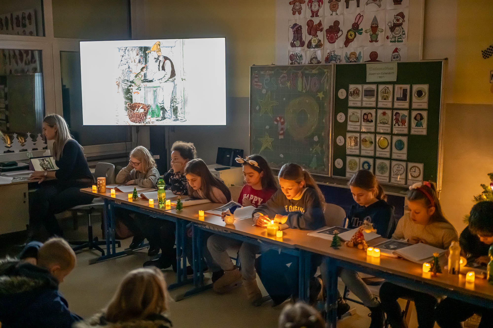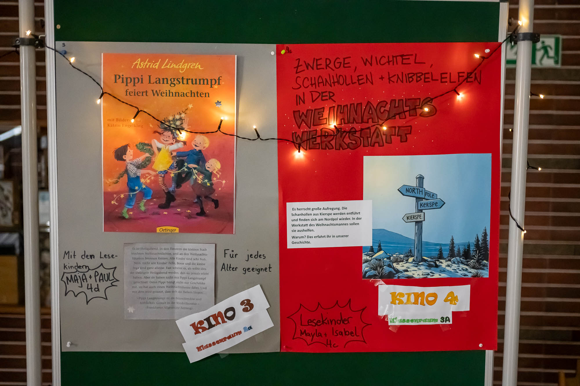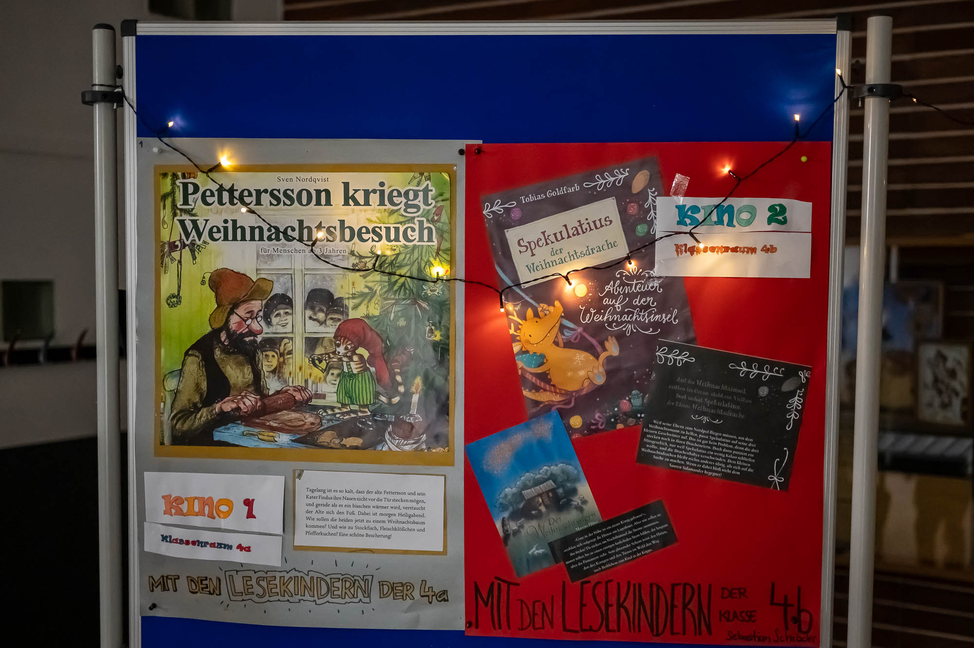Die die kleinen und großen Besucher ergab sich aber eine schwierige Entscheidung. Nicht die zwischen Kinderpunsch oder Weihnachtskeksen, denn es gab beides. Aber gleich vier Geschichten lockten mit bunten Plakaten in die Kinos, und starteten dort zur selben Zeit. Wie im richtigen Kino musste man eine Karte ergattern. Das führte dazu, dass alle vier Klassenräume ziemlich voll besetzt waren. Die Storys, die Lehrer wie Lesekinder ihrem gebannt lauschendem Publikum vortrugen, hatten natürlich alle etwas Weihnachtliches: “Pettersson kriegt Weihnachtsbesuch”, Spekulatius”, “Pippi feiert Weihnachten” und “Als die Knibbelelfen streikten” passten wunderbar in die Adventszeit, und die Klassenzimmer (Verzeihung: LESEKINOS) waren weihnachtlich geschmückt. Für alle, die sich nur schwer für eine Vorstellung entscheiden konnten, bleibt ein Trost: Alle waren toll. Und wer nicht genug bekam, kommt einfach nächstes Jahr wieder, dann ist allerdings wieder die Schanhollenschule als Gastgeber an der Reihe.