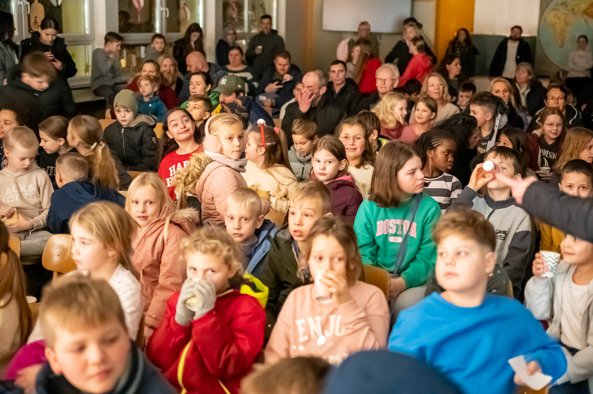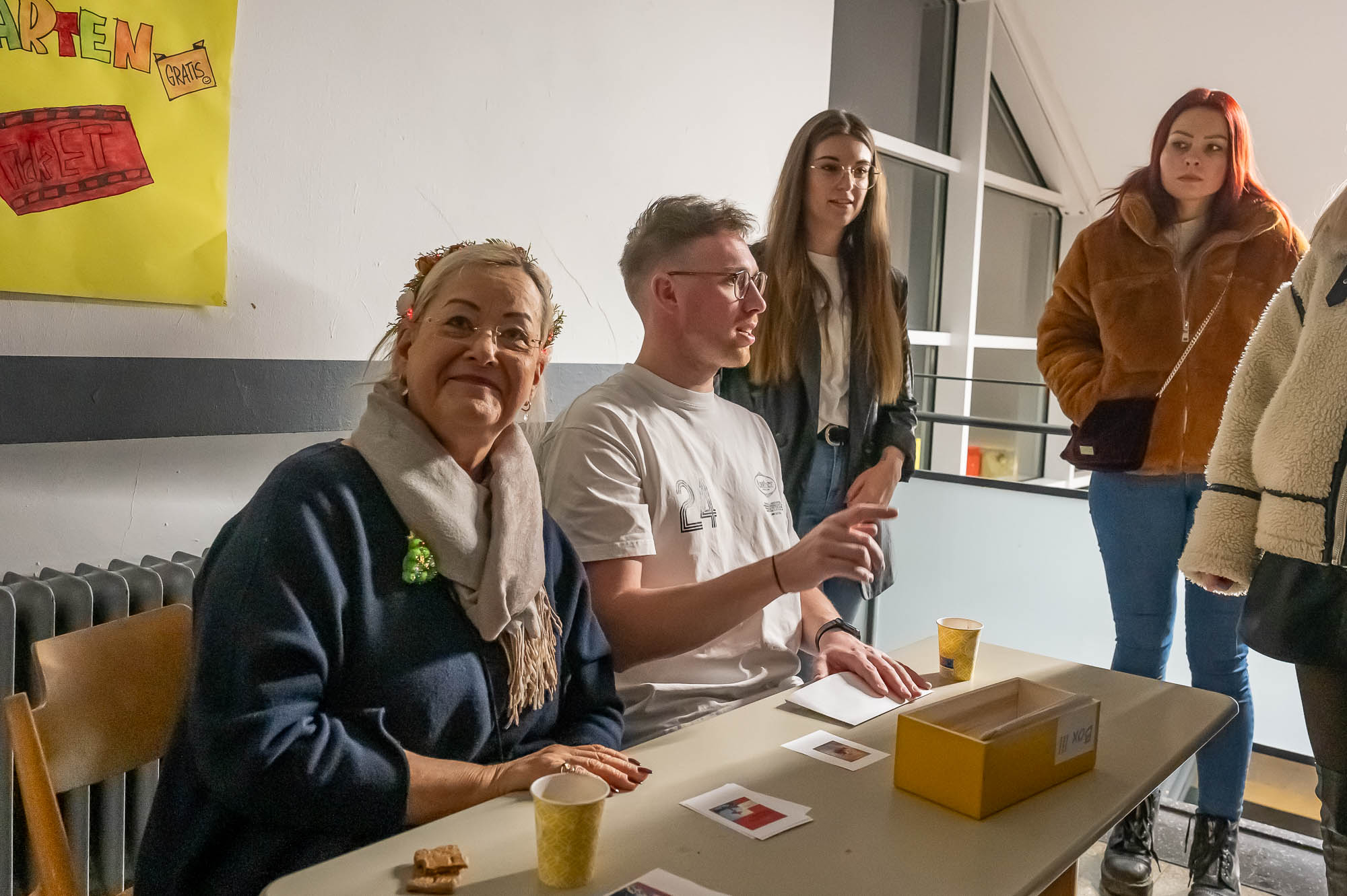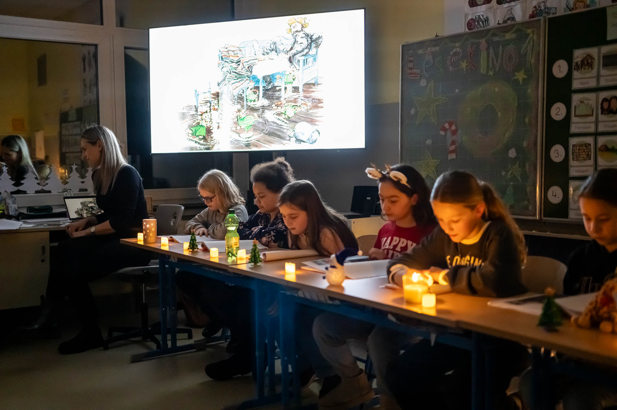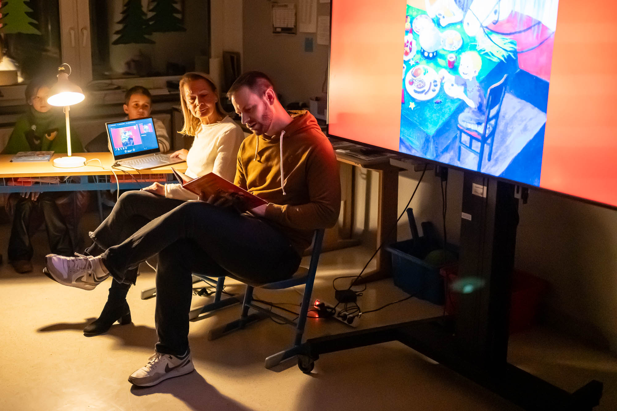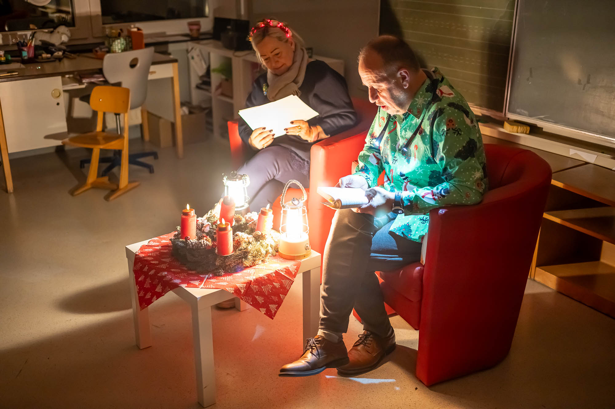 Die die kleinen und großen Besucher ergab sich aber eine schwierige Entscheidung. Nicht die zwischen Kinderpunsch oder Weihnachtskeksen, denn es gab beides. Aber gleich vier Geschichten lockten mit bunten Plakaten in die Kinos, und starteten dort zur selben Zeit. Wie im richtigen Kino musste man eine Karte ergattern. Das führte dazu, dass alle vier Klassenräume ziemlich voll besetzt waren. Die Storys, die Lehrer wie Lesekinder ihrem gebannt lauschendem Publikum vortrugen, hatten natürlich alle etwas Weihnachtliches: “Pettersson kriegt Weihnachtsbesuch”, Spekulatius”, “Pippi feiert Weihnachten” und “Als die Knibbelelfen streikten” passten wunderbar in die Adventszeit, und die Klassenzimmer (Verzeihung: LESEKINOS) waren weihnachtlich geschmückt. Für alle, die sich nur schwer für eine Vorstellung entscheiden konnten, bleibt ein Trost: Alle waren toll. Und wer nicht genug bekam, kommt einfach nächstes Jahr wieder, dann ist allerdings wieder die Schanhollenschule als Gastgeber an der Reihe.