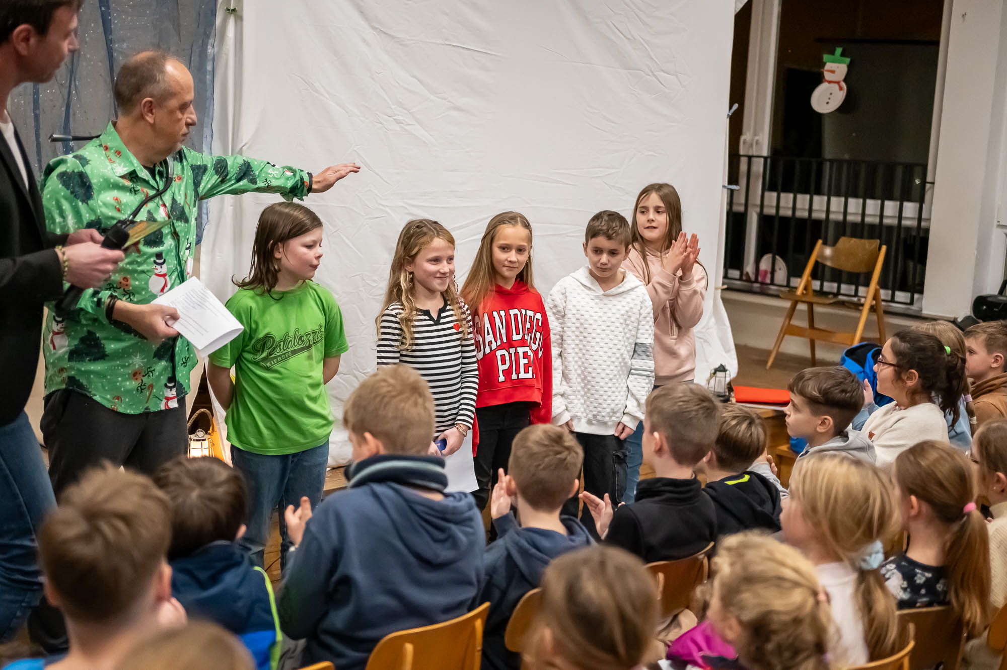 Die Aula war zur Aufführung am Donnerstag, 19. Dezember, rappelvoll wie eh und je, und die beteiligten Lehrerinnen und Lehrer auf der Bühne hatten genauso viel Spaß an dieser Theatervorstellung wie die Kinder. So gab es diesmal keine klassische Weihnachtsgeschichte, sondern das Abenteuer von Esel, Hund, Katze und Hahn. Der Applaus war gerechter Lohn für die Darbietung, die den Akteuren auch körperlich einiges abverlangte.