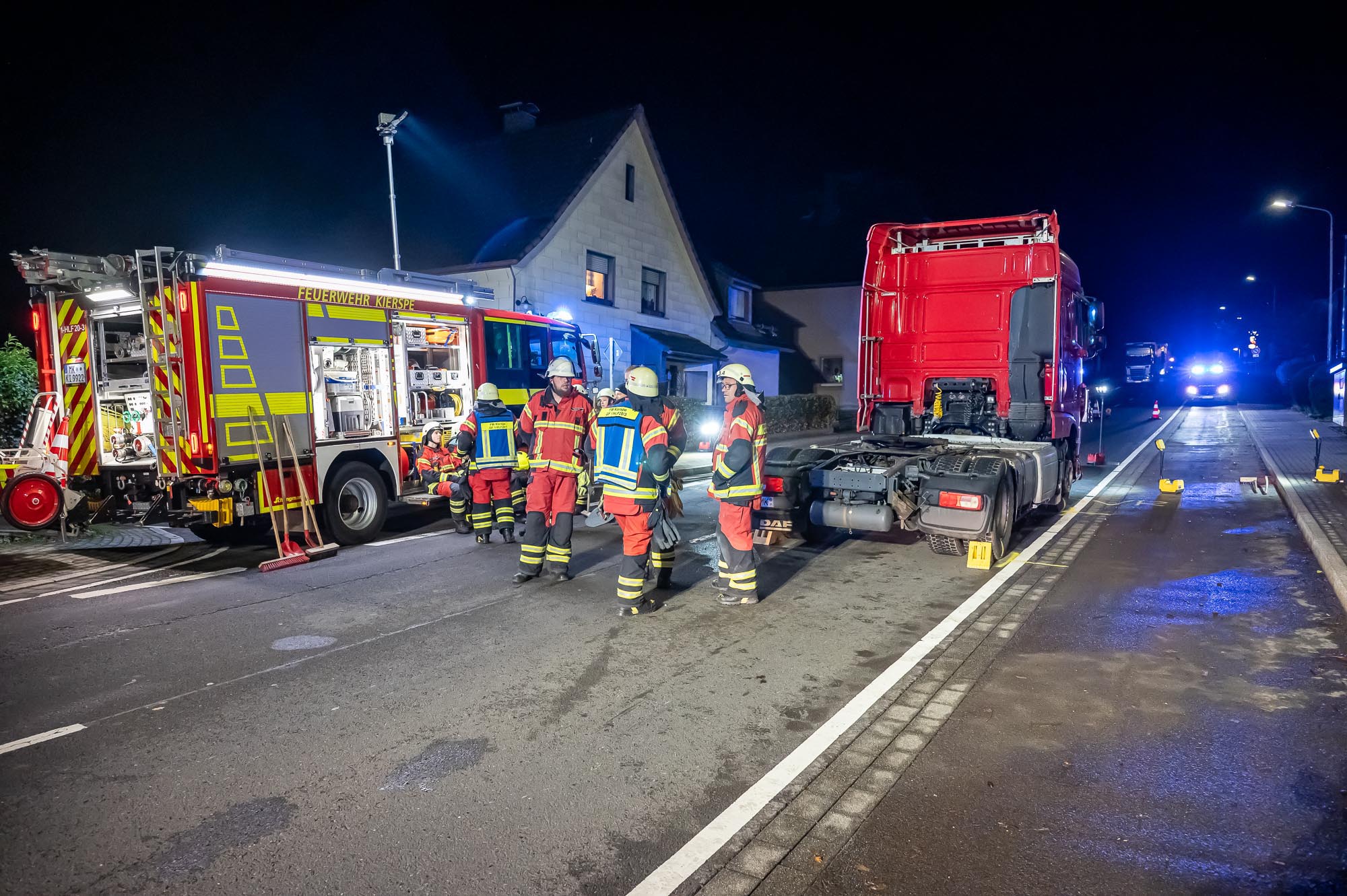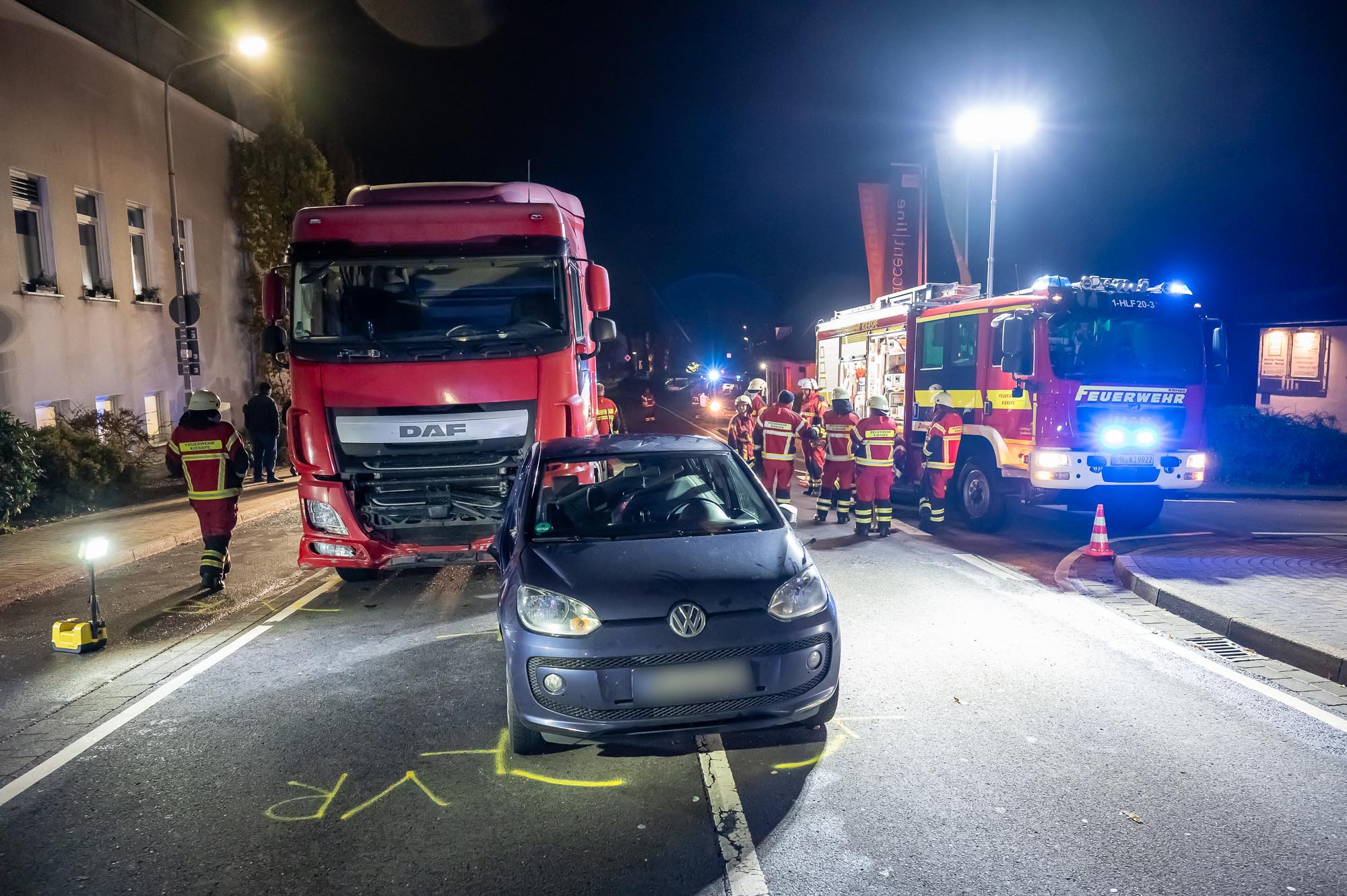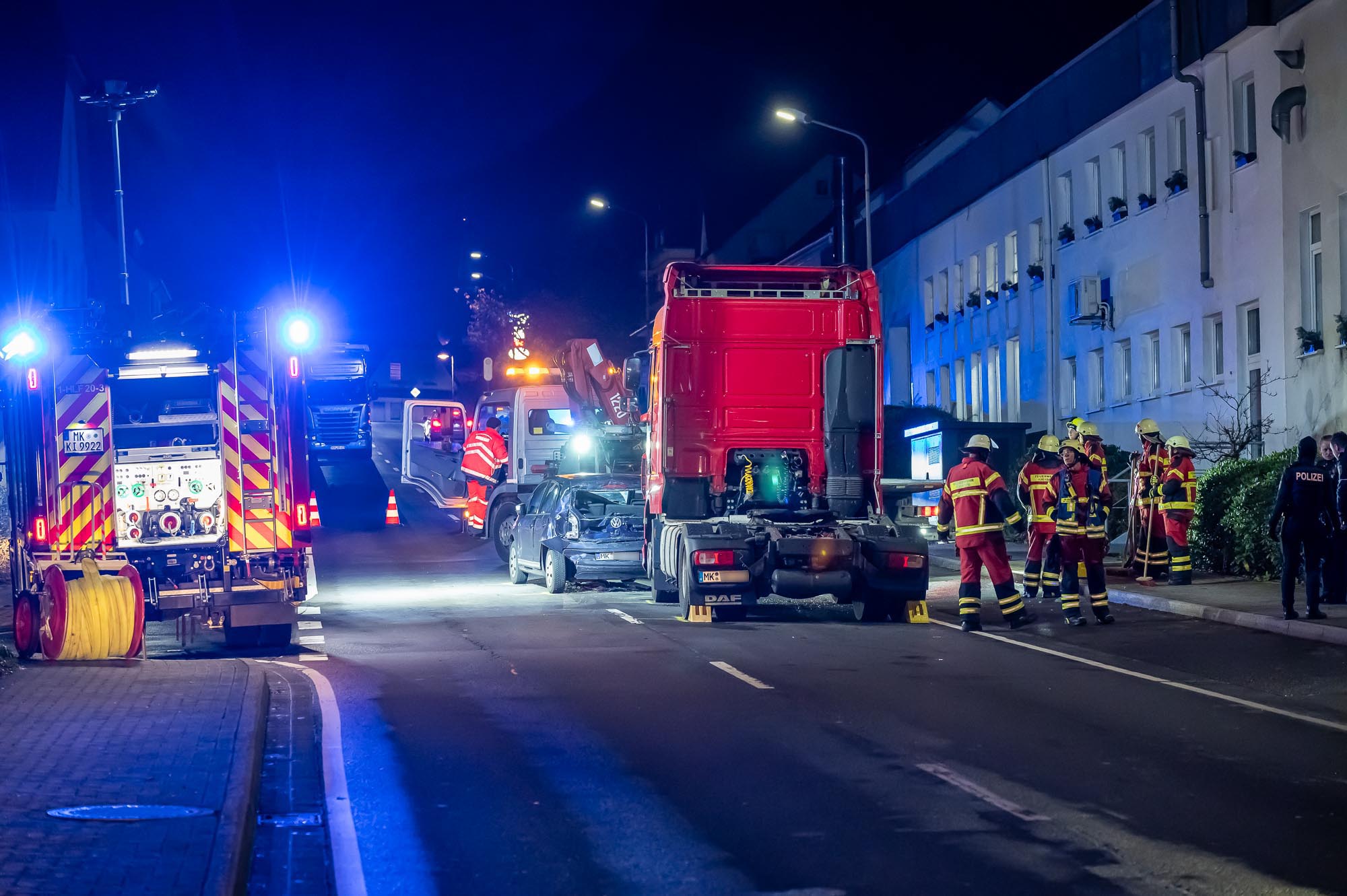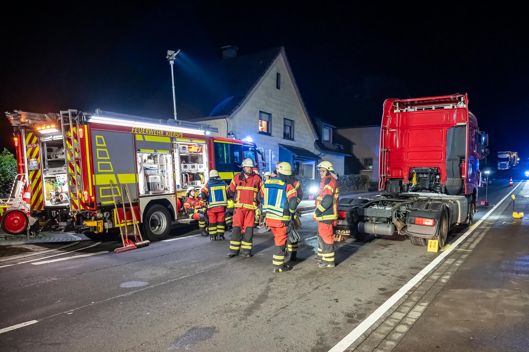 KIERSPE (mk) Die Friedrich-Ebert-Straße musste am frühen Samstagabend, 11. November, in Höhe der Fa. Potthoff für etliche Stunden voll gesperrt werden. Hier hatte sich um 17.30 Uhr ein Auffahrunfall ereignet, der dramatischer war, als man es im Stadtgebiet erwarten würde. Bei dem aufgefahrenen Fahrzeug, handelte es sich um einen Sattelschlepper, glücklicherweise ohne schweren Auflieger. Der hatte einen Kleinwagen von hinten gerammt, dessen Fahrer anhielt, um nach links in die Wiesenstraße abzubiegen.