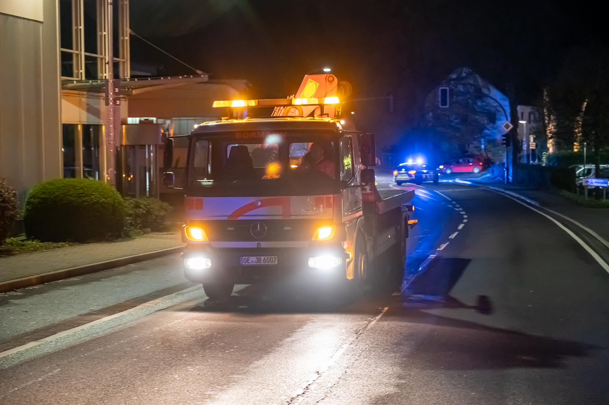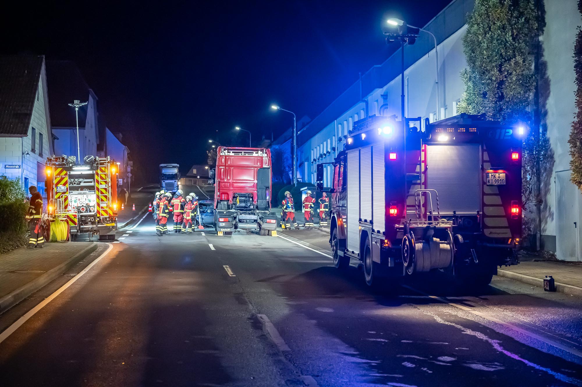 Die Feuerwehr war aufgrund der Alarmierung “TH1 — eingeklemmte Person” in Zugstärke angerückt, ausserdem waren Ehrenamtliche des DRK im Einsatz. Nachdem die beiden Verletzten befreit und dem Rettungsdienst übergeben waren, sicherten die 21 Kräfte des Löschzug 1 noch die Unfallstelle ab und klemmten die Batterie des Kleinwagens ab. Wann die Sperrung aufgehoben werden konnte, war nach Angaben der Polizei vor allem vom Eintreffen der Bergungsfahrzeuge abhängig, zwischenzeitlich sollte der Verkehr zumindest einspurig wieder rollen. Den Sachschaden an dem völlig zerstörten VW sowie dem LKW schätzt die Polizei auf mindestens 15–20.000 Euro. Beide Fahrzeuge hatten Kennzeichen “MK”, der LKW aber ohne die Zulassungssiegel. Gegen 21.30 Uhr konnte die Sperrung komplett aufgehoben werden.