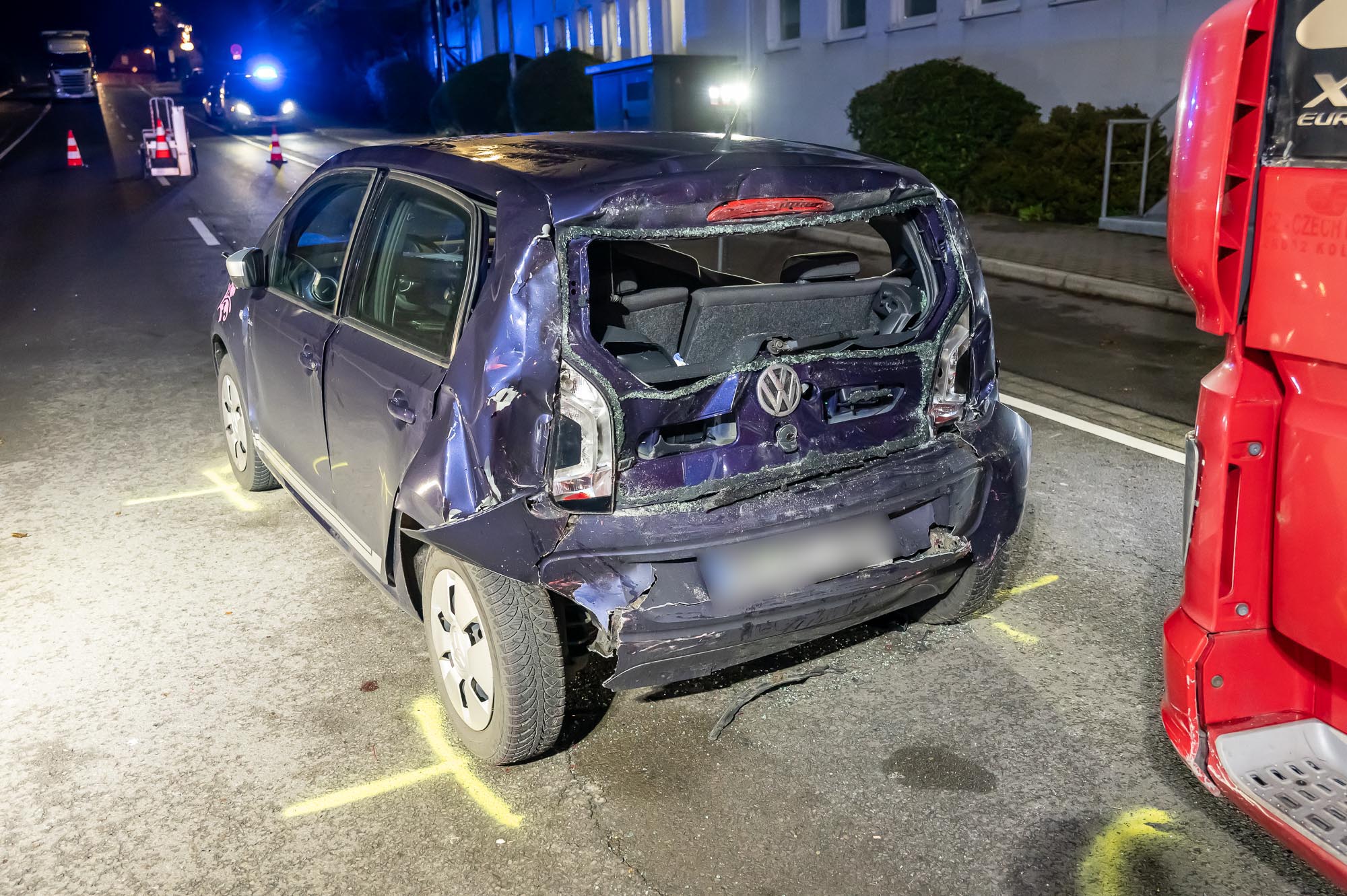 Durch den Aufprall wurde der VW massiv beschädigt. Die Kollision war so stark, dass selbst die Zugmaschine deutlich sichtbar beschädigt wurde. Deren Fahrer, der eindeutige Unfallverursacher, blieb unverletzt. Er und sein Chef haben aber bezüglich des LKW noch ganz andere Probleme. Die Polizei staunte nicht nur wegen des Unfallschadens am der Front des LKW. Relevanter war die Tatsache, dass das Fahrzeug nicht nur abgemeldet war, sondern bereits einen amtlichen Aufkleber an der Seitenscheibe kleben hatte, der zum Abtransport aufforderte. Kurzum: Das Fahrzeug hätte so keinen Millimeter mehr bewegt werden dürfen. Der Fahrer konnte mangels deutscher Sprachkenntnisse nichts Sachdienliches aussagen. Es wird vermutet, dass er den LKW im Auftrag des Besitzers im Schutz der Dunkelheit illegal fortbewegt hat.