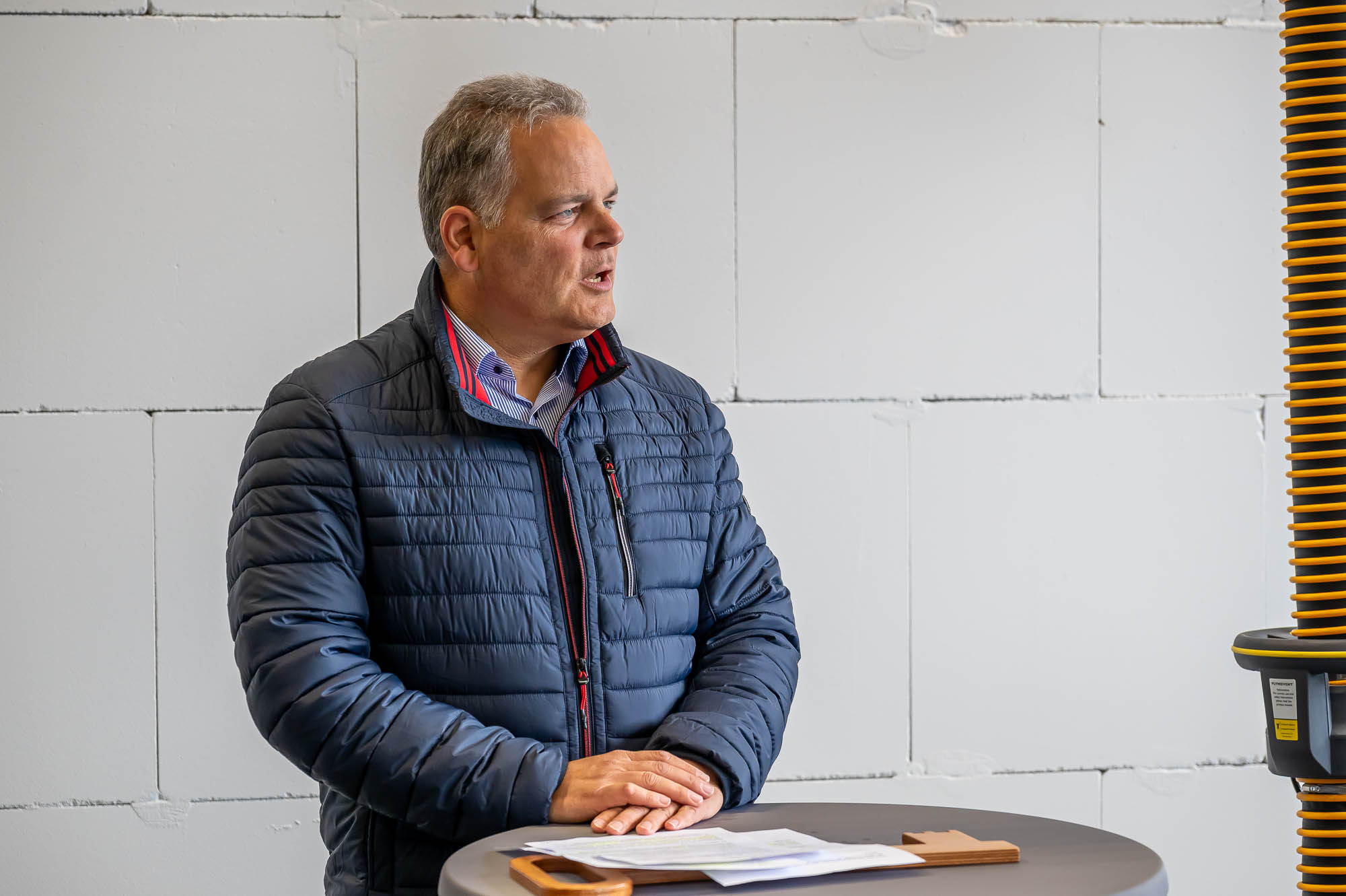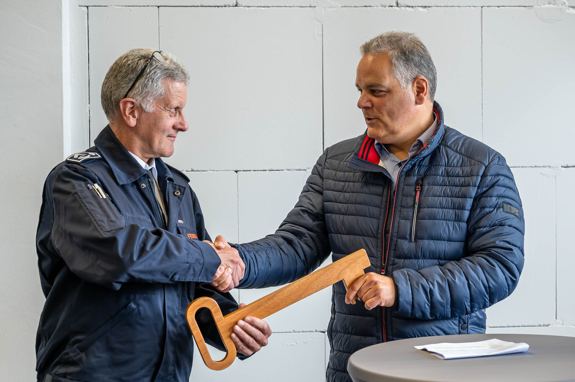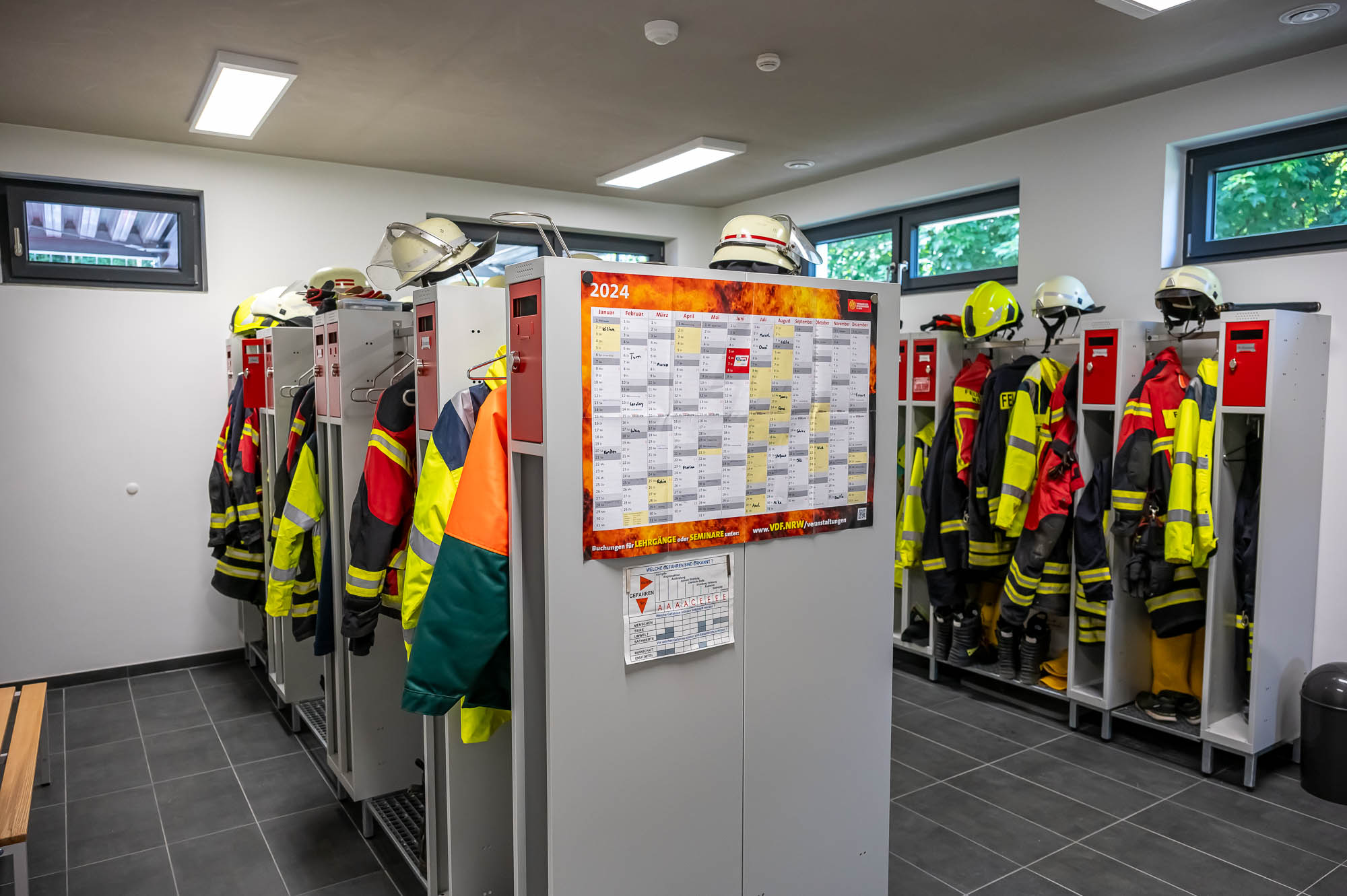 Obgleich die Beteiligten in dem nun eingeweihten Gerätehaus einen zwar attraktiven, aber doch betont funktionalen Zweckbau sehen, ist es dennoch nicht “von der Stange” zu bekommen. Das stellt Olaf Stelse in seiner Ansprache klar: “Mehr als 50 Ausschreibungen und Auftragsvergaben sind durchgeführt worden, um das Gebäude errichten und ausstatten zu können”, so der Kiersper Bürgermeister. Das ist auch der Tatsache geschuldet, dass die Technik im neuen Gebäude umfangreich und auf aktuellem Stand ist. Stolz ist man unter anderem auf die Photovoltaik-Anlage samt Speicher, mit der voraussichtlich rund 80% des eigenen Strombedarfs gedeckt werden sollen. Diese, und auch die Alarmanlage und manches andere System würde sicher auch in gewöhnlichen Gewerbeneubauten einziehen, nicht aber eine Stromeinspeisung, mit der das Gerätehaus im Falle eines Energie-Blackouts zur erleuchteten Anlaufstelle für Bürgerinnen und Bürger wird. Solche, mittlerweile notwenigen, Technologien haben ihren Preis: Die Baukosten für das Gebäude mit einer Nutzfläche von 440 Quadratmeter betrugen nach aktuellem Stand rund 1.850.000 Euro. Abgefedert wurde dieser Betrag durch eine Förderung des Landes NRW in Höhe von 250.000 Euro, ausserdem gab es einen Zuschuss von 37.500 Euro für die PV-Anlage.