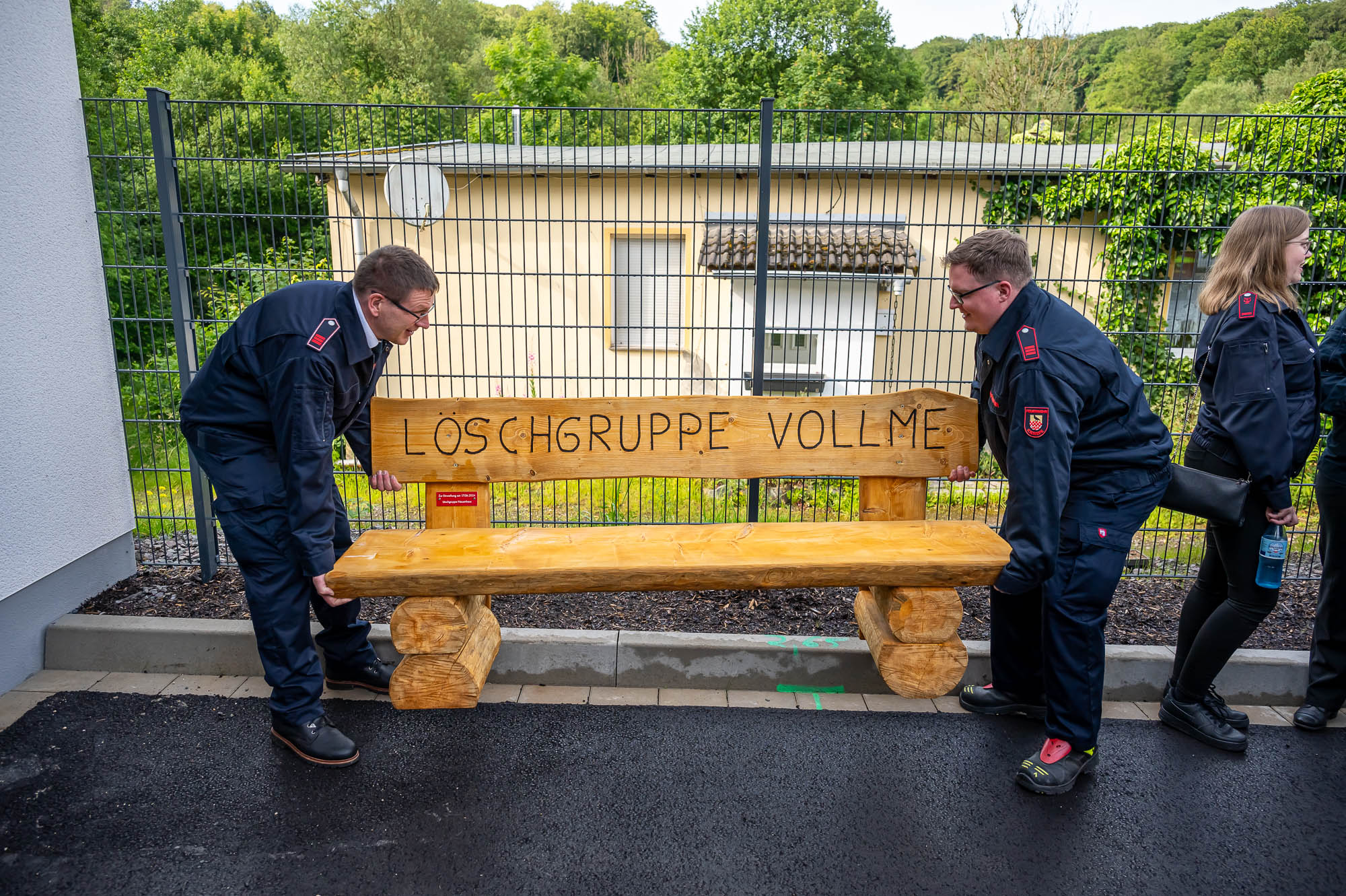 Nun durfte die Löschgruppe Vollme erstmal durchatmen: Nach der Schlüsselübergabe bekam auch eine massive Holzbank ihren neuen Stellplatz zugewiesen, Vertreter aller Fraktionen überreichten ein gemeinsames “Flachgeschenk”, um die Arbeit der Feuerwehr zu unterstützen. Bei Kaltgetränken und einem Imbiss wurde gefeiert, der Spielmannszug sorgte für die musikalische Begleitung. Währenddessen war Karsten Gembruch damit beschäftigt, den interessierten Gästen nicht nur die Halle für zwei große Feuerwehrzeuge zu zeigen, sondern auch die hochmodernen Sozial- und Schulungsräume. Diese waren neben den Sanitär- und Umkleidebereichen eine wesentliche Achillesferse des alten Gebäudes. Damit ist nun Schluss!