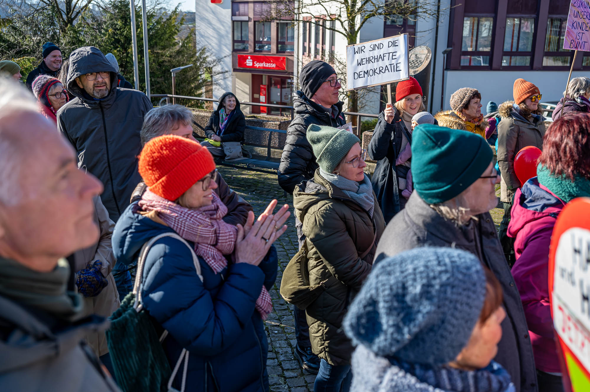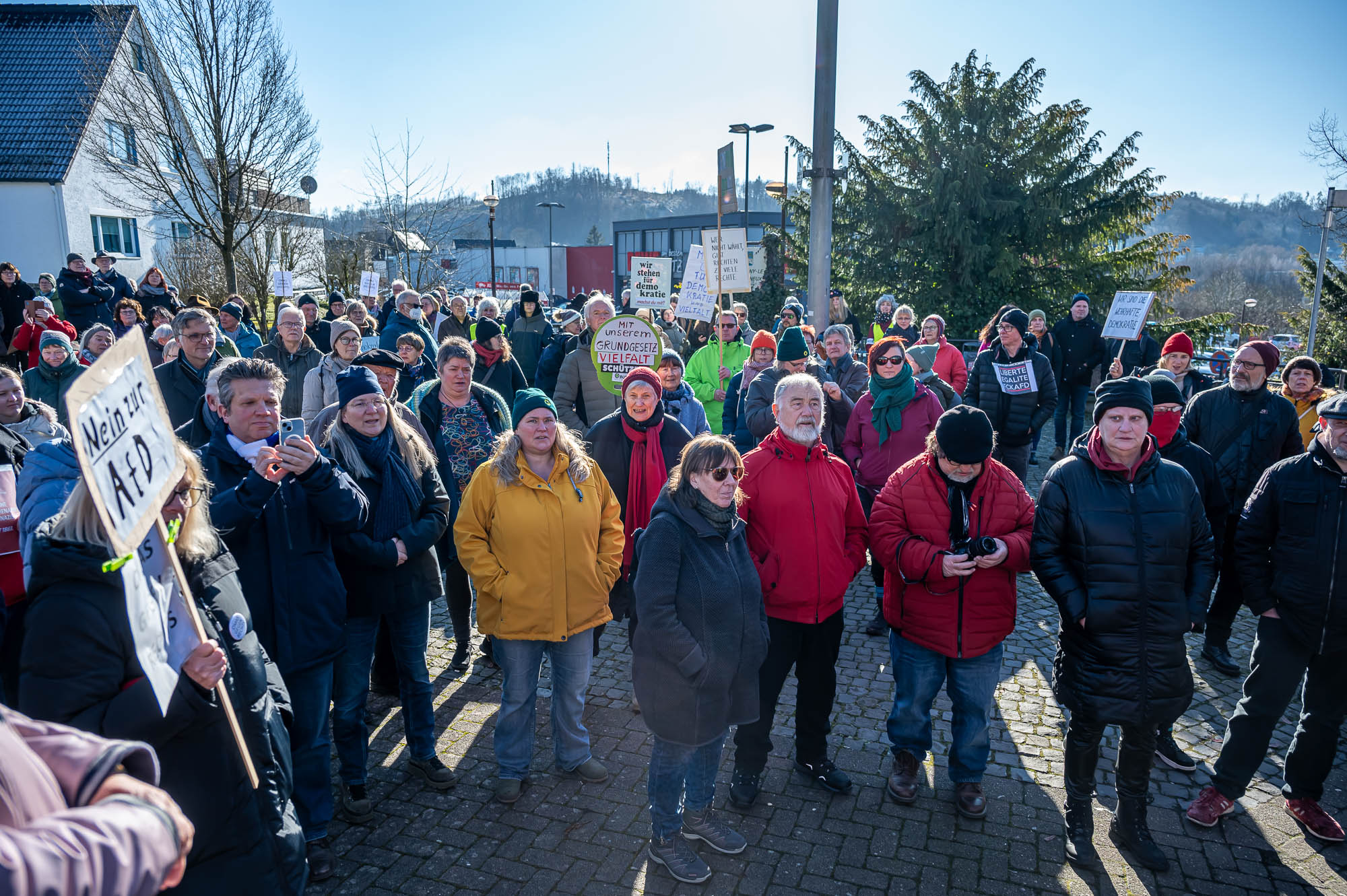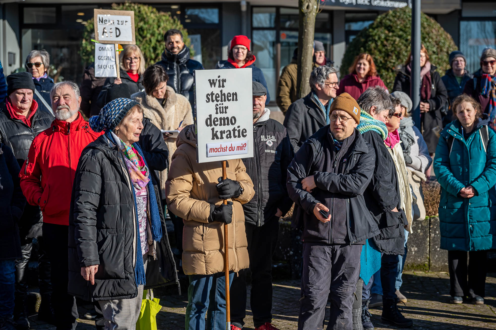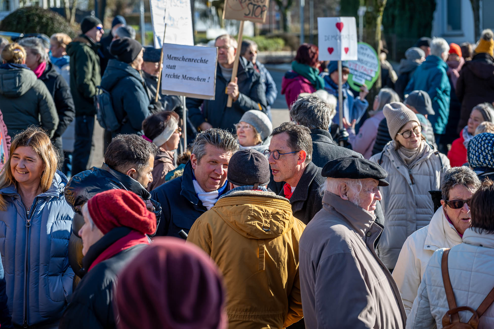 KIERSPE (mk) War es das sonnige Winterwetter, dass im Kontrast zum Regen bei der Auftaktveranstaltung in der Woche zuvor, mehr Menschen auf den Montigny-Platz gelockt hat? Oder haben die Teilnehmer die die Aufforderung von Organisator Wolfgang Koll beherzigt und jeweils noch eine weitere Person für die Mahnwache am Samstagmittag, 1. Februar, motiviert? Jedenfalls war Zahl derer, die die Gelegenheit nutzen, sich für Demokratie und Vielfalt einzusetzen, fast doppelt so hoch wie in der Woche zuvor. Die Schätzungen gehen an beiden Veranstaltungen auseinander, aber die Polizei geht von 200 Menschen aus.