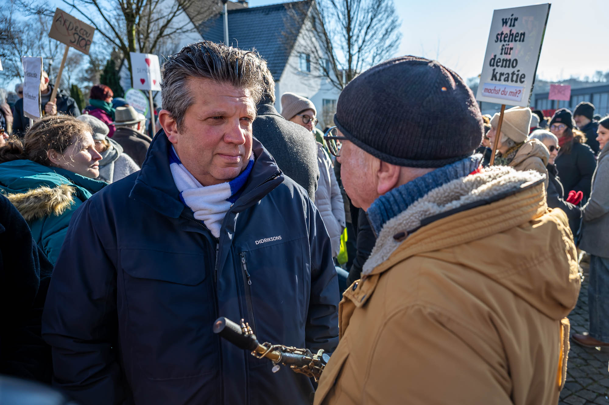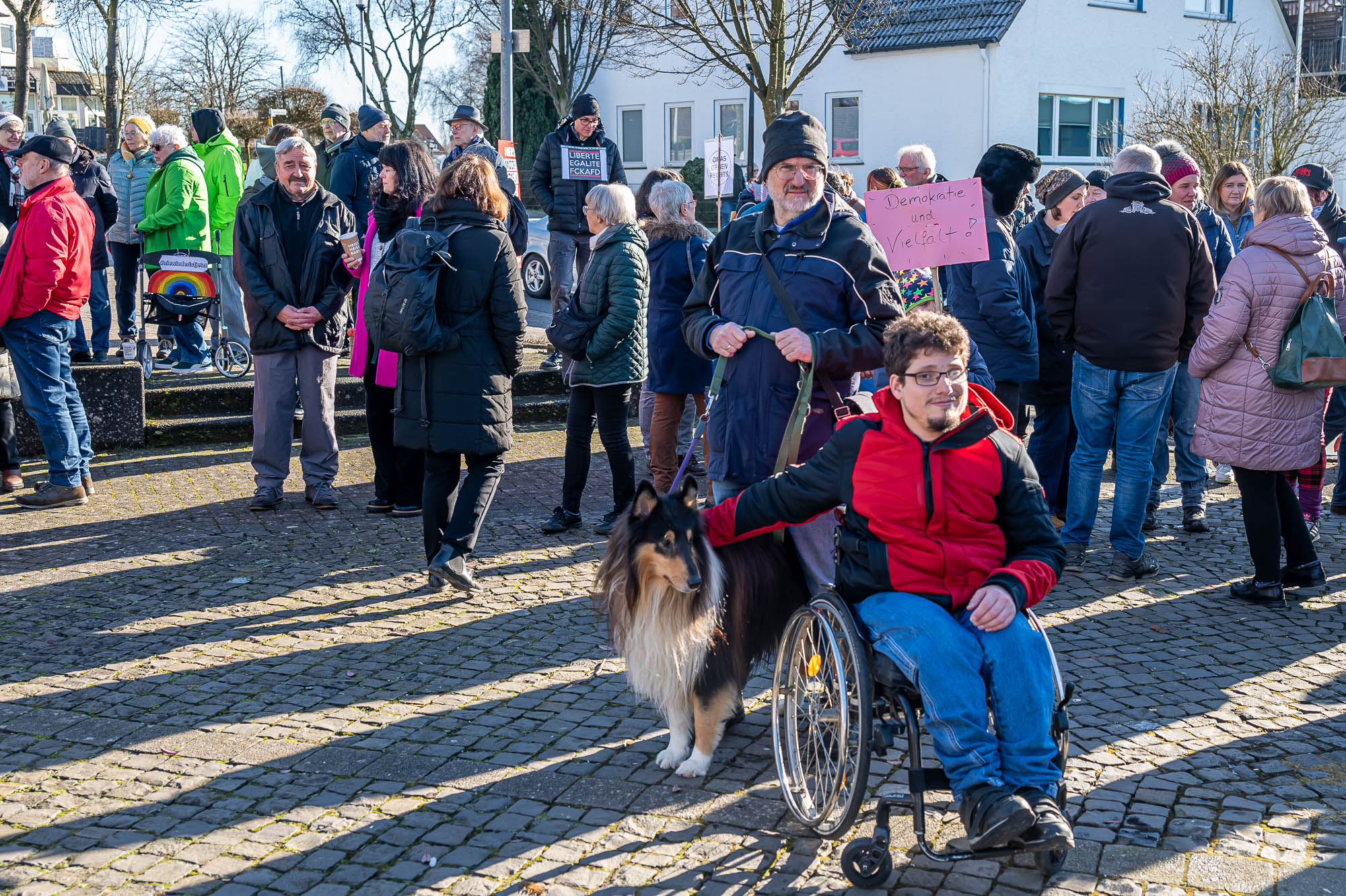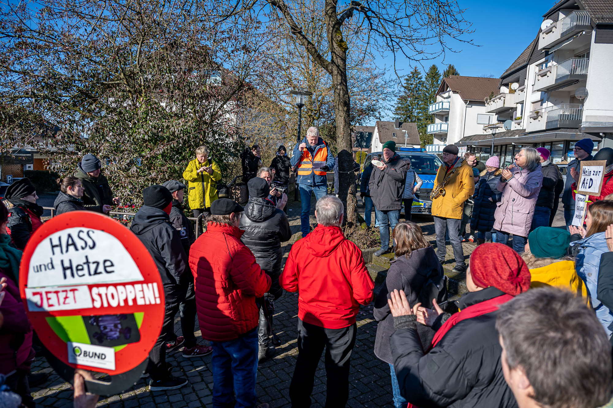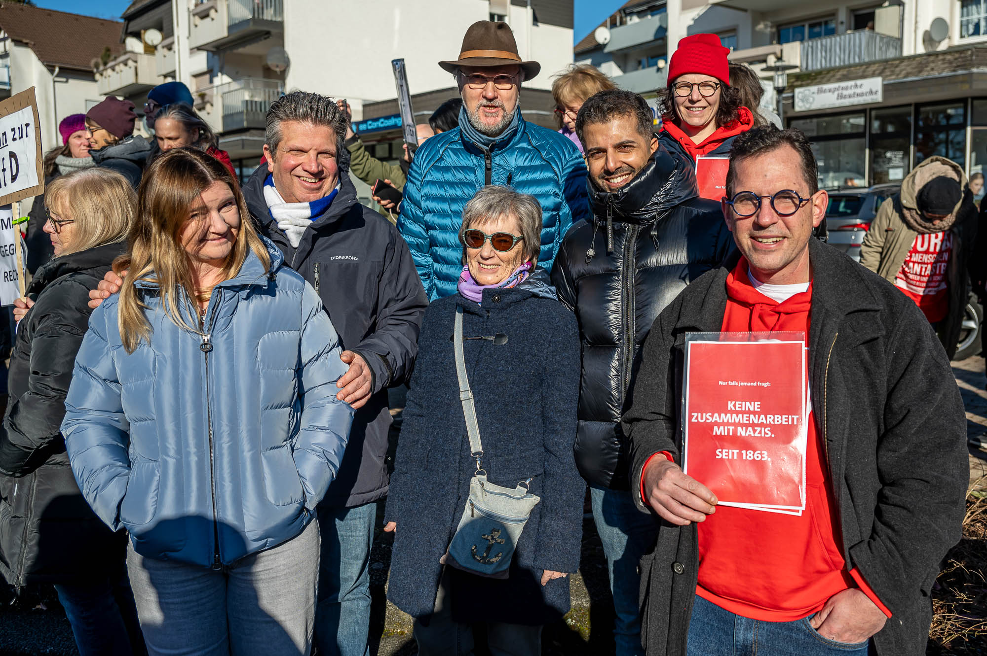 KIERSPE (mk) War es das sonnige Winterwetter, dass im Kontrast zum Regen bei der Auftaktveranstaltung in der Woche zuvor, mehr Menschen auf den Montigny-Platz gelockt hat? Oder haben die Teilnehmer die die Aufforderung von Organisator Wolfgang Koll beherzigt und jeweils noch eine weitere Person für die Mahnwache am Samstagmittag, 1. Februar, motiviert? Jedenfalls war Zahl derer, die die Gelegenheit nutzen, sich für Demokratie und Vielfalt einzusetzen, fast doppelt so hoch wie in der Woche zuvor. Die Schätzungen gehen an beiden Veranstaltungen auseinander, aber die Polizei geht von 200 Menschen aus.