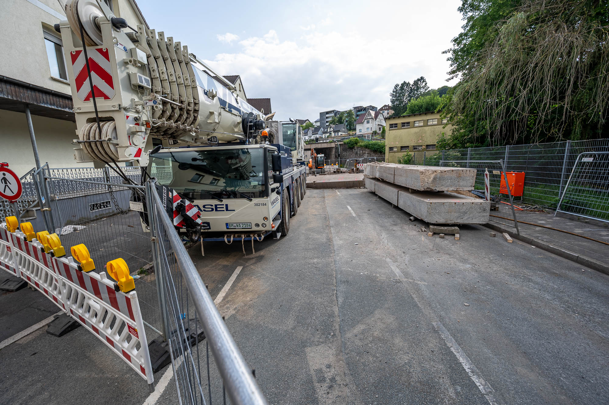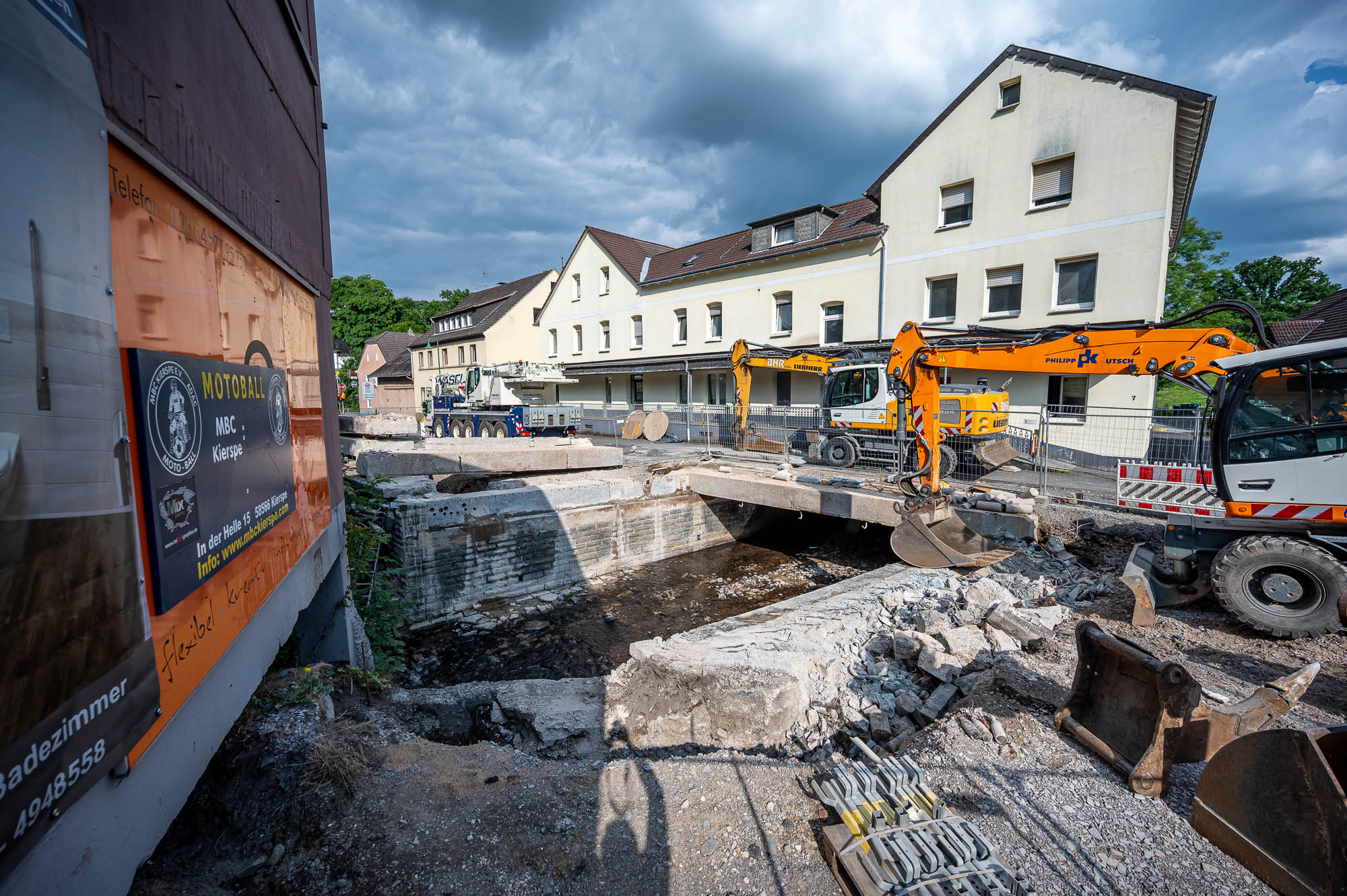 KIERSPE (mk) Die Bewohner des angrenzenden Mehrfamilienhauses haben nun einen direkten Blick auf das Wasser, obgleich sich dieser nicht so idyllisch gestaltet, wie er in Reiseprospekten gerne beschrieben wird. Für die Baustelle selbst darf der Montag, 16. Juni, als wichtiger Meilenstein im Kalender angekreuzt werden. Schon in den Morgenstunden wurde ein großer Autokran in Stellung gebracht, mit dem tonnenschwere Betonteile des Brückenbauwerkes auf die Lademulde eines bereitstehenden Sattelschleppers verladen wurden. Der Kran ist noch da, noch einige Meter trennen die Abrisskante vom Fußweg vor dem Haus. Augenscheinlich erfolgen kurzfristig, vermutlich am darauffolgenden Dienstag weitere Demontage-Arbeiten, womit der Brücke endgültig der Garaus gemacht wird. Für die Anwohner würde damit auch eine Phase mit besonders hoher Lärmbelastung zu Ende gehen, immerhin wurde seitens der Bauleitung auch versprochen, dass der Wiederaufbau der Brücke deutlich leiser ablaufen gehen wird.