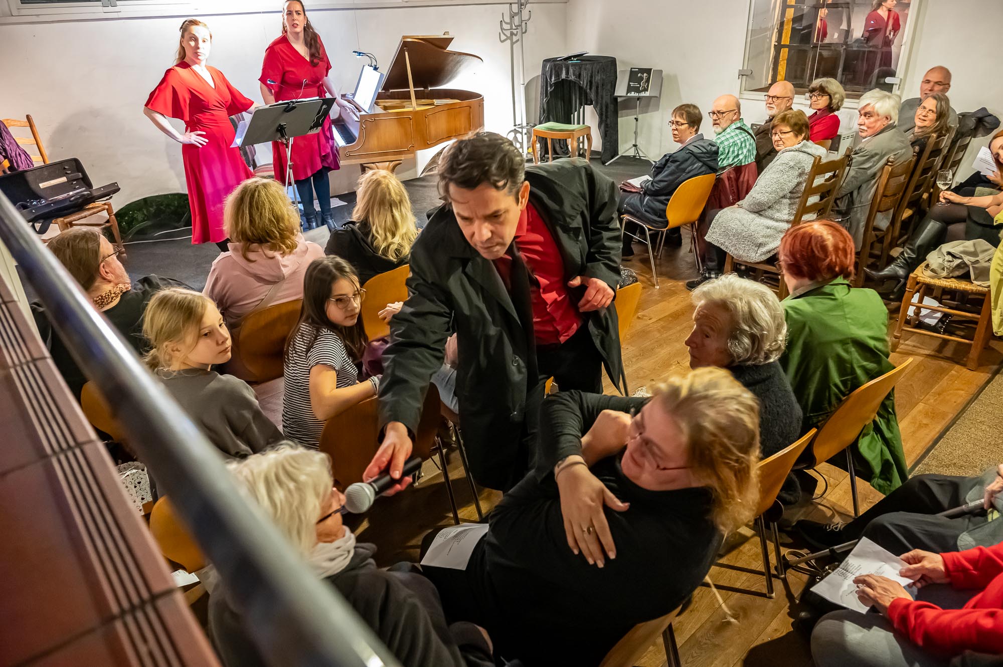 Wer eigentlich wegen der Musik in die Brennerei gekommen war, wurde nicht enttäuscht, denn das Programm war von entsprechenden Einlagen gespickt. Dabei entführte Juri Tetzlaff die Zuhörer zunächst in die Geschichte des Tangos, das imaginäre Ambiente argentinischer Hafen-Bordelle. Orte, über die er in seinem Hauptjob als Fernseh-Moderator im Kinderprogramm sicherlich nicht berichtet. In der Brennerei diente dies vor allem dazu, die Lebensläufe der Darsteller zu erklären. Die lagen den Besuchern, (oder besser gesagt: Teilnehmern) sogar schriftlich vor, und waren Teil der kriminalistischen Knobelaufgaben.