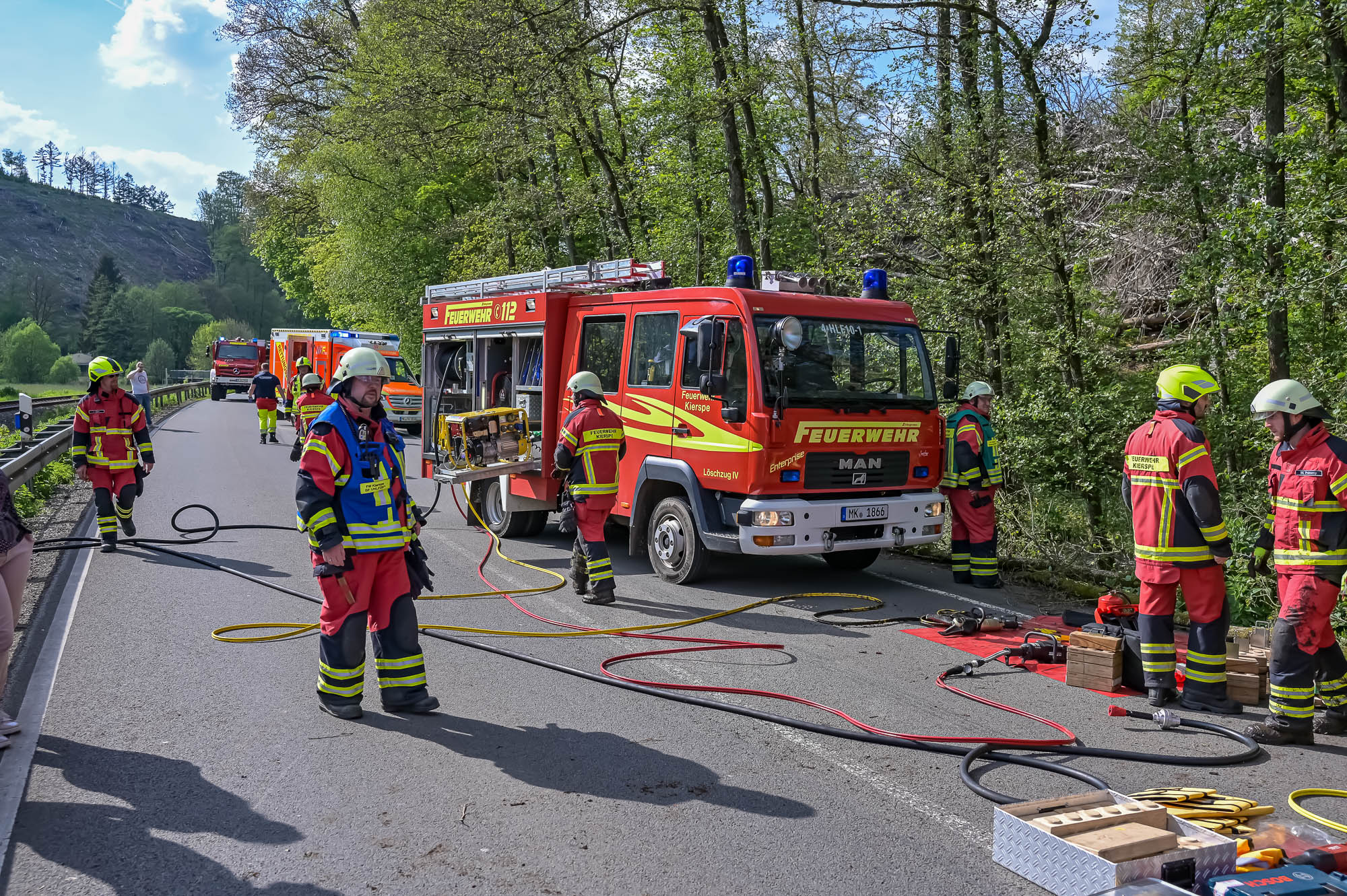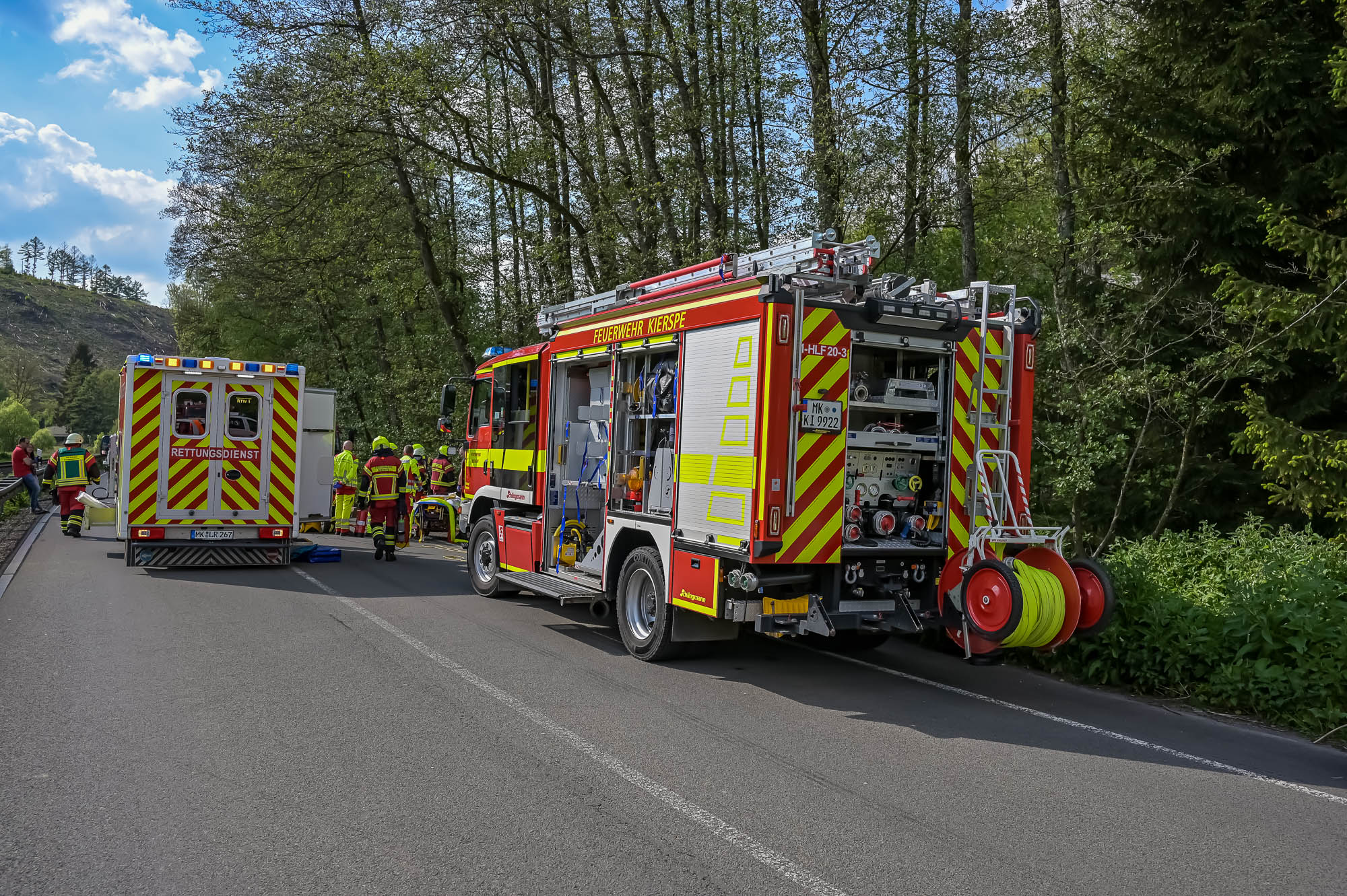 Nach Angaben der Feuerwehr kamen beide Unfallbeteiligten mit Rettungswagen ins Krankenhaus, wo sie aber nicht stationär verbleiben mussten. Die Bundesstraße blieb für rund eineinhalb Stunden voll gesperrt, gegen 19.30 Uhr war auch die Bergung der beiden Unfallfahrzeuge abgeschlossen. Der Mercedes wurde spätestens durch die Rettungsmaßnahmen völlig zerstört, der VW Golf III dürfte alleine schon wegen seines Alters einen Totalschaden erlitten haben. Die Polizei geht mittlerweile von einem internistischen Notfall aus Auslöser für das Fahrmanöver der Seniorin aus. Seitens der Feuerwehr waren mehr als 25 Kräfte der Löschzüge Neuenhaus / Vollme sowie des Innenstadtlöschzuges im Einsatz. Ausserdem der Rettungsdienst und Ehrenamtliche der Kiersper DRK-Ortsgruppe, die zufällig an der Unfallstelle vorbeigekommen waren