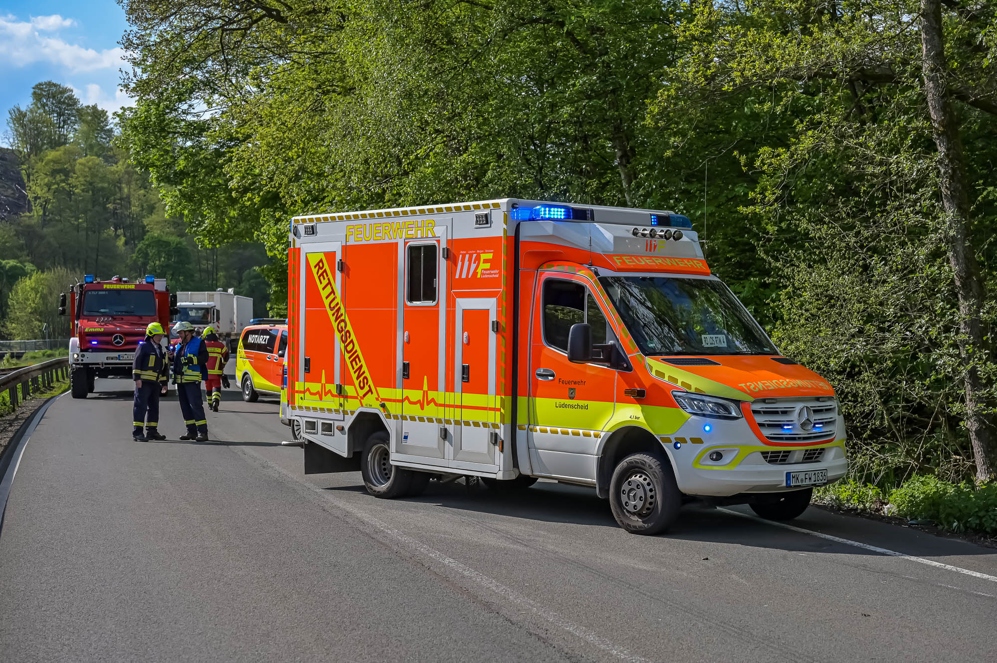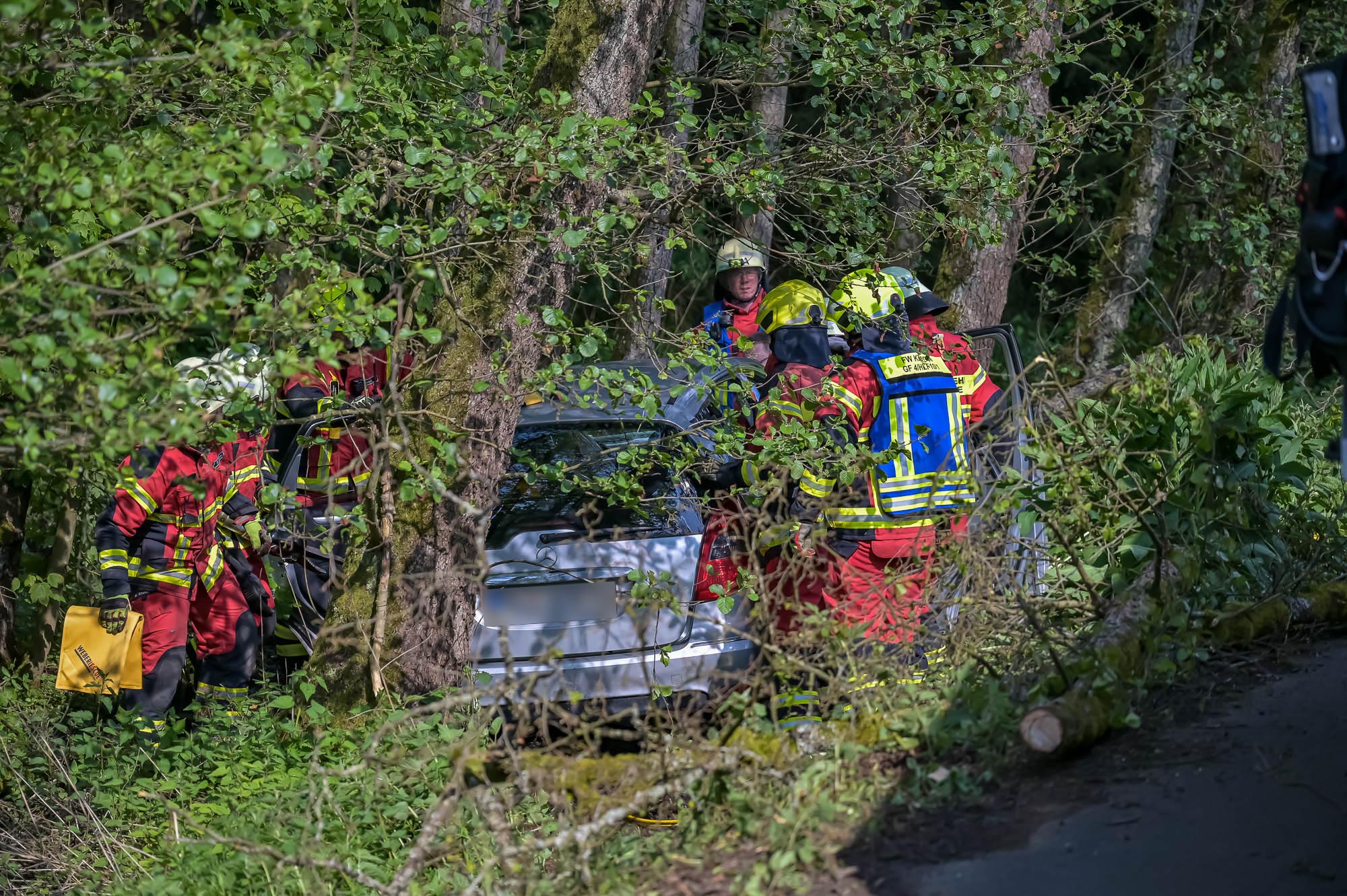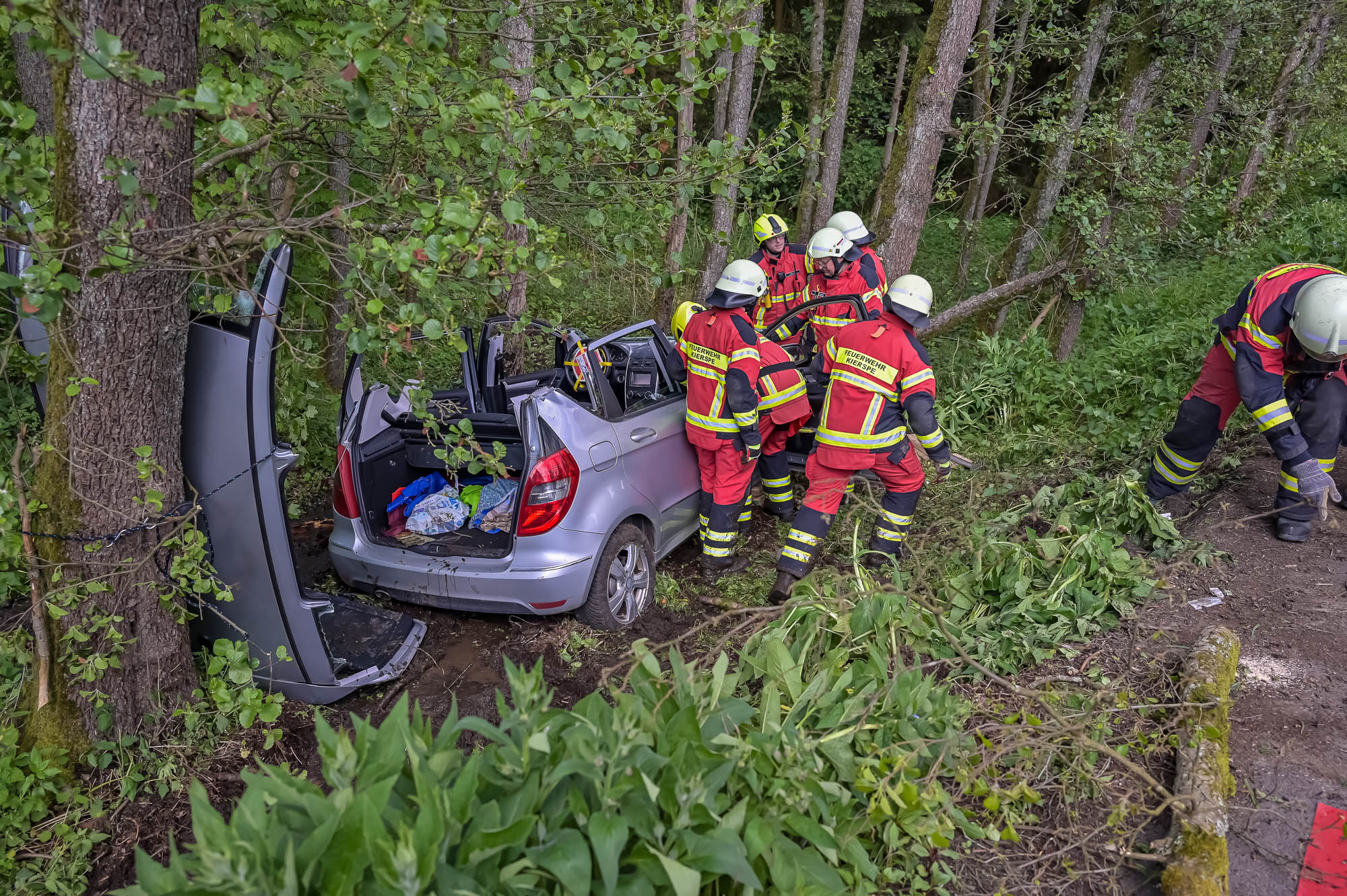 Besonders für sie wurde die Feuerwehr alarmiert, weil zunächst befürchtet wurde, sie könnte in ihrer A‑Klasse eingeklemmt und möglicherweise schwerverletzt sein. Das bewahrheitete sich zum Glück nicht. Die Fahrertür ließ sich allerdings nicht öffnen, weil ein Baum im Weg war. Der Feuerwehr blieb daher nichts anderes übrig, als nach dem Schema einer “Patientenorientierten Rettung” vorzugehen und mit schwerem Gerät das Dach abzutrennen. Die aus Iserlohn stammende Seniorin blieb die ganze Zeit über ansprechbar, ausserdem lagen keine konkreten Hinweise auf schwere Verletzungen vor. Das hat sich dann auch bewahrheitet, nachdem sie aus dem Unfallwrack befreit und dem Rettungsdienst übergeben werden konnte.