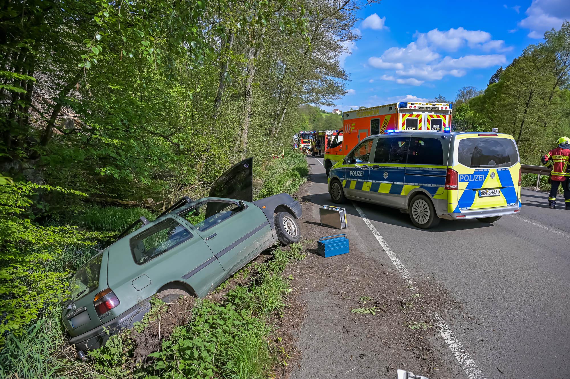 KIERSPE (mk) Für die beteiligten Autofahrer ging diese Frontalkollision bei Weitem nicht so dramatisch aus, wie es zunächst aussah. Der Unfall ereignete sich am Samstag, 11. Mai, spätnachmittags auf der B54 in Höhe Grünbaum: Gegen 16.25 Uhr befuhr ein 56 Jahre alter Mann die Bundesstraße in Richtung Lüdenscheid, als ihm plötzlich ein Mercedes mit mäßiger Geschwindigkeit entgegen der Fahrtrichtung auf seine Spur geriet. Alle Versuche, den Unfall zu verhindern, scheiterten, und beide Autos wurden durch die Wucht des Zusammenpralls in die Böschung geschleudert. Der 56-jähre konnte sich noch leichtverletzt aus seinem VW Golf befreien. Nicht so die 77 Jahre alte Unfallverursacherin.