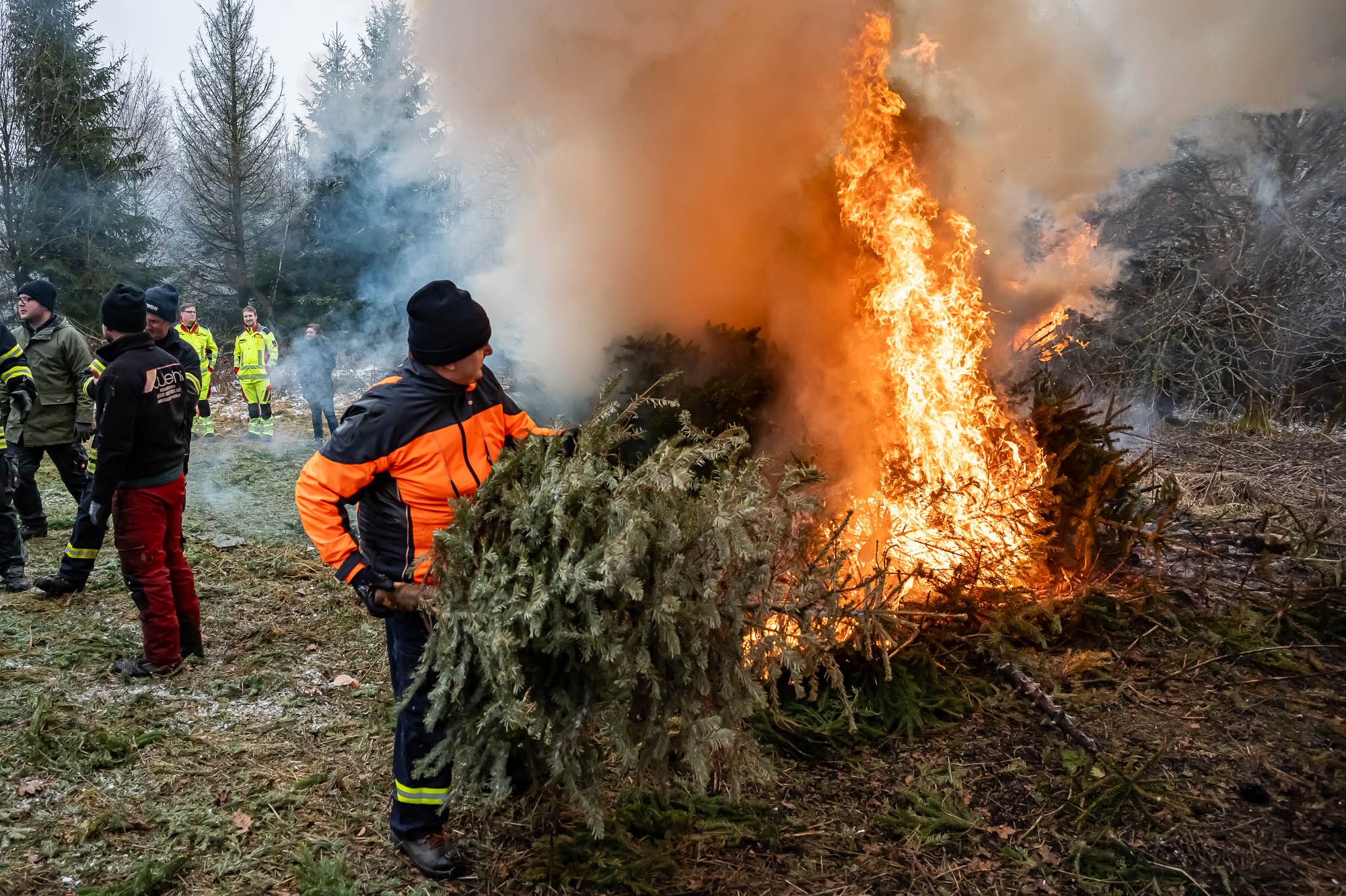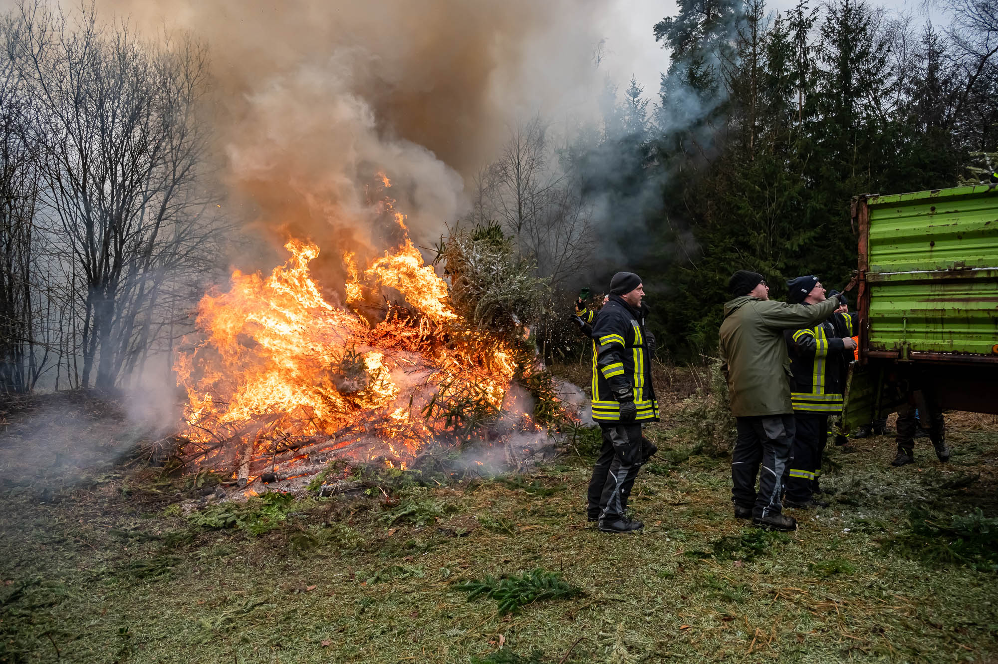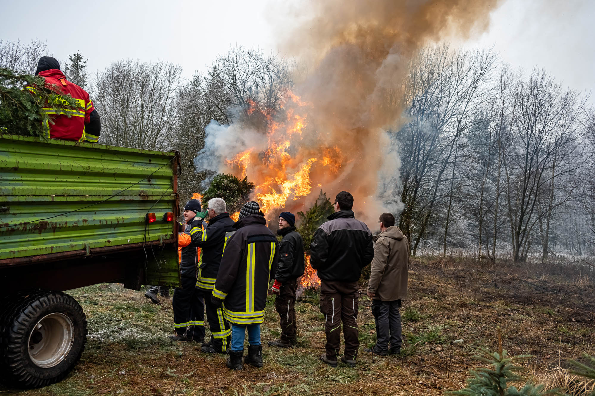 Und der hat beim Einsammeln der ausrangierten Christbäume kräftig angepackt. Alle Fahrzeuge, darunter Lieferwagen heimischer Firmen, mehrerer Treckergespanne sowie auch diesmal wieder einem Team von der Halveraner Ortsverband des Technischen Hilfswerks, mussten mehrere Touren fahren. Traditionell wurden die Bäume größtenteils noch am selben Tag verbrannt. Dazu wurden die vollen Fahrzeuge an einem Sammelplatz in Berken entladen, wo die ehemals festlich geschmückten Tannen und Fichten gleich den Flammen übergeben wurden. Dabei kam fast schon Osterfeuerstimmung auf, ein Teil der Bäume wurde auch für Osterfeuer abgezweigt.