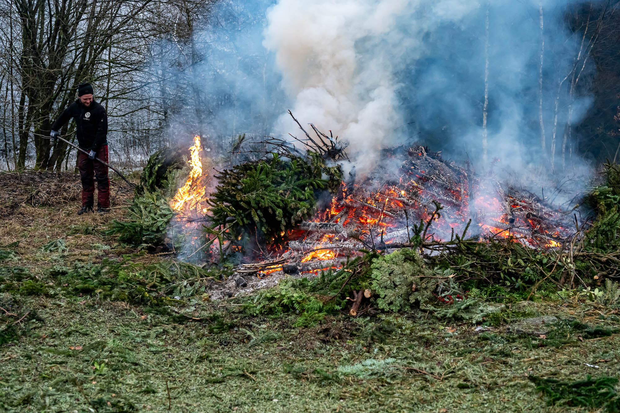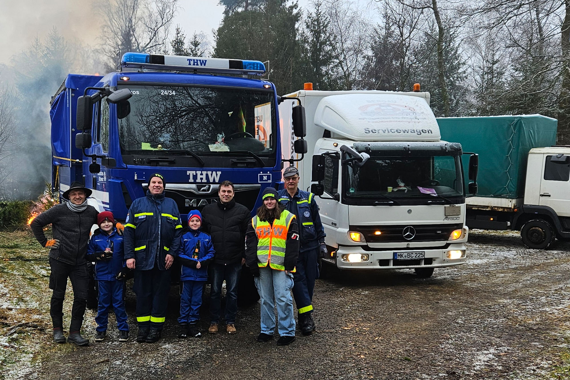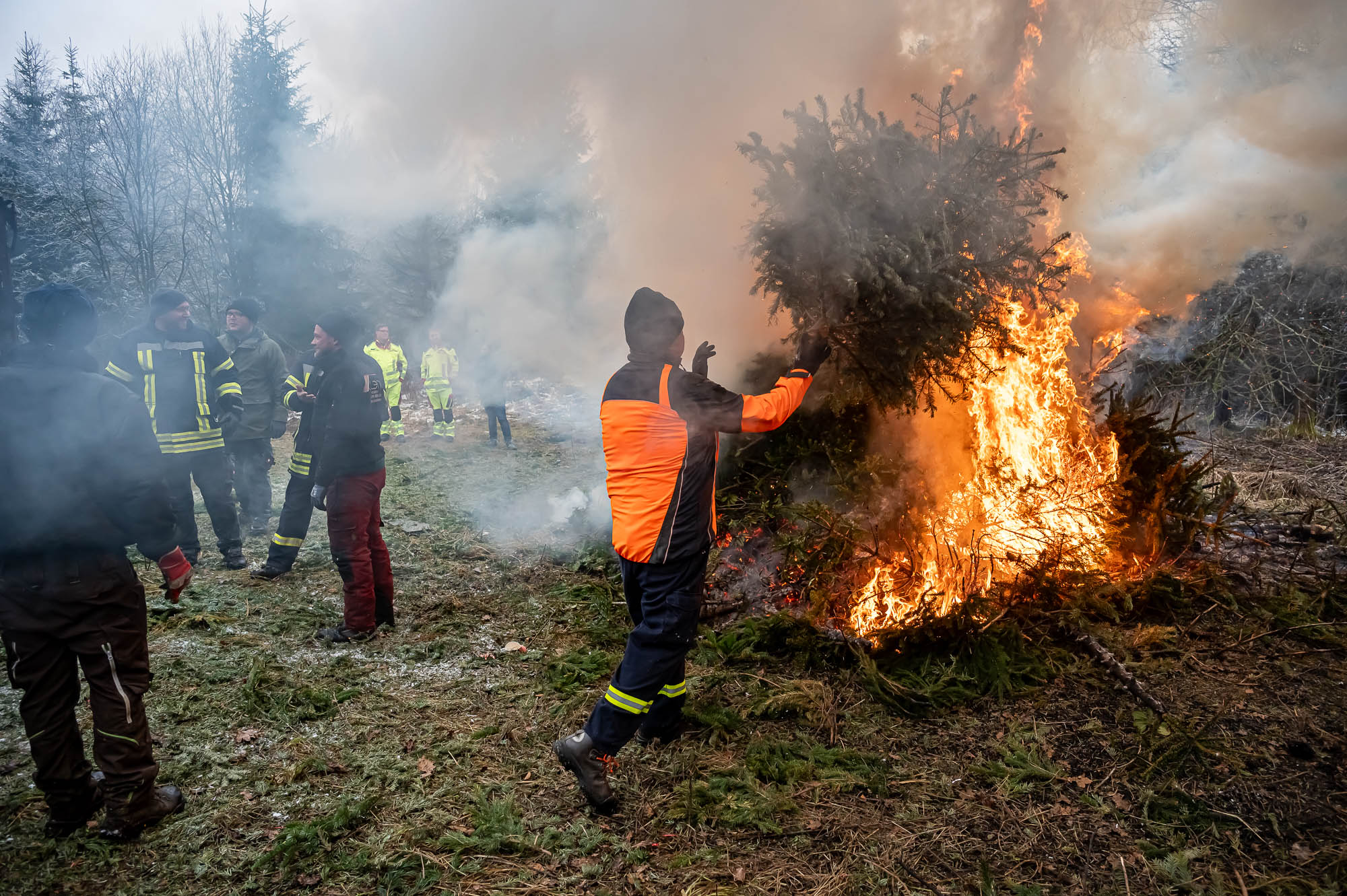Und der hat beim Einsammeln der ausrangierten Christbäume kräftig angepackt. Alle Fahrzeuge, darunter Lieferwagen heimischer Firmen, mehrerer Treckergespanne sowie auch diesmal wieder einem Team von der Halveraner Ortsverband des Technischen Hilfswerks, mussten mehrere Touren fahren. Traditionell wurden die Bäume größtenteils noch am selben Tag verbrannt. Dazu wurden die vollen Fahrzeuge an einem Sammelplatz in Berken entladen, wo die ehemals festlich geschmückten Tannen und Fichten gleich den Flammen übergeben wurden. Dabei kam fast schon Osterfeuerstimmung auf, ein Teil der Bäume wurde auch für Osterfeuer abgezweigt.