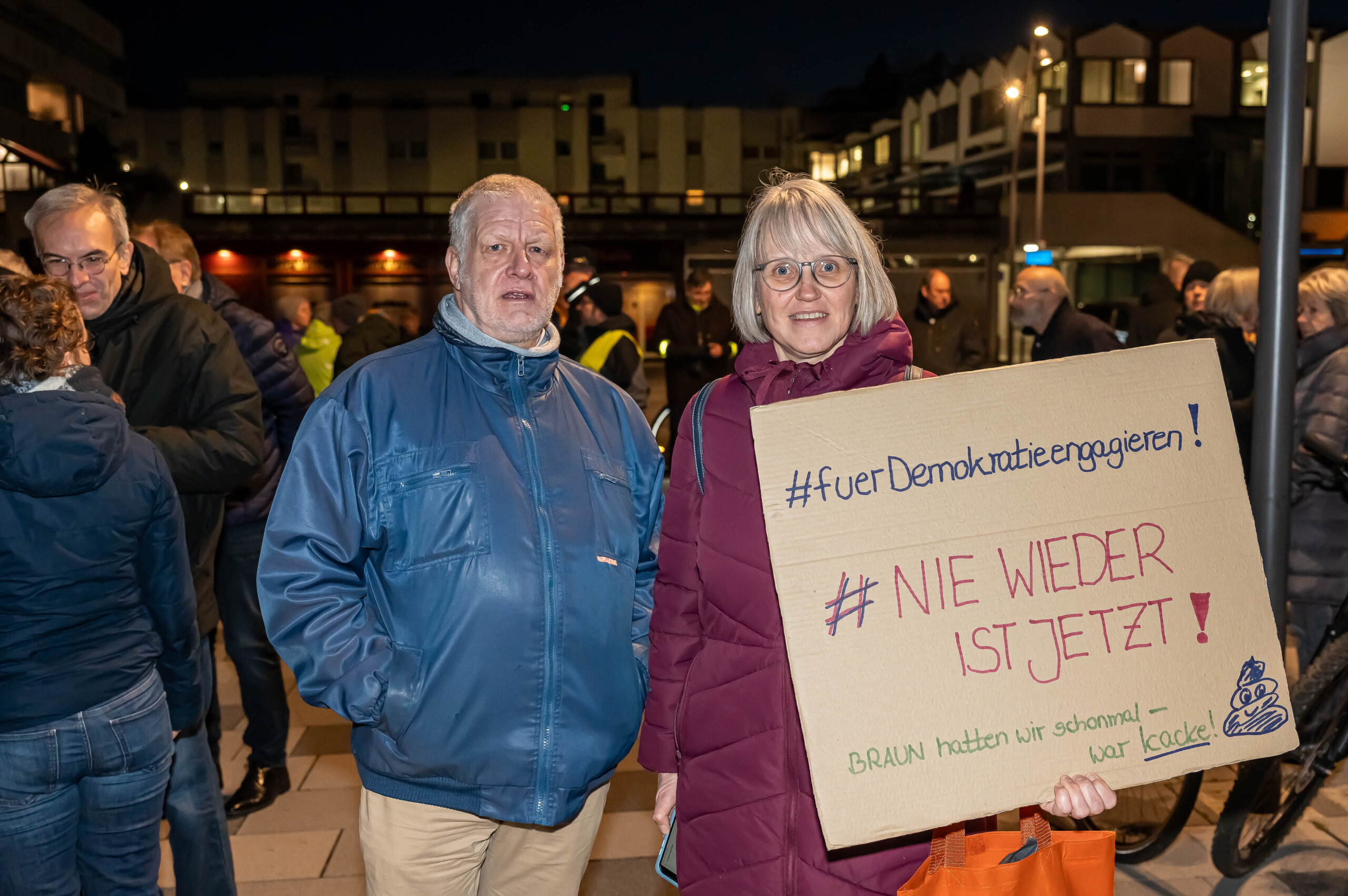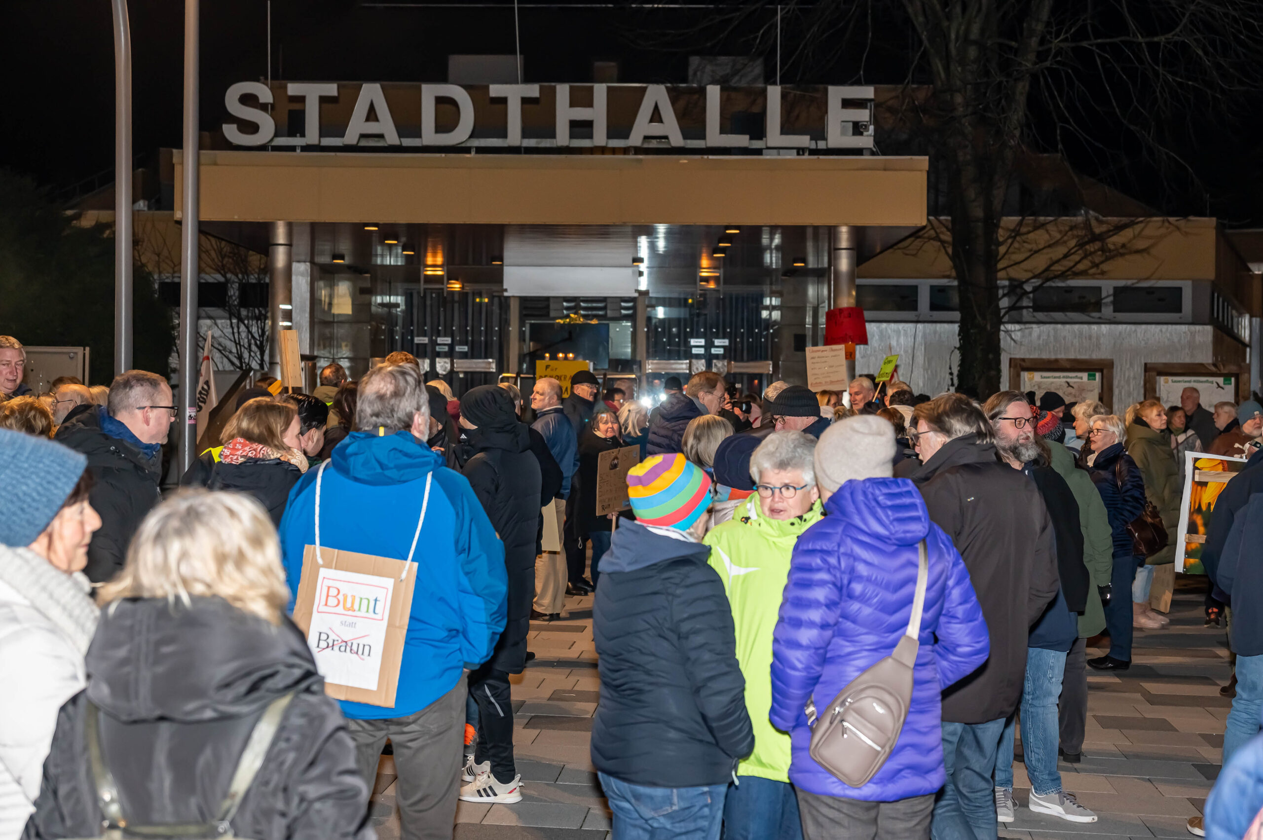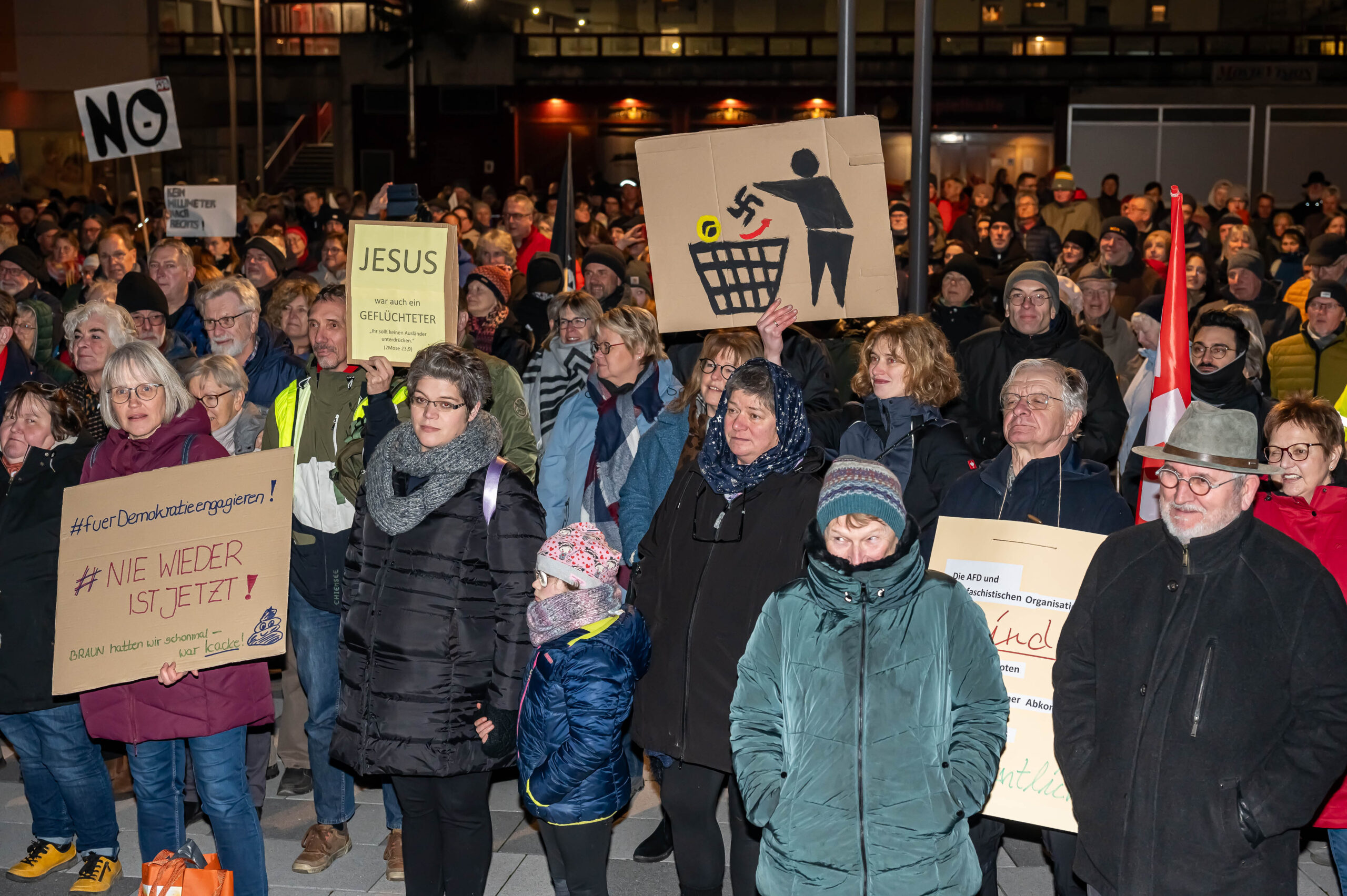 MEINERZHAGEN (mk) Es könnten sogar deutlich mehr Teilnehmer gewesen sein, doch Mit-Organisator Rolf Puschkarsky und die begleitenden Polizisten kamen nach der Mahnwache am Donnerstag, 1. Februar auf dem Otto-Fuchs-Platz übereinstimmend auf diese Zahl. Ohnehin übertrifft diese die Erwartungen, und der Platz vor der Meinerzhagener Stadthalle war voll. Mit jungen Menschen, sogar Kindern, aber zum großen Teil auch mit Menschen, deren Eltern das Dritte Reich hautnah miterlebt haben. Menschen, die den derzeitigen Rechts-Ruck der Gesellschaft und den immer offener gezeigte faschistische Haltung nicht für möglich gehalten hätten.