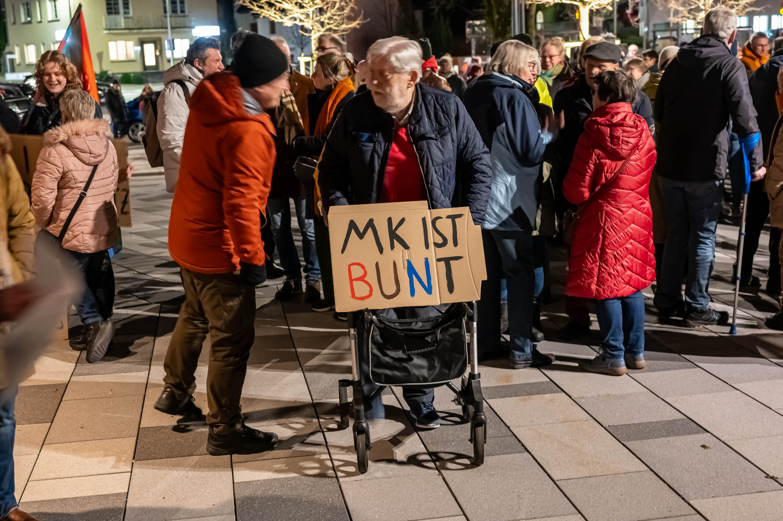 Obgleich dies nach den Worten von Puschkarsky keine parteipolitische Veranstaltung sein sollte, erklärte Matthias Scholand (CDU Meinerzhagen), man müsse auch Ursachen für die aktuelle Lage fragen: “Wenn bessere Politik gemacht würde, dann ständen wir nicht hier.” Diese Aussage kann selbstkritisch verstanden werden, möglicherweise aber auch als Seitenhieb auf die Regierungsparteien in Bundestag. Dass nicht wenige Menschen in Deutschland mit der Politik der Bundesregierung unzufrieden sind, ist kein Geheimnis. Unter den Demonstranten dürfte aber Einigkeit geherrscht haben, dass dies kein Anlass sein darf, extreme Parteien zu wählen und dem Faschismus Türen zu öffnen.