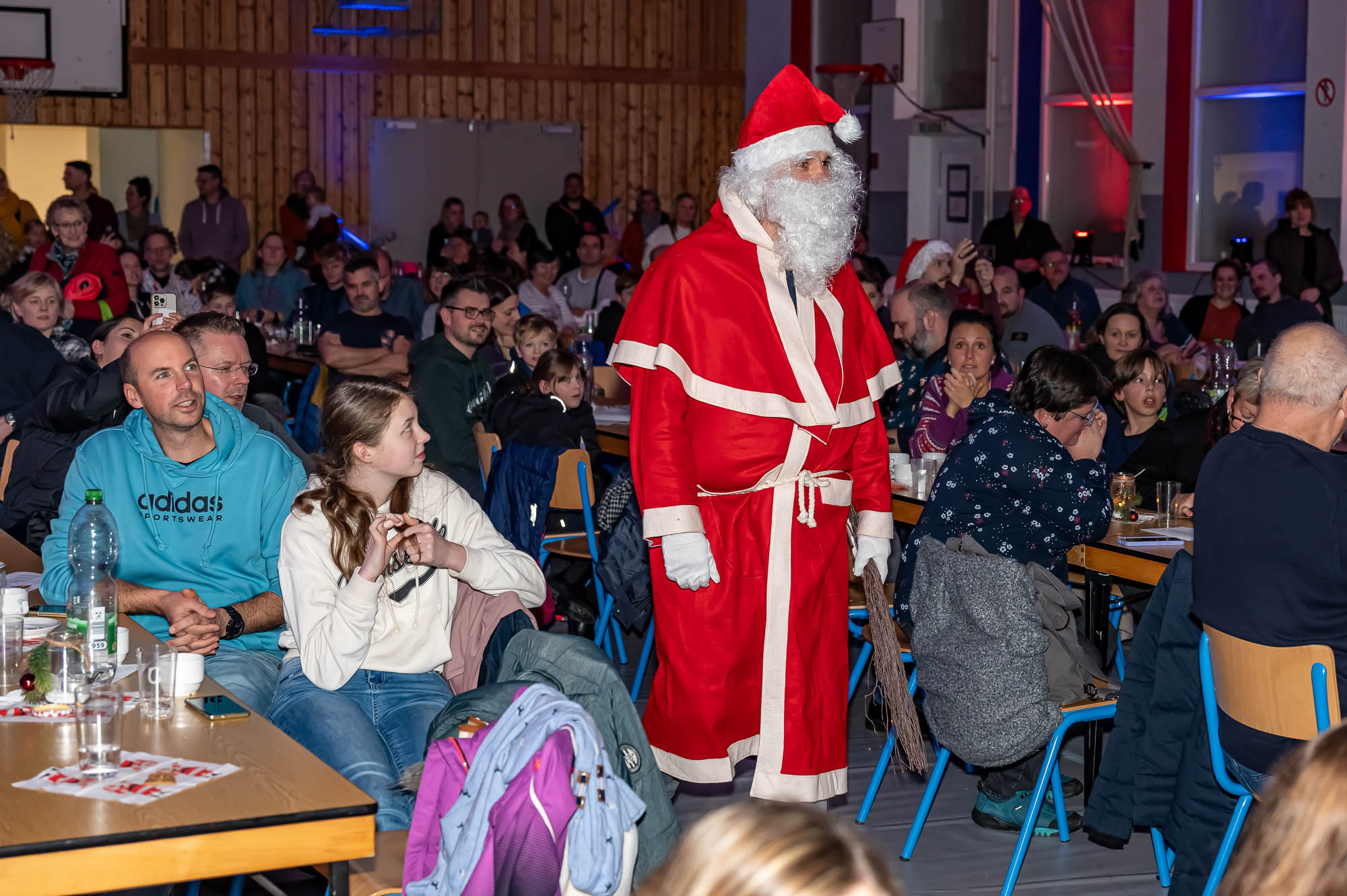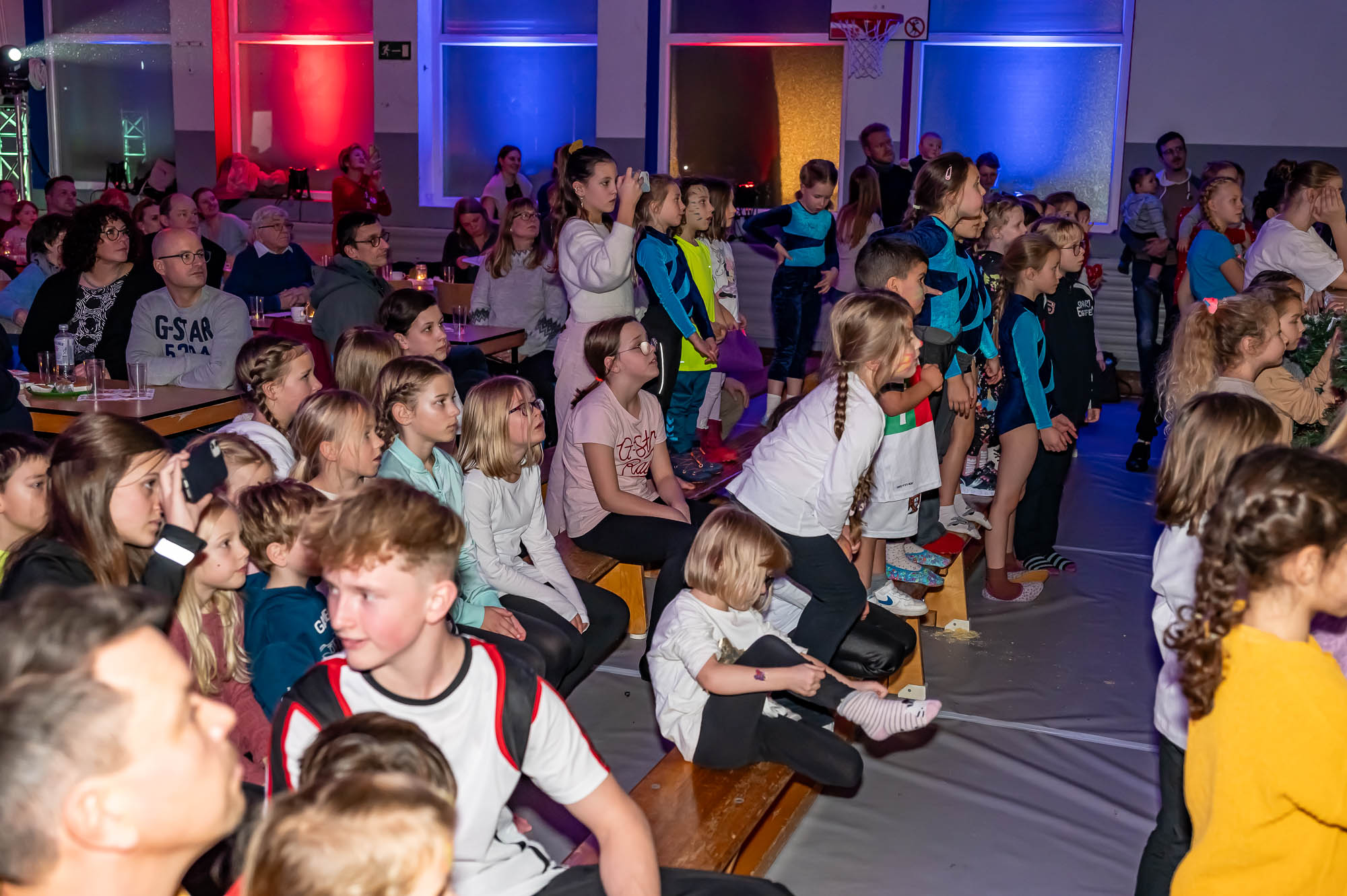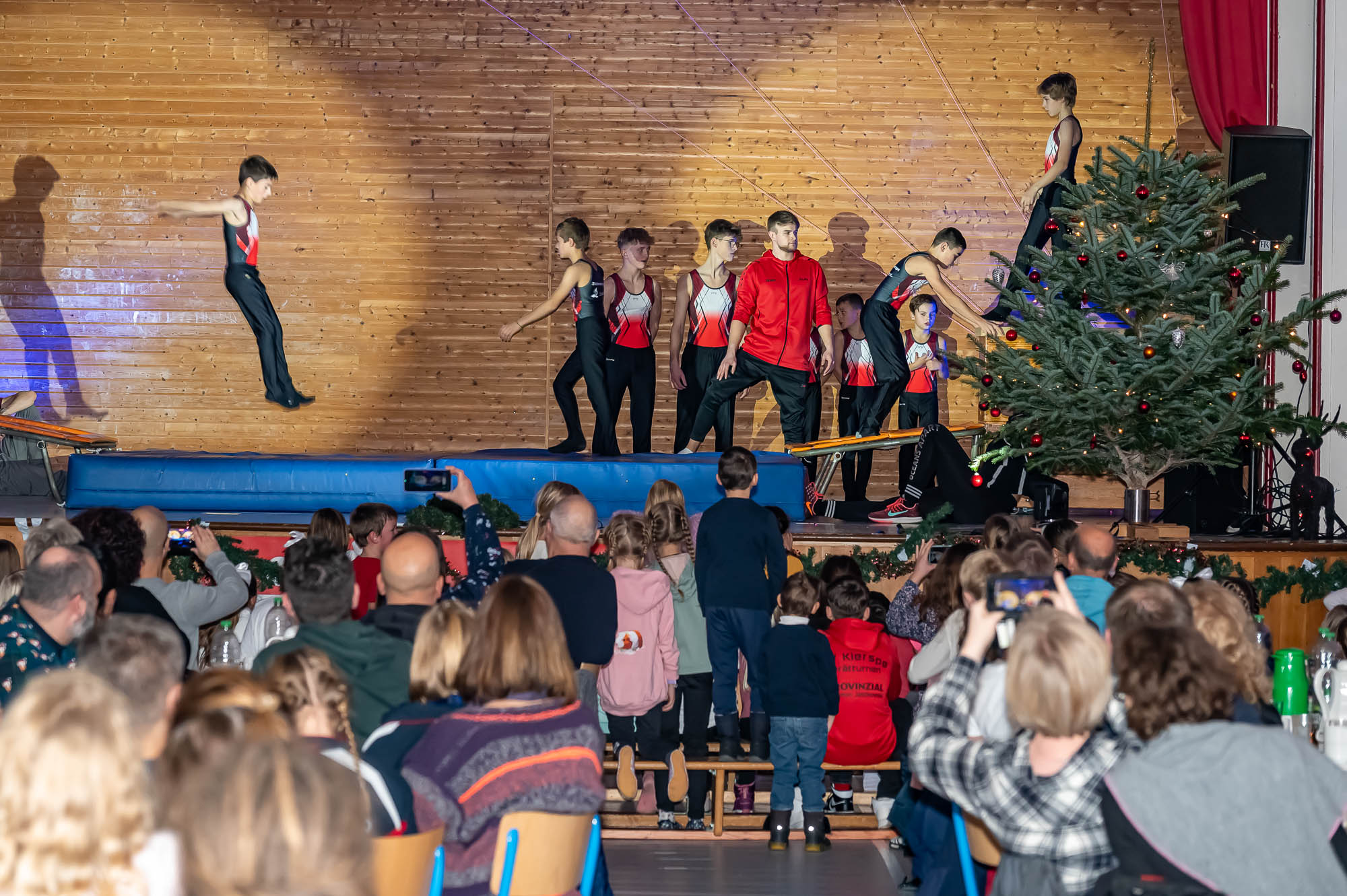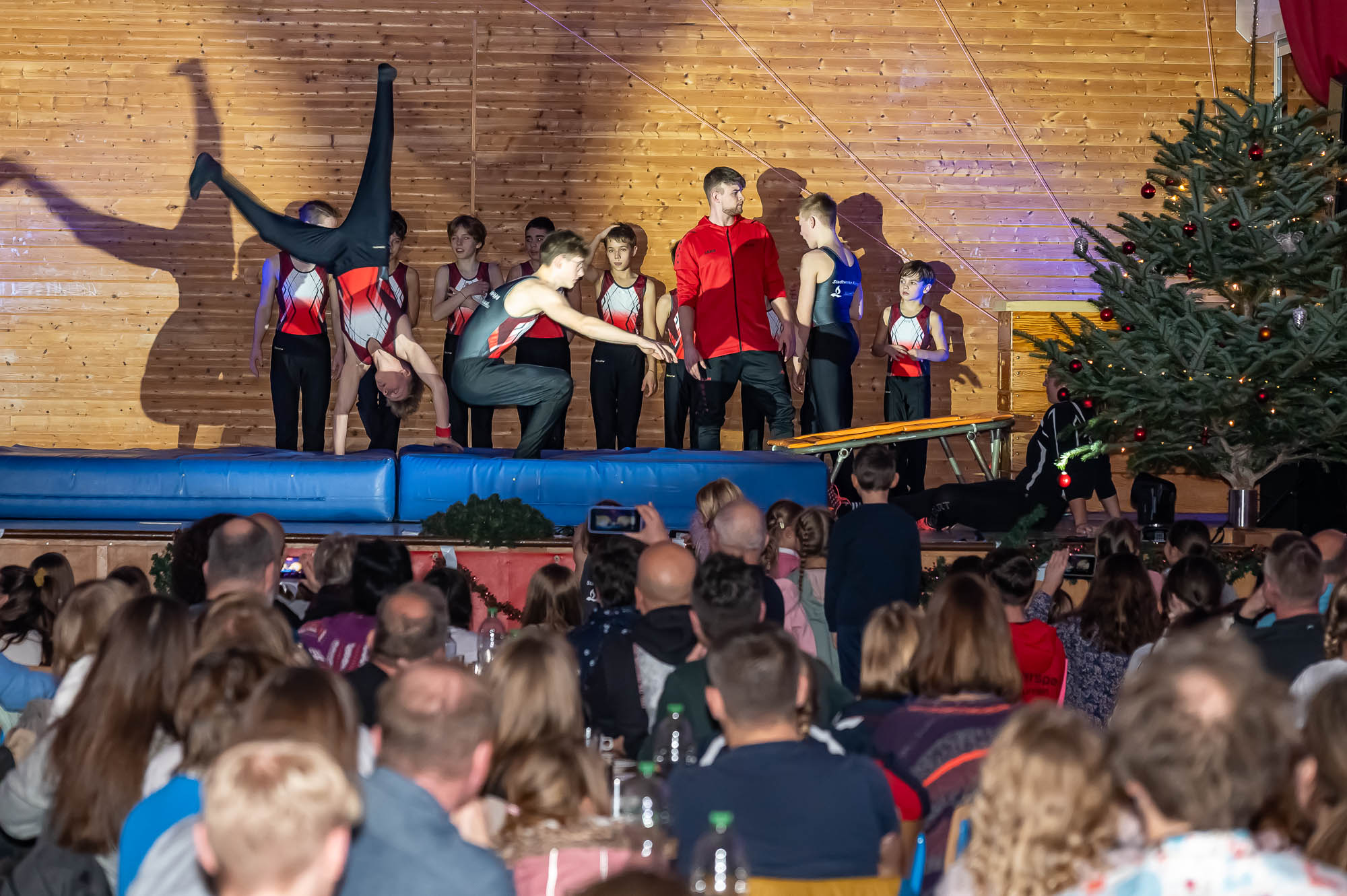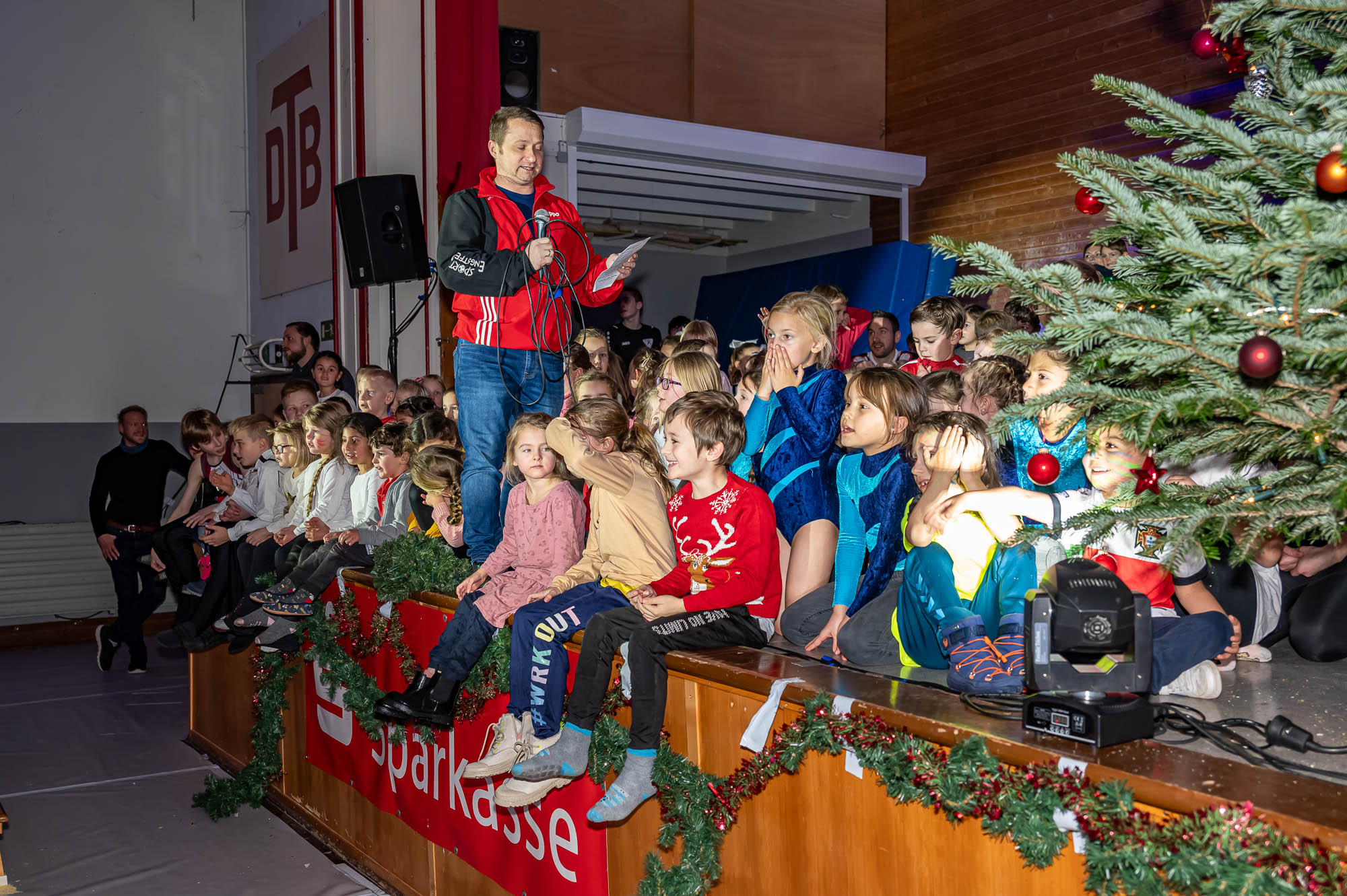 Die Resonanz war in jeder Hinsicht überwältigend: Kein Platz blieb am vergangenen Samstag, 9. Dezember, in der Jahnturnhalle frei, als die Kinder der TSV-Turnabteilung dort auf den Nikolaus warteten. Dessen Besuch war am Ende der Höhepunkt einer weihnachtlichen Feier, zu der kleinen Sportler im Alter von 1 bis 15 Jahren von ihren Eltern, Großeltern oder Geschwistern begleitet wurden. Insgesamt waren geschätzt etwa 400 Gäste dabei. Auf die warteten Kaffee, Kuchen, adventliche Naschereien, und ein sportliches Bühnenprogramm, an dem die Kids tatkräftig beteiligt waren. Und das hatte teils schon artistische Züge!