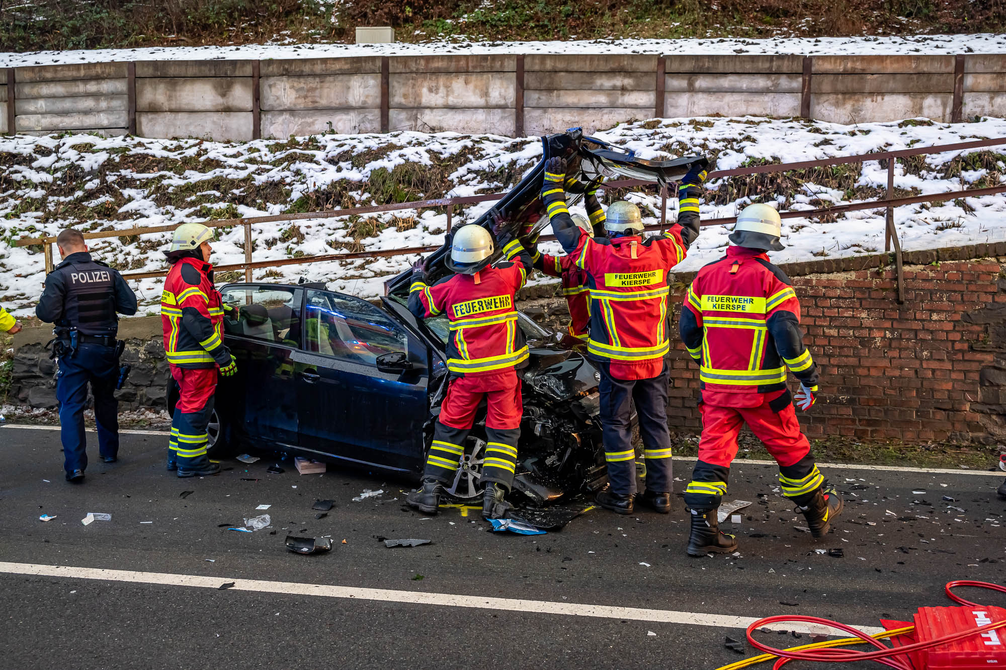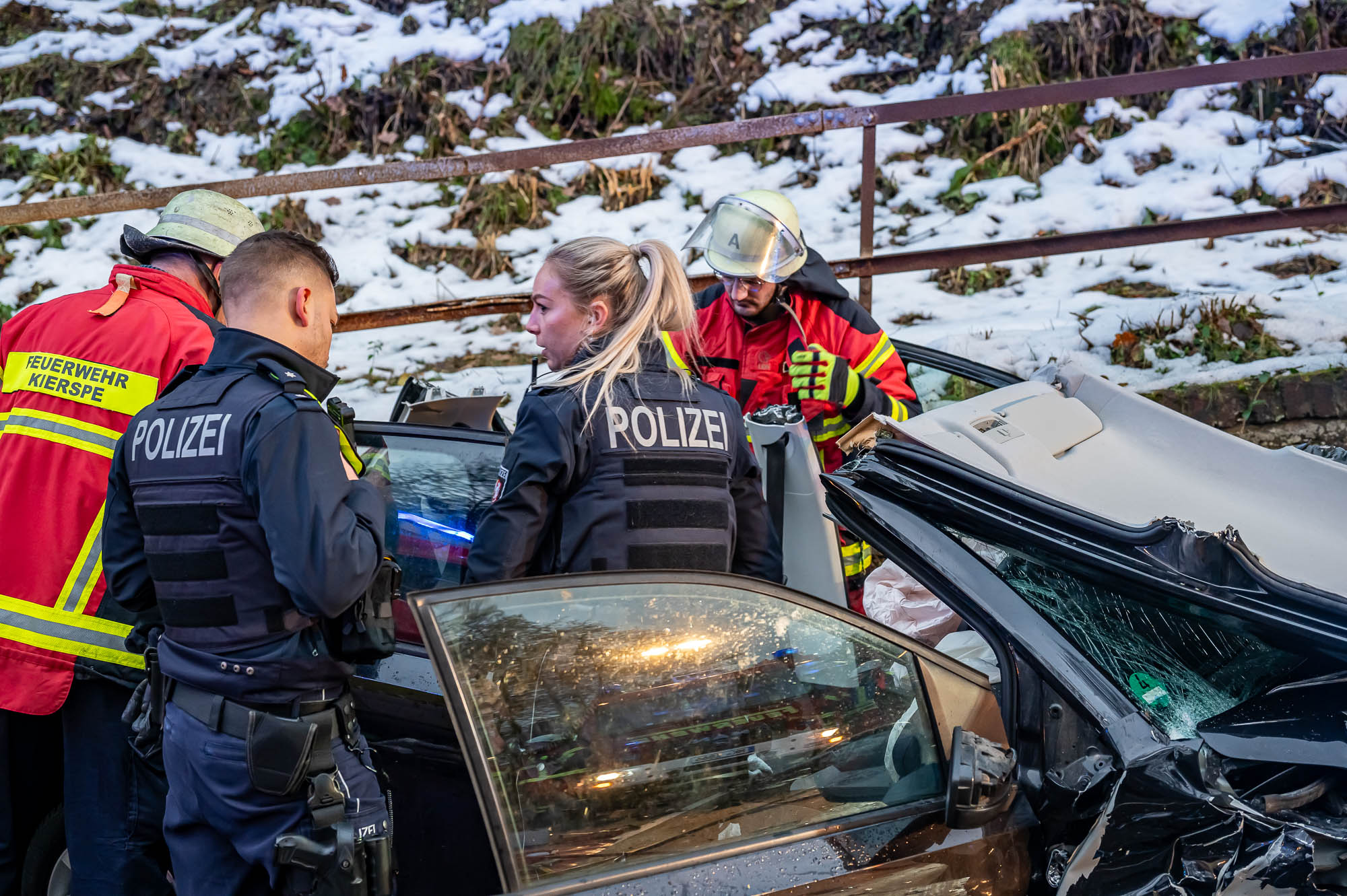 KIERSPE (mk) Ein schwerer Frontalzusammenstoß ereignete sich am Nikolaustag kurz nach 15 Uhr auf der Bollwerkstraße. Aus noch ungeklärter Ursache sind zwei Autos frontal miteinander kollidiert. Drei Personen wurden dabei verletzt. Bei einer jungen Frau, die in einem Skoda Citigo mit einem entgegenkommenden Kia zusammenprallte, entschieden sich die Rettungskräfte für die sogenannte “Patientenorientierte Rettung”. Dabei werden mit schwerem, hydraulischem Gerät soviele Teile des Unfallwracks entfernt, damit die Unfallbeteiligten möglichst schonend aus ihrer Notlage gerettet werden können. In diesem Fall musste die Feuerwehr vorrangig das Dach des Kleinstwagens entfernen, damit die Rettungsassistenten und Notärzte direkten Zugang hatten.