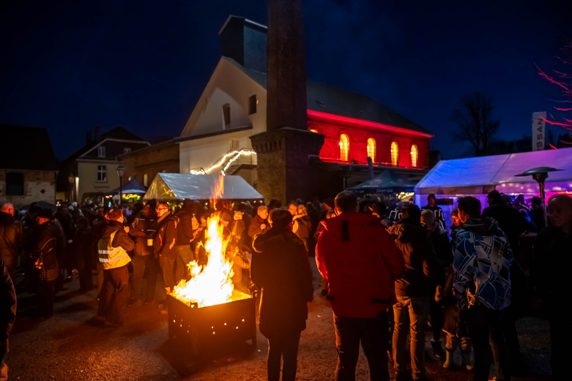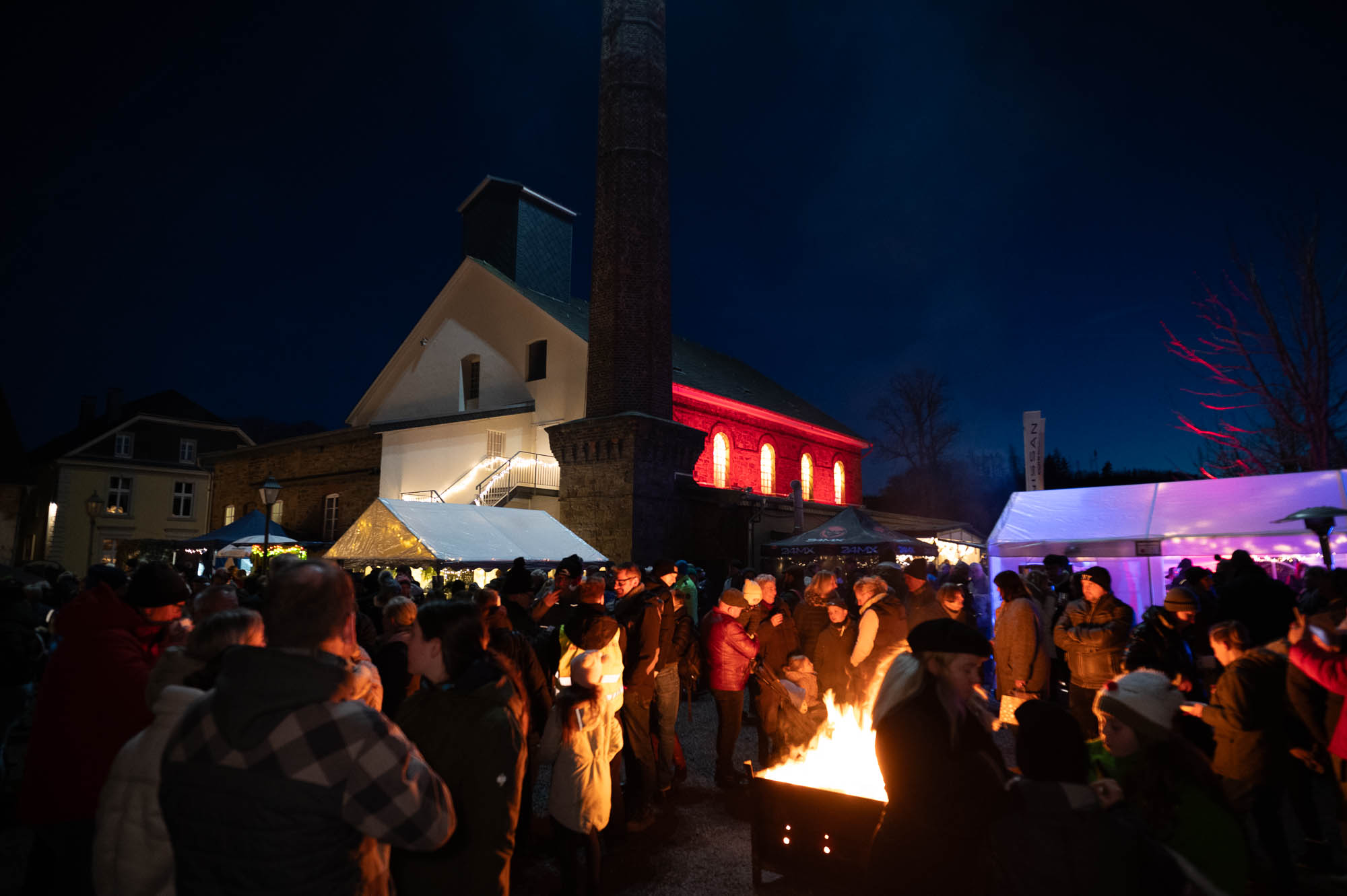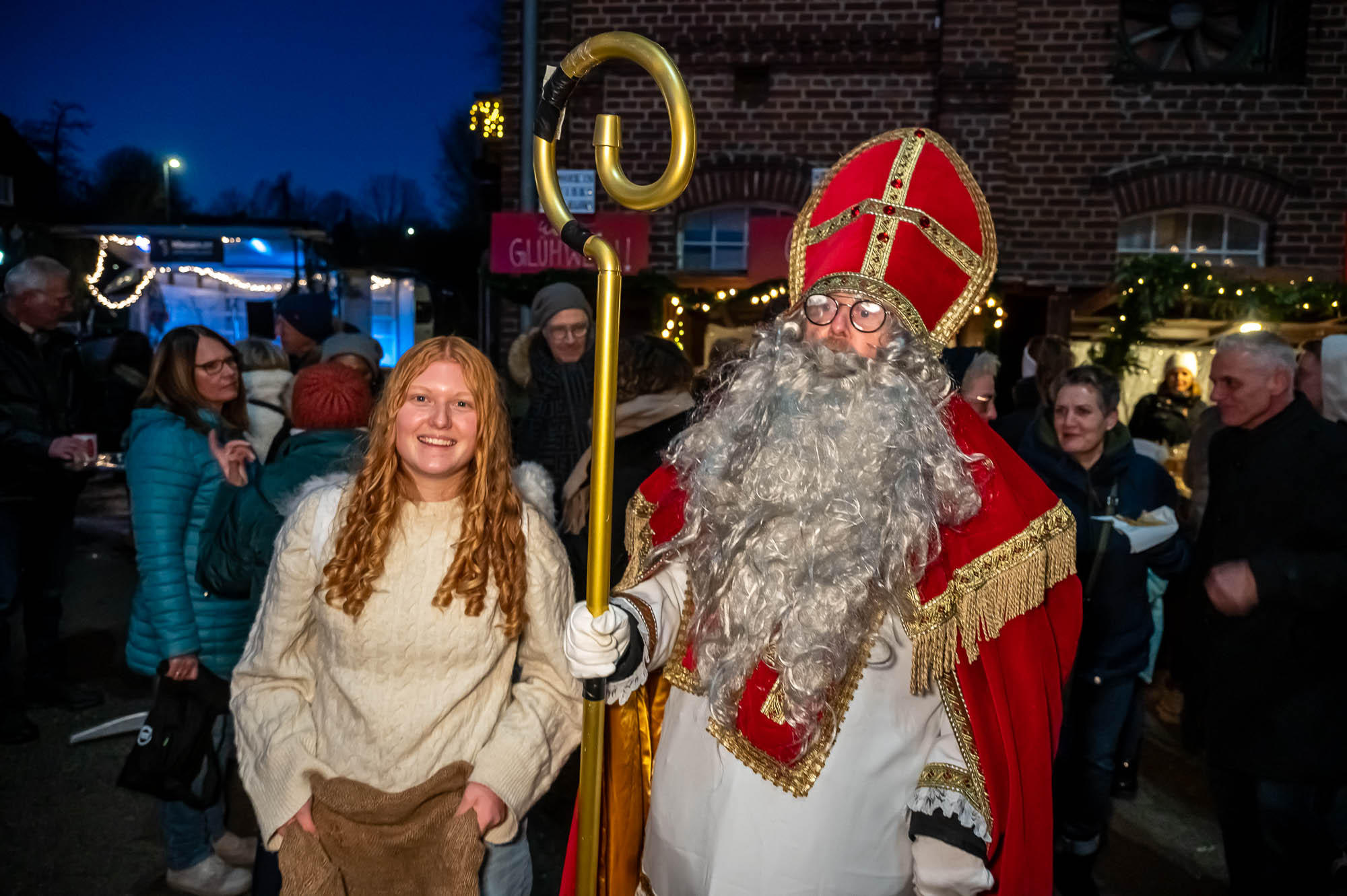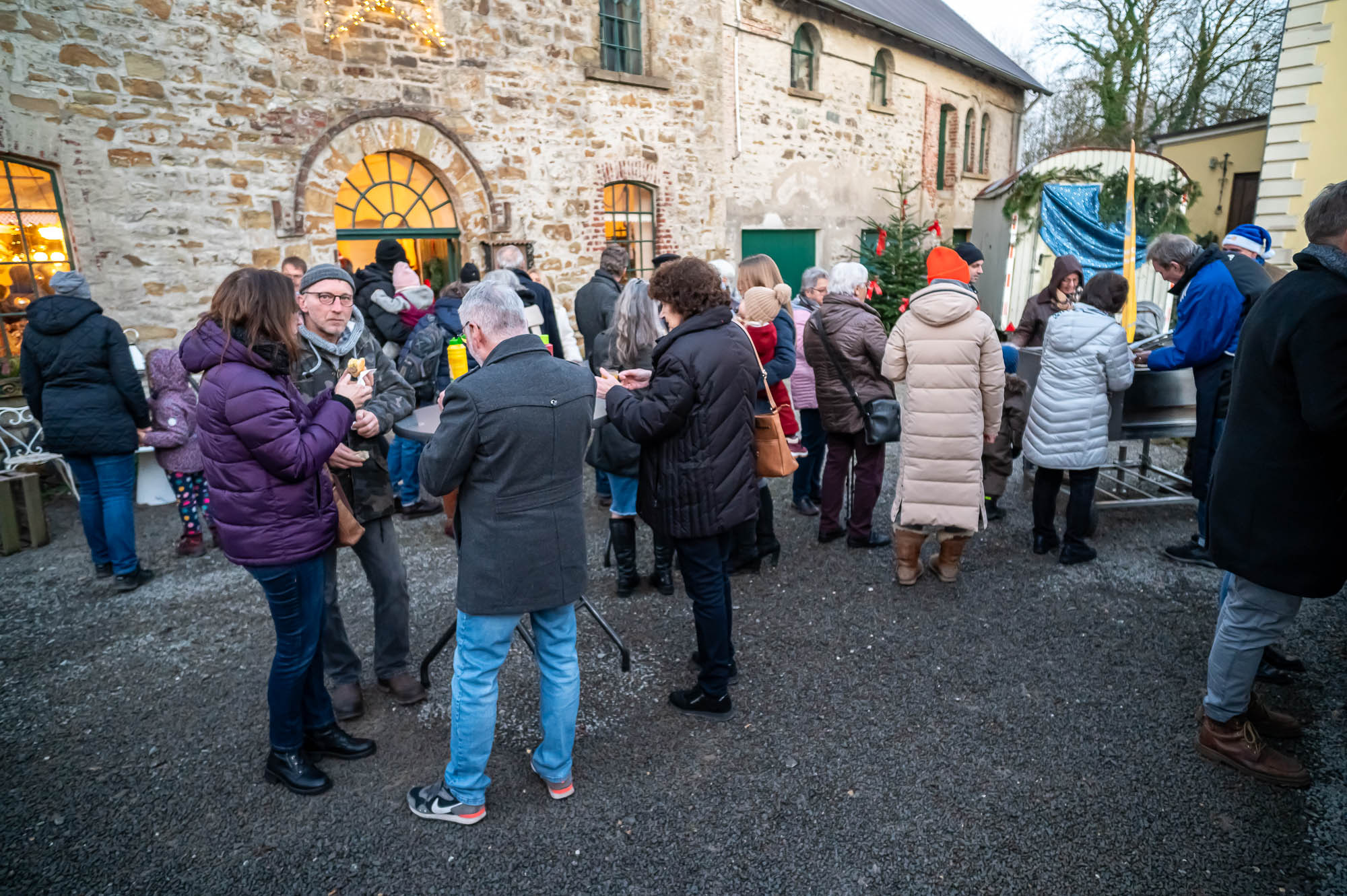 Ähnlich sah es beim Getränkeangebot aus: Der Rönsahler Feuerwehr veredelte ihre Feuerzangenbowle mit bunt-brennenden Zuckerhüten. Für die Kleinen gab es Stockbrot und Kakao. Glühwein fand sich in vielen Variationen. Während tagsüber besonders den Kindern viel geboten wurden, wurde es mit Einbruch der Dunkelheit erst richtig gesellig. Dank großem Lagerfeuer und der stimmungsvollen Beleuchtung kamen die Brennerei und der Hof drumherum erst richtig zur Geltung. Tatsächlich wurde es erst zum Abend so richtig voll. Zwischendurch ging der Nikolaus, begleitet von einem rot-goldenen Engel, durch die Reihen und verschenkte süße Präsente an die Kinder, zumindest die Artigen. Ungewöhnlich war eine Krippe: Diese lebte, war aber nicht so ganz “bibelgetreu”, denn diesmal waren Alpakas dabei. Das war zwar nicht ganz ganz original, aber sehr harmonisch. Schließlich handelt es sich beiden Tieren aus Südamerika um sehr friedfertige Kameraden.