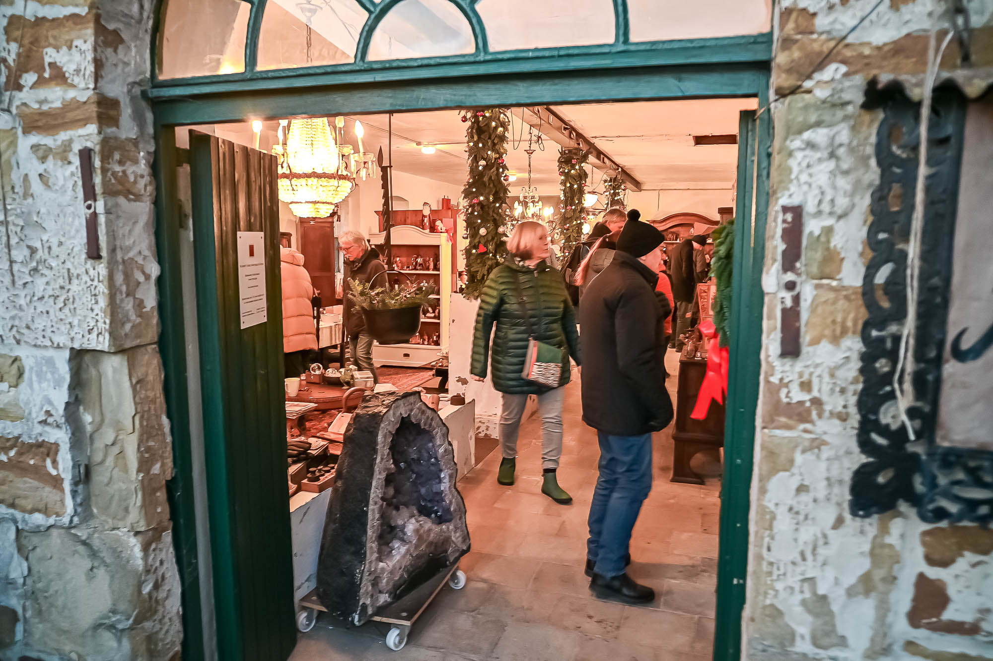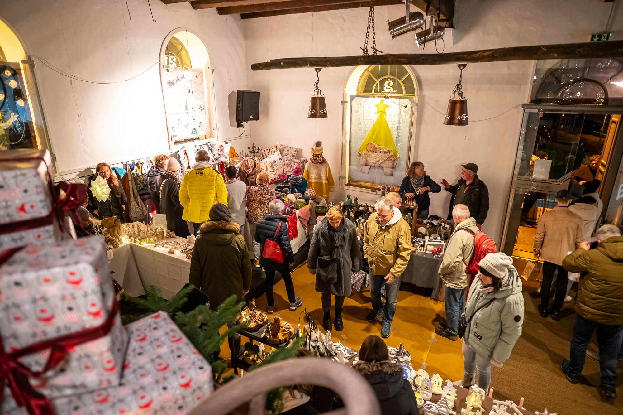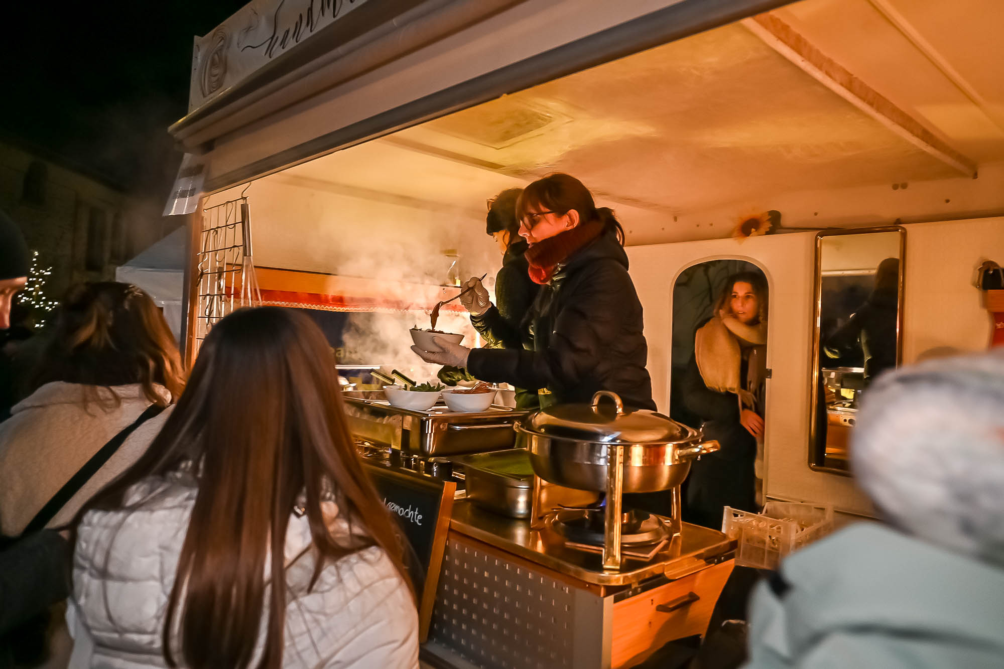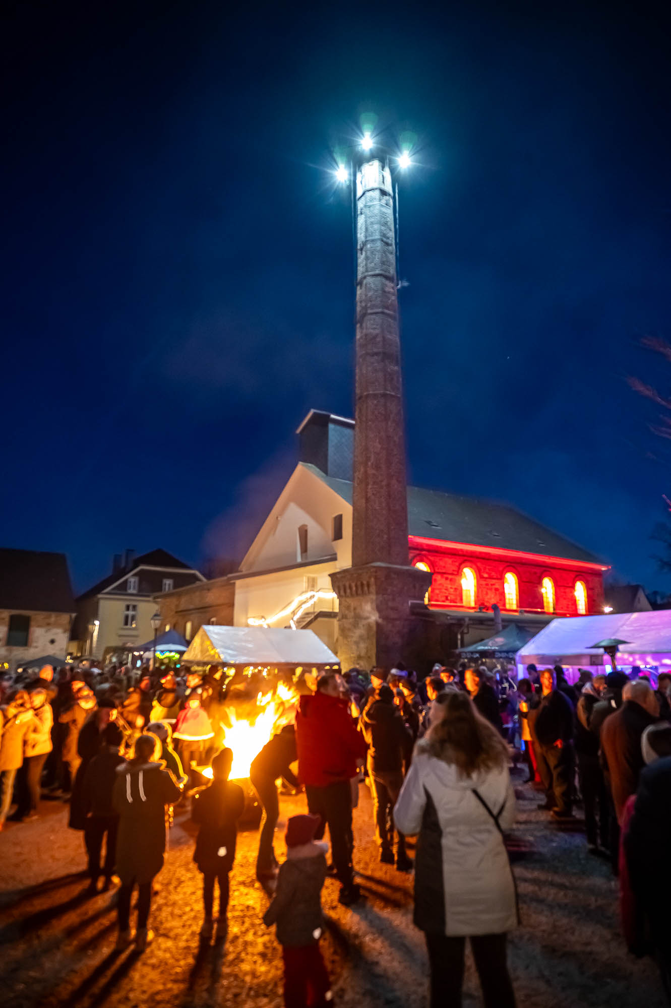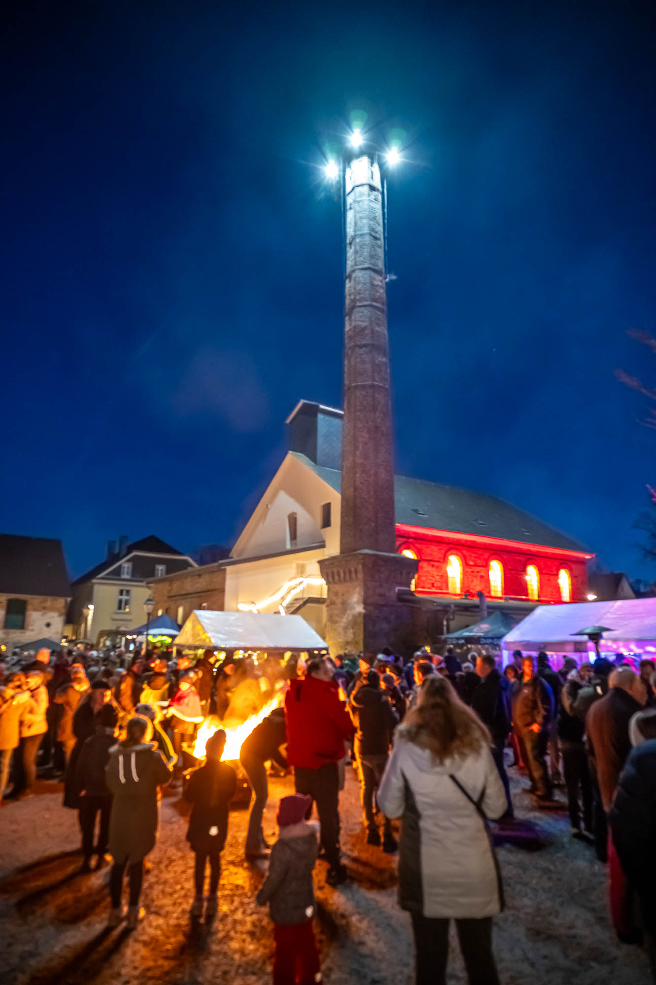 Ähnlich sah es beim Getränkeangebot aus: Der Rönsahler Feuerwehr veredelte ihre Feuerzangenbowle mit bunt-brennenden Zuckerhüten. Für die Kleinen gab es Stockbrot und Kakao. Glühwein fand sich in vielen Variationen. Während tagsüber besonders den Kindern viel geboten wurden, wurde es mit Einbruch der Dunkelheit erst richtig gesellig. Dank großem Lagerfeuer und der stimmungsvollen Beleuchtung kamen die Brennerei und der Hof drumherum erst richtig zur Geltung. Tatsächlich wurde es erst zum Abend so richtig voll. Zwischendurch ging der Nikolaus, begleitet von einem rot-goldenen Engel, durch die Reihen und verschenkte süße Präsente an die Kinder, zumindest die Artigen. Ungewöhnlich war eine Krippe: Diese lebte, war aber nicht so ganz “bibelgetreu”, denn diesmal waren Alpakas dabei. Das war zwar nicht ganz ganz original, aber sehr harmonisch. Schließlich handelt es sich beiden Tieren aus Südamerika um sehr friedfertige Kameraden.