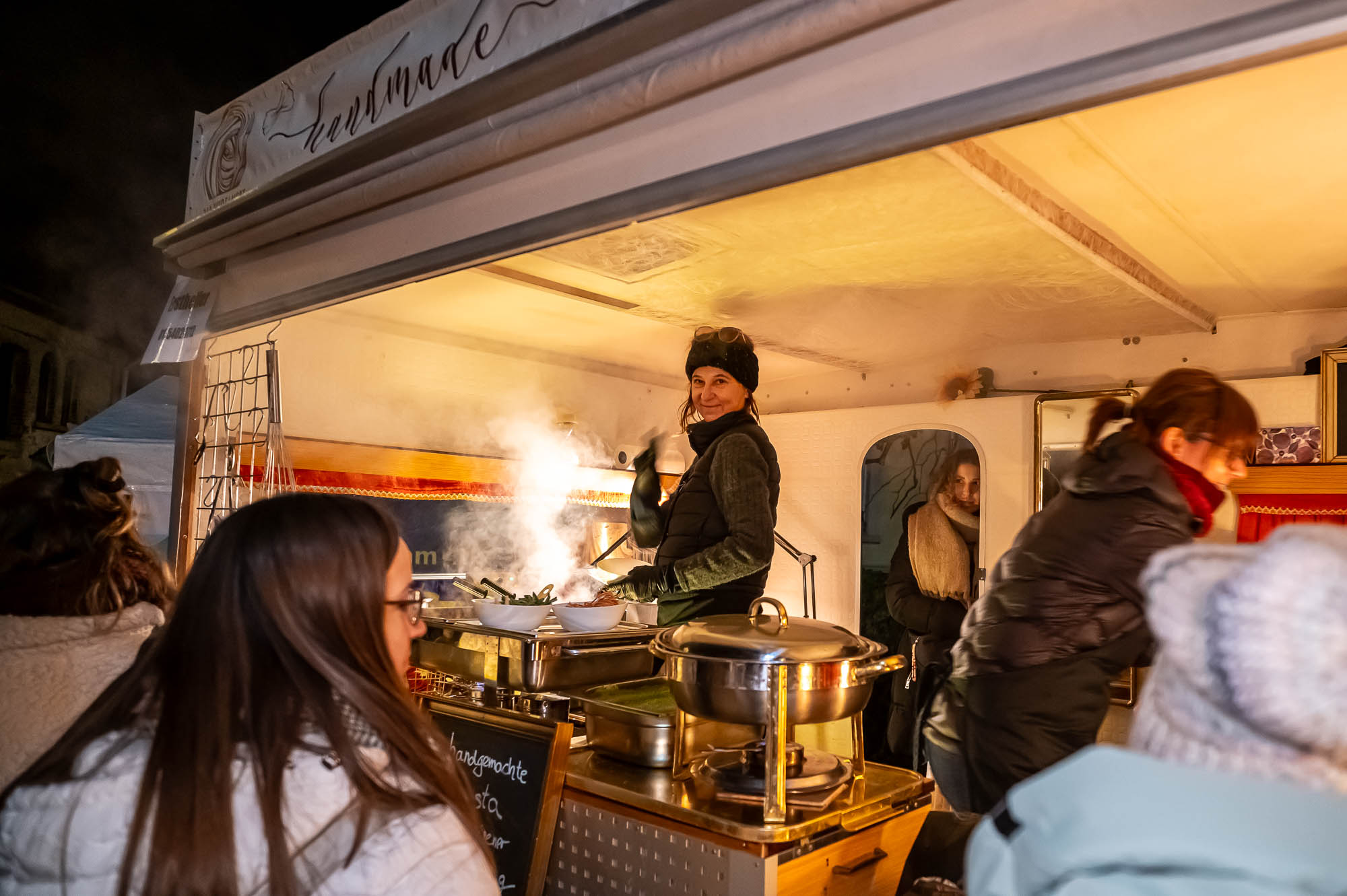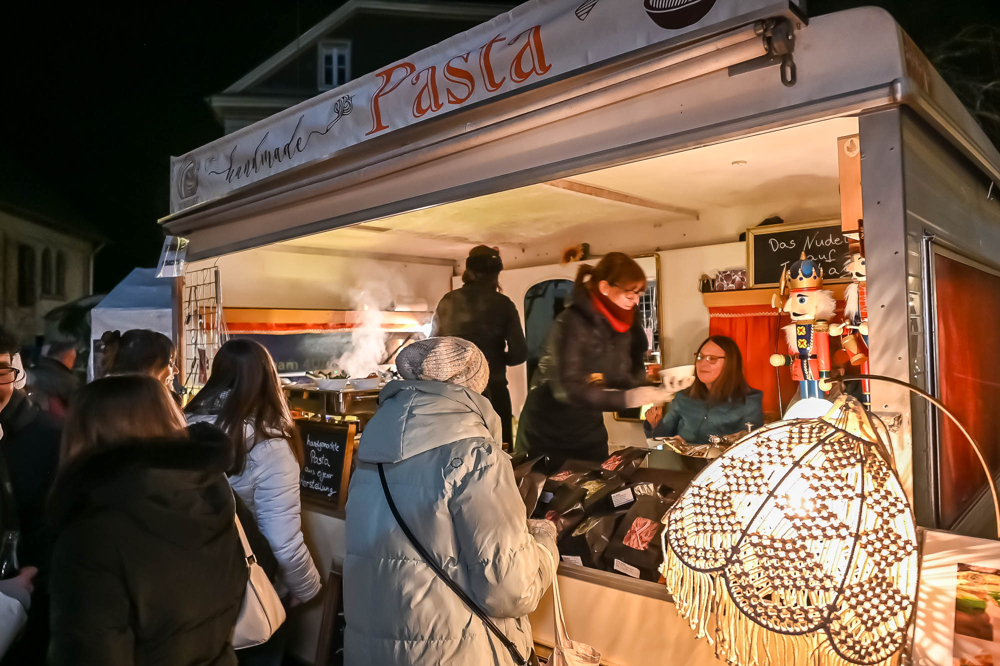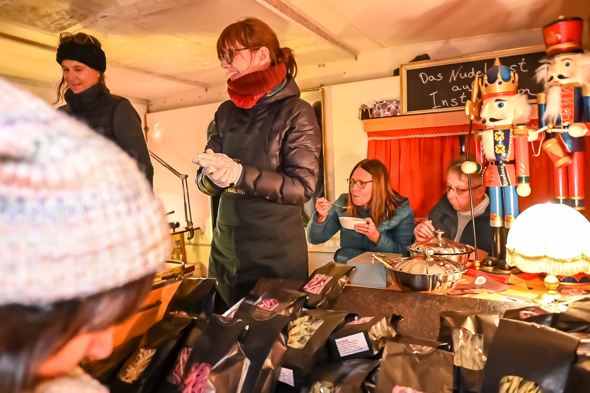 Natürlich lebt der “Budenzauber” nicht nur von seinem romantischen Ambiente, sondern auch von den attraktiven Angeboten. Der Verein zog alle Register, um eine gelungene Mischung zusammenzustellen. Während sich die zahlreichen Anbieter von kunsthandwerklichen Geschenkideen auf die Innenräume der Brennerei verteilten, bot sich den kleinen und großen Besuchern draußen eine regelrechte Partymeile. Von der leckeren Bratwurst am Grill der Rotarierinnen und Rotarier über besondere Pastasorten gab es eine Riesenauswahl leckerer Speisen. Zumal in der Brennerei auch noch Kaffee und Torten warteten. Die Rönsahler Spechtbuben glänzten nicht nur mit Gesangsdarbietungen auf der Bühne, sondern auch hinterm Tresen mit einer eigenen Bude. Ihr Gulasch erwies sich als heißbegehrt. Kurzum: Die Auswahl war riesengroß und sehr verlockend.