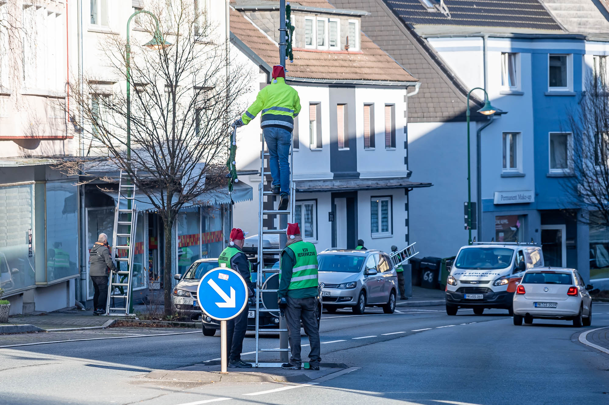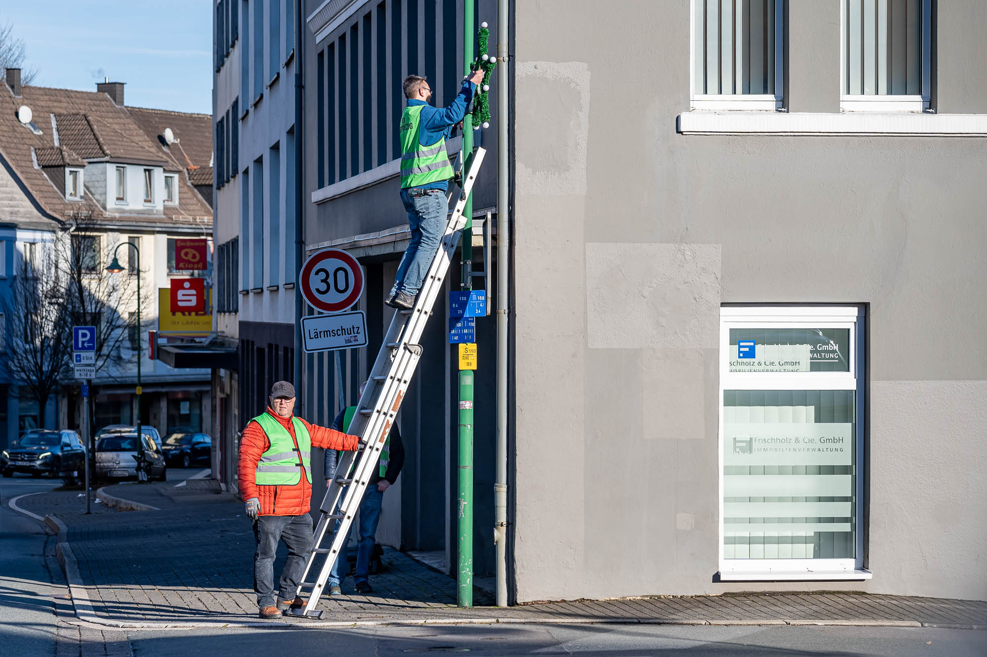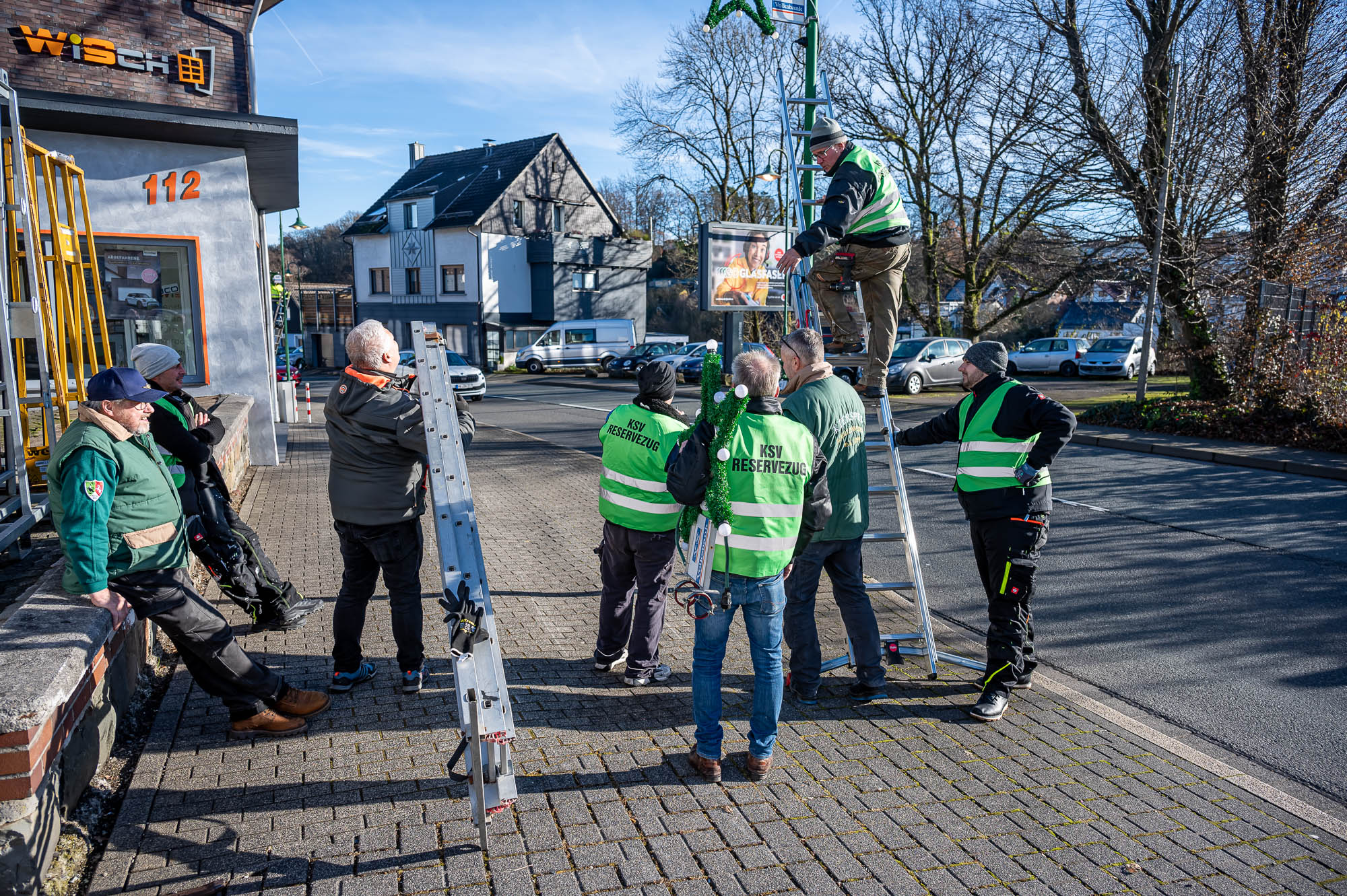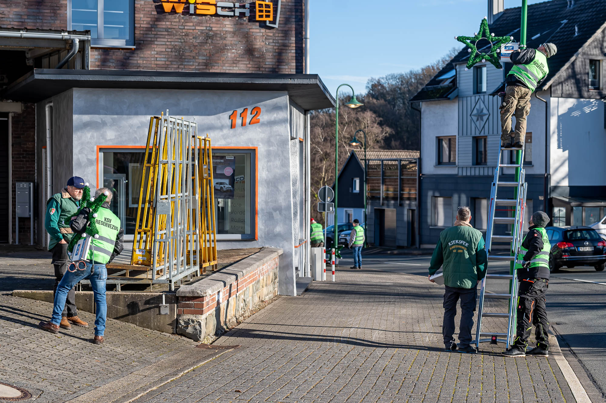 KIERSPE (mk) Wenn der Himmel Ende November strahlend blau ist, dann ist es zumeist nicht sonderlich warm. Trotzdem war das Wetter für das Aufhängen der beleuchteten Weihnachtssterne an der Kölner Straße sowie an der Friedrich-Ebert-Straße vergleichsweise angenehm. Der Reservezug des Kiersper Schützenvereins hat die schmückende Beleuchtung gerade rechtzeitig am Samstag vor dem 1. Advent aufgehängt.