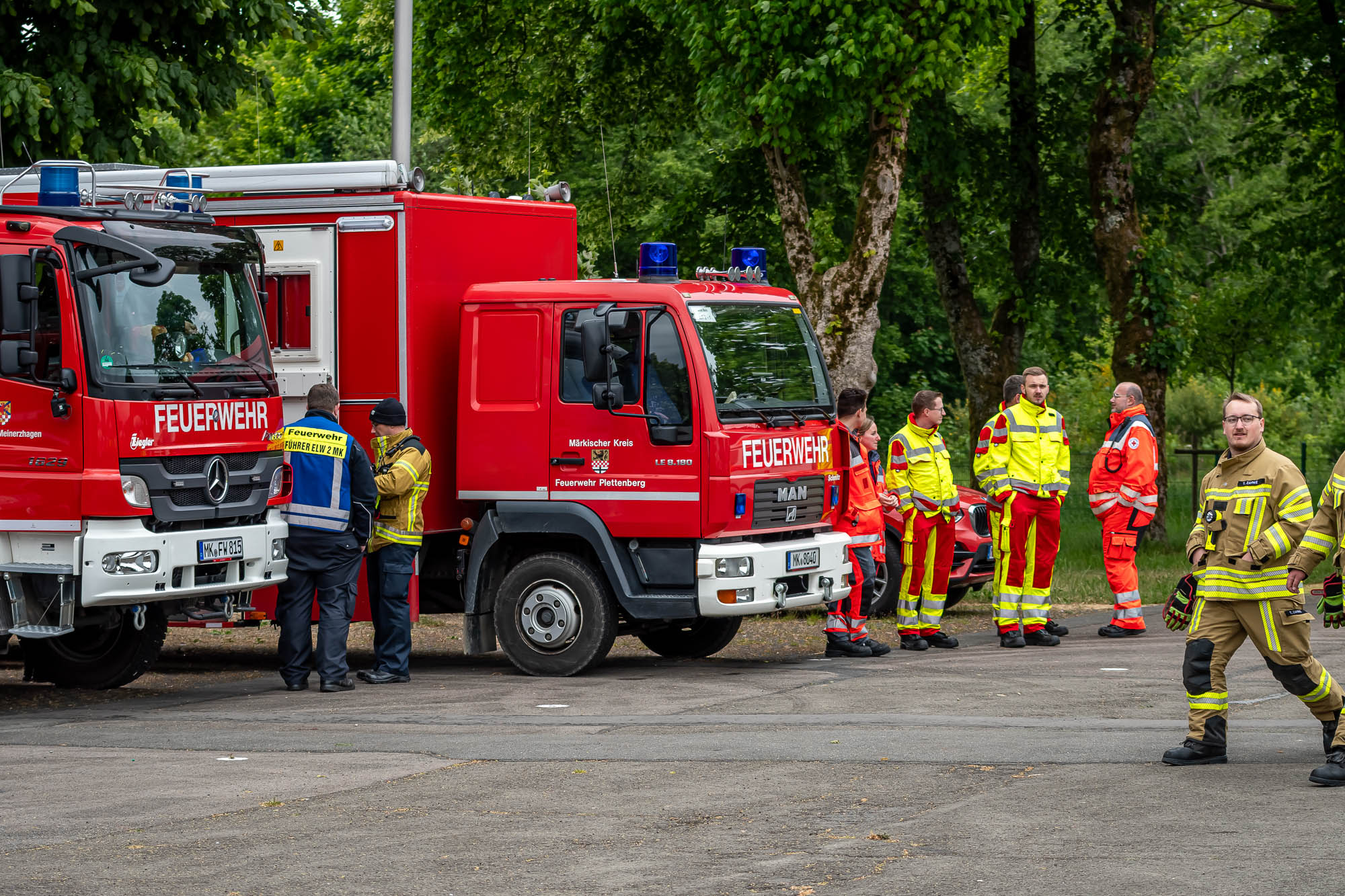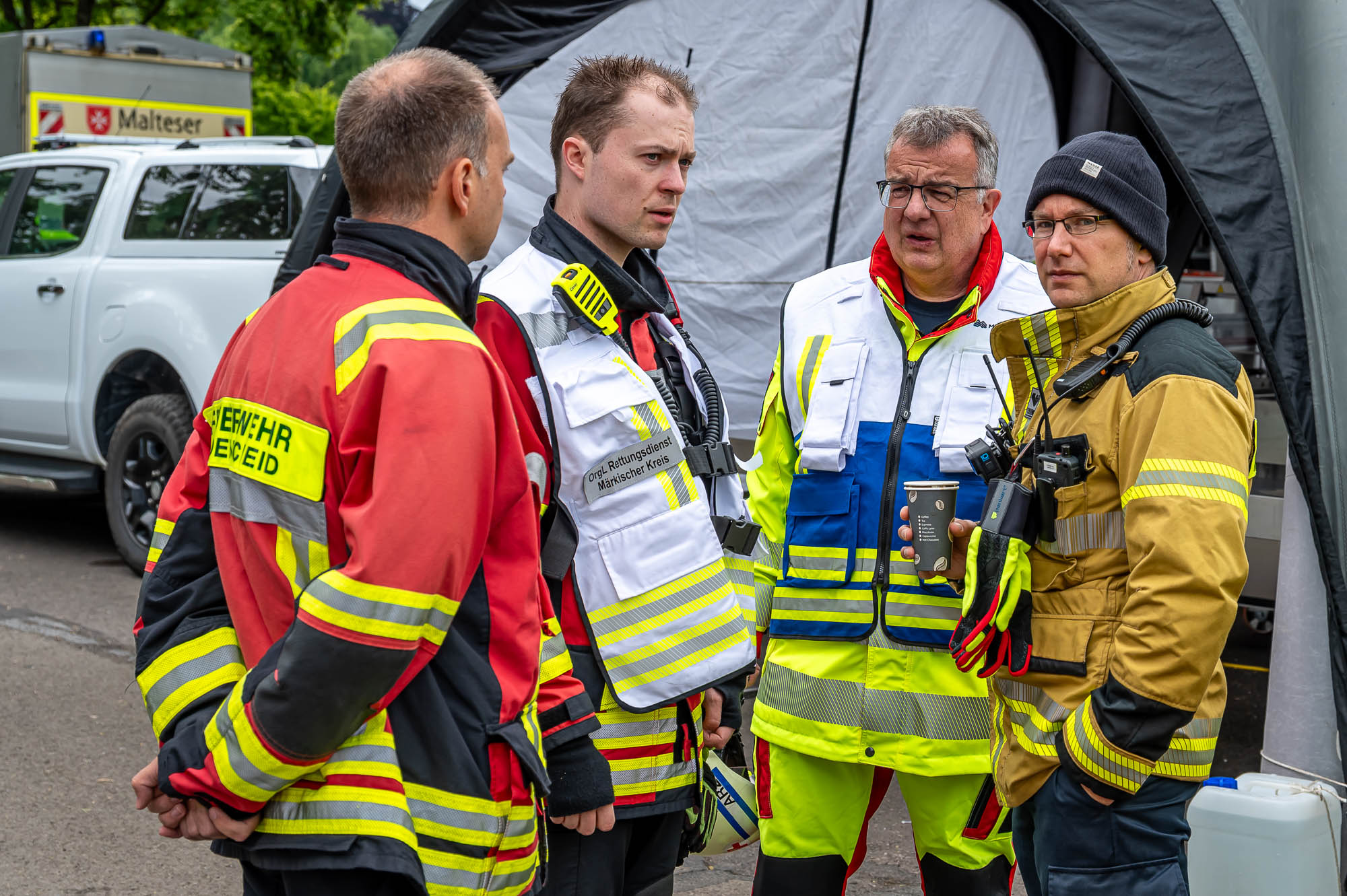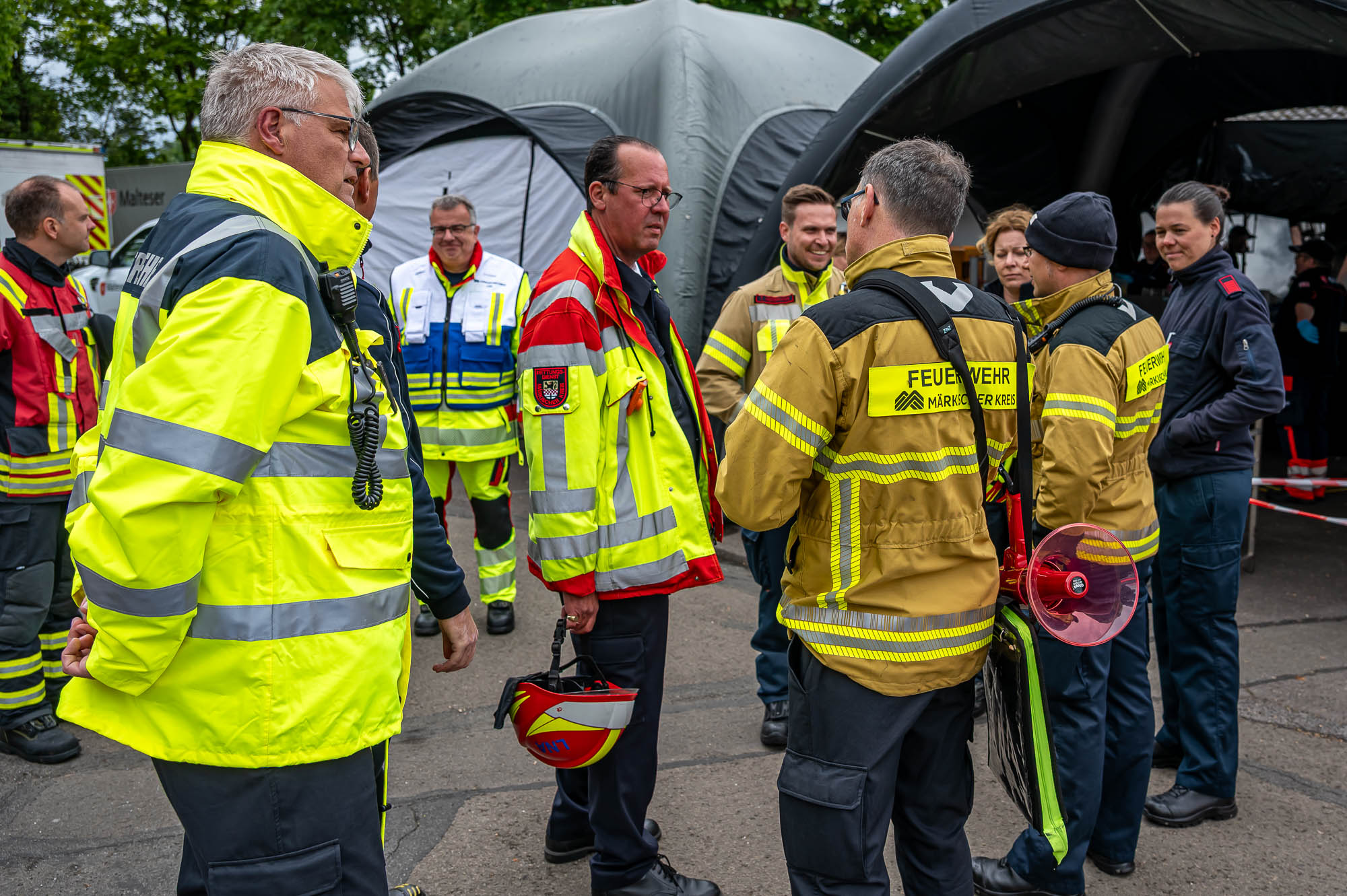 Auch diese war ein wesentlicher Baustein der Übung: “Im Rahmen der Übung war auch die Einsatzleitung im Brandschutz- und Rettungsdienstzentrum (BRZ) Altena-Rosmart als Hintergrundstab tätig. Ziel war es, die Kommunikation und Zusammenarbeit zwischen einer punktuellen Einsatzlage vor Ort und einem rückwärtig eingesetzten Führungsstab zu erproben und weiter zu verbessern”, erläutert der Märkische Kreis schriftlich die Vorgehensweise. Kreisbrandmeister Kling, sein Stellvertreter Jörg Döring und der Ärztliche Leiter des Rettungsdienstes Heinz Ostermann waren selbst vor Ort. Und etliche erfahrene Einsatzleiter der jeweiligen Hilfsorganisationen, die alle ihre Position in der Struktur hatten. Rund zwei Stunden dauerte der Einsatz, an dessen Ende spürbar von allen eine gewisse Anspannung abfiel. Spürbar waren auch die Motivation und das Herzblut, mit der alle Beteiligten dabei waren. Die Lage stellte sich erschreckend realistisch dar, und der Aufwand im Vorfeld nachvollziehbar enorm: “So eine Übung können wir höchstens alle zwei Jahre durchführen”, so Michael Kling. Der viele Eindrücke und Notizen mitnimmt. Schließlich geht es nicht nur um das Training für die Beteiligten, sondern auch um das Optimieren oder gar das Erkennen von Schwachstellen. “Immer vor der Lage sein” lautet ein wichtiges Motto unter Hilfsorganisationen. Deutlicher als bei dieser Übung kann man dazu wohl nicht alle Register ziehen.