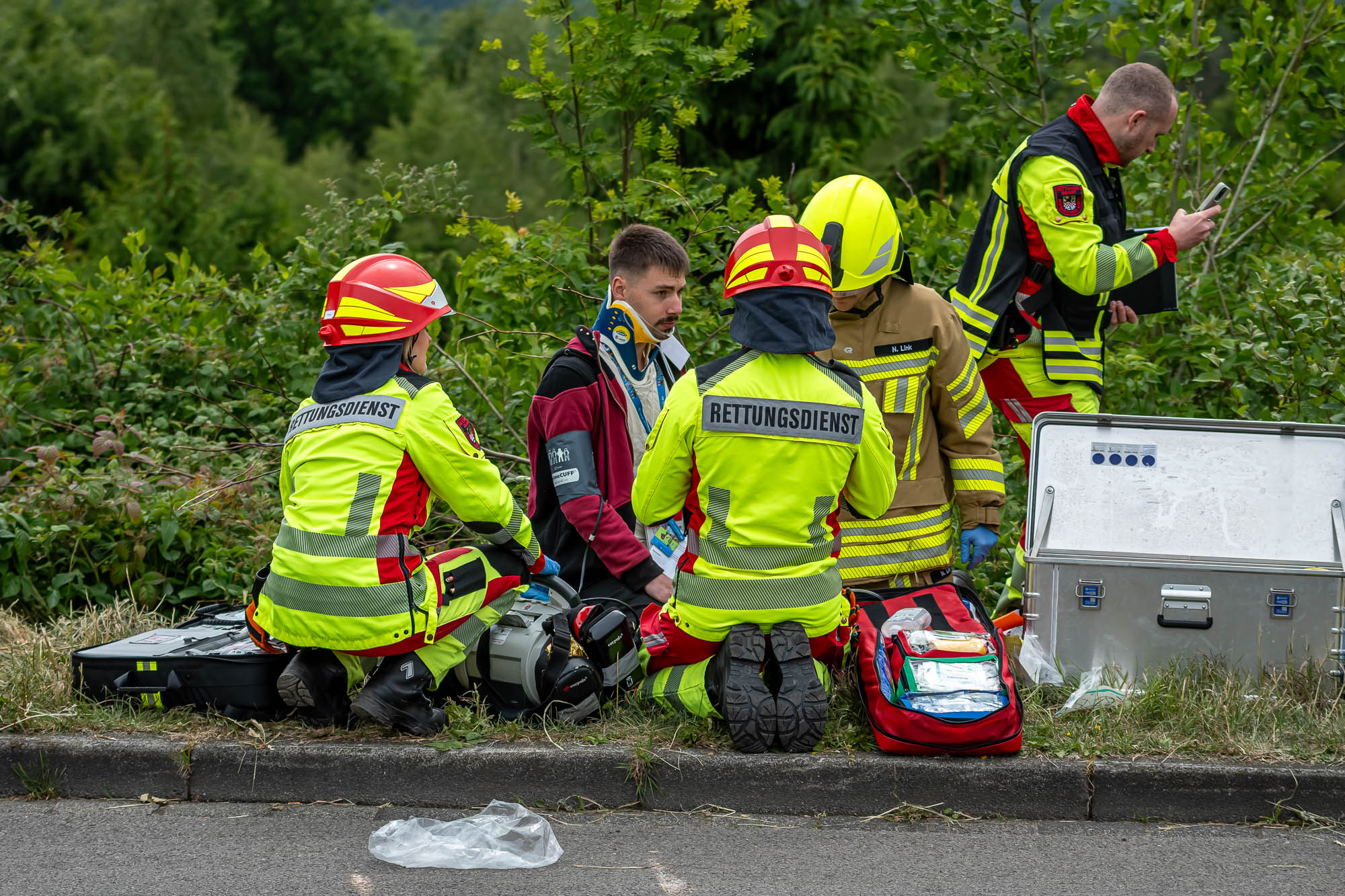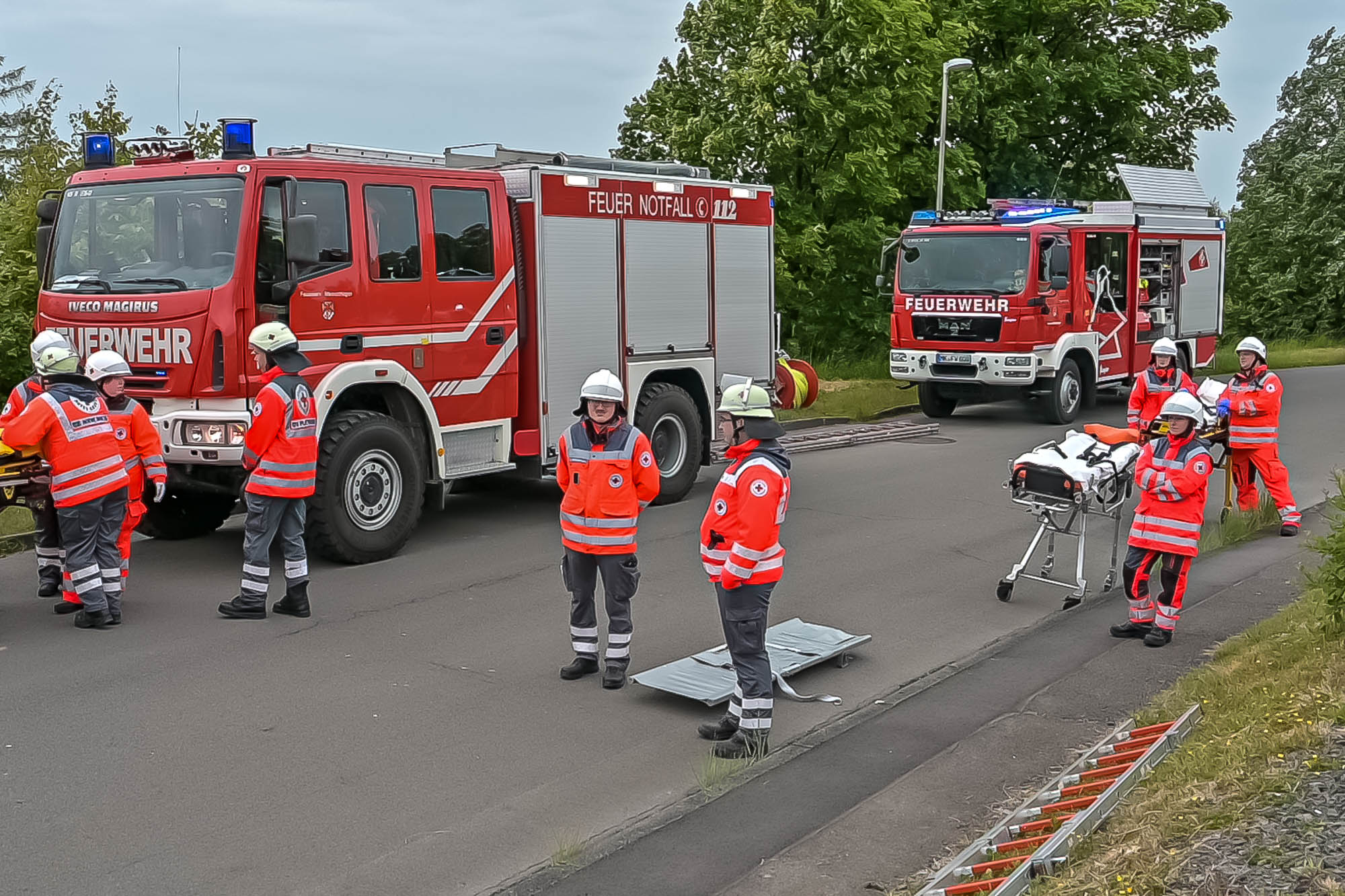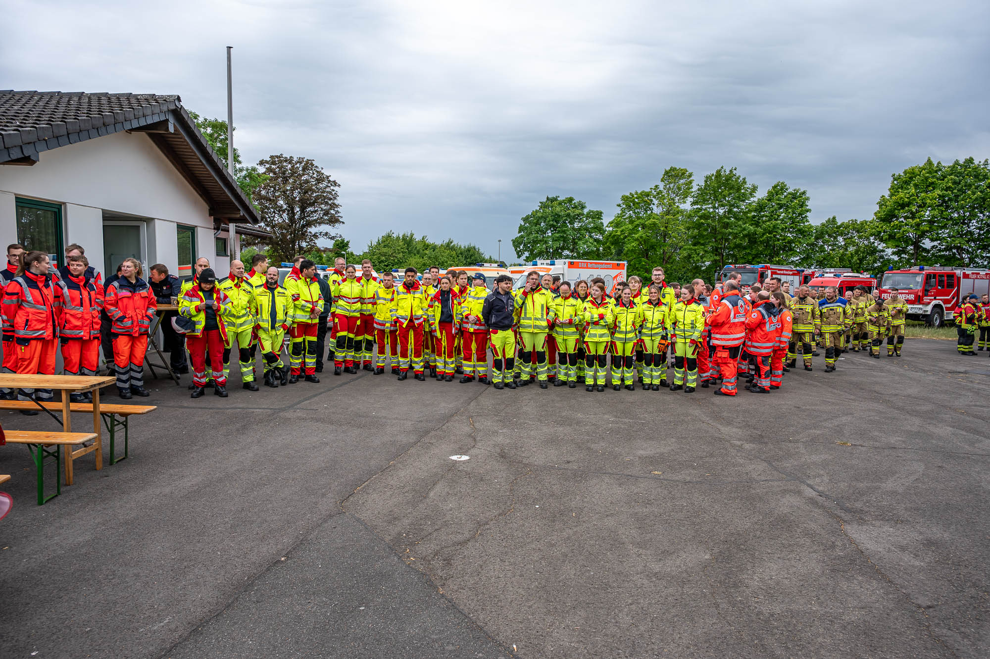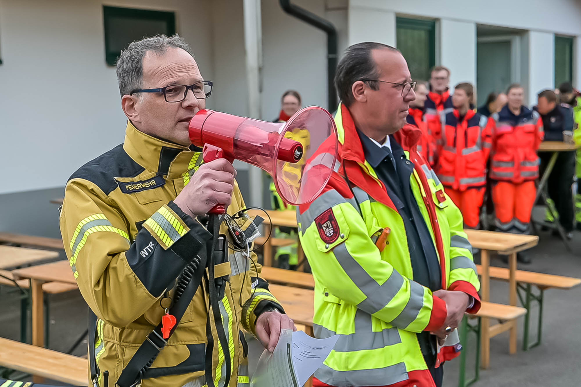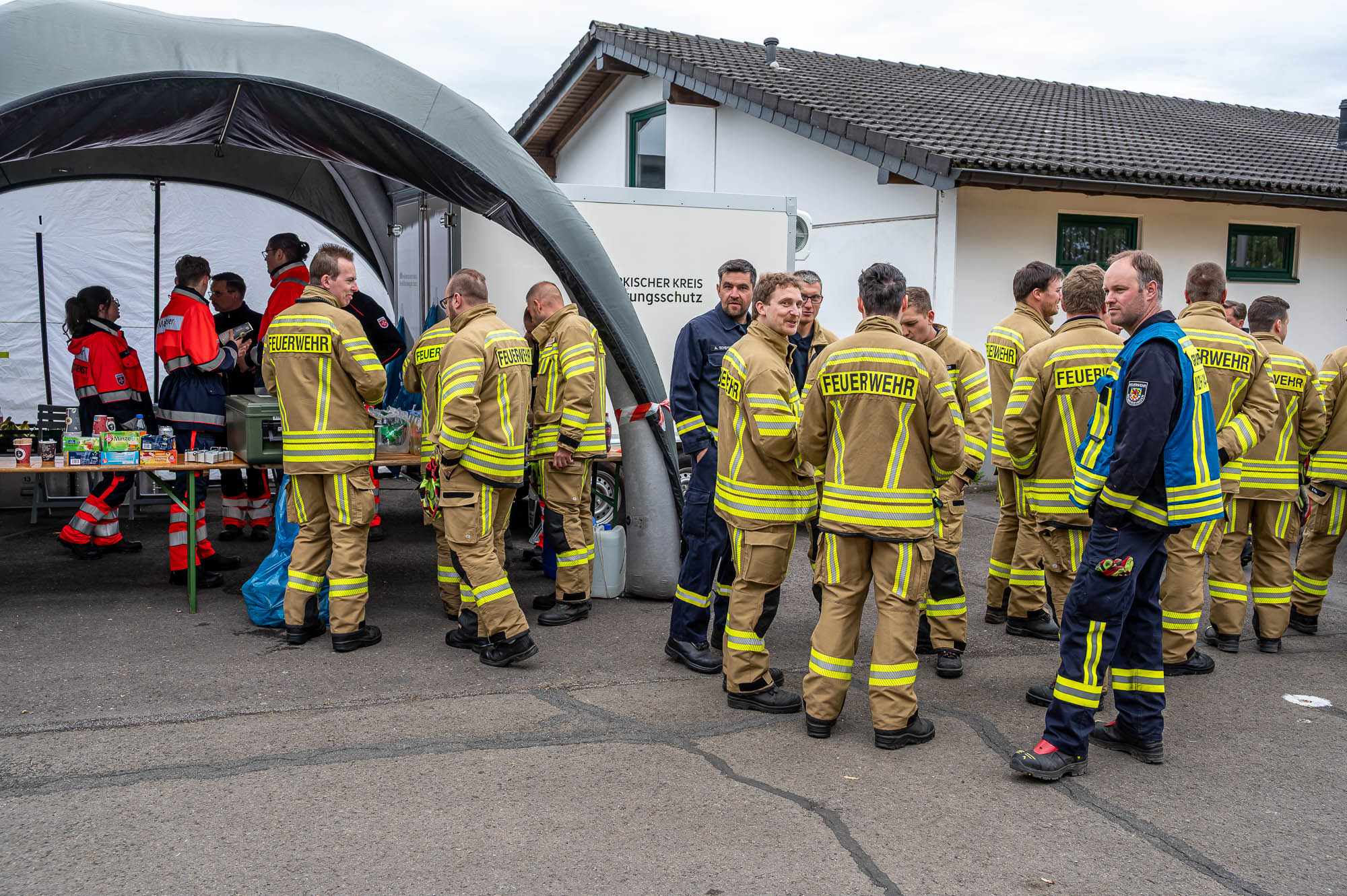 Noch mehr als bei anderen Übungen behielten die Organisatoren und Einsatzleiter auch im Blick, wie realistisch die Rettungskräfte die Situation auch mental empfinden. “Bereits nach kurzer Zeit tauchen die Beteiligten so tief in die Lage ein, dass sie kaum noch wahrnehmen, dass es sich um eine Übung handelt”, heißt es aus dem Leitungsstab. Das ist besonders bei diesem sensiblen und gefährlichen Thema erwünscht und wichtig, doch übertreiben darf man es nicht: “Wir müssen den Kipppunkt im Auge behalten”, erläutert Kreisbrandmeister Kling. Die psychosoziale Belastung sieht Kling als fast genauso hoch an wie bei echten Einsätzen: “Darum ist es auch gut, dass alle Beteiligten im Anschluss noch zum Essen und Trinken in der Gemeinschaft zusammensitzen und sich austauschen.” Keiner würde den “Hammer fallen lassen” und sofort heimfahren. Das lobt Kling in mehrfacher Hinsicht und betont, dass ja hier zu 90% Ehrenamtliche beteiligt sind. Darüber hinaus war ohnehin die Einheit Psychosoziale Notfallversorgung für Einsatzkräfte (PSNV‑E) beteiligt und hätte auch real helfen können.