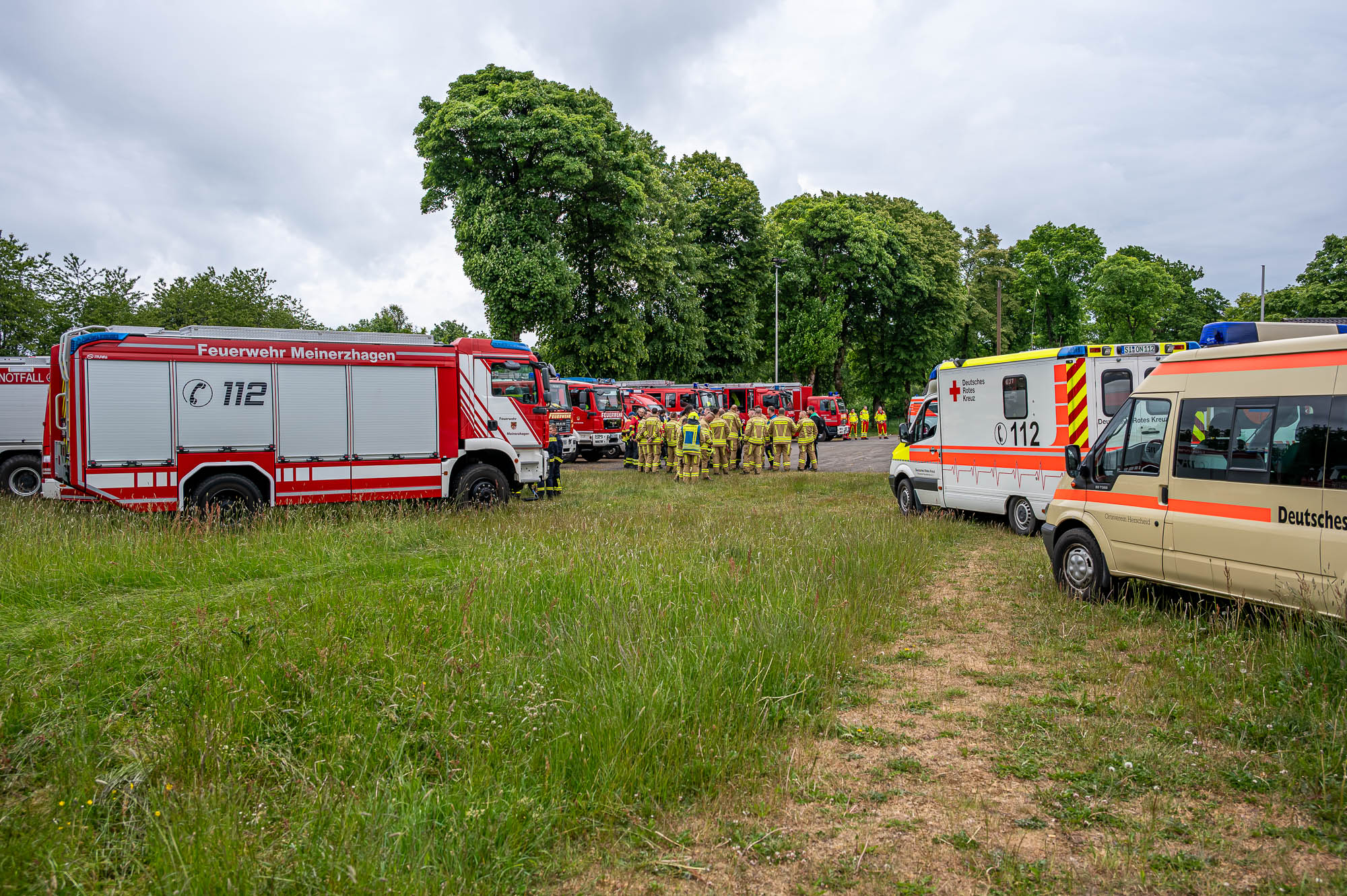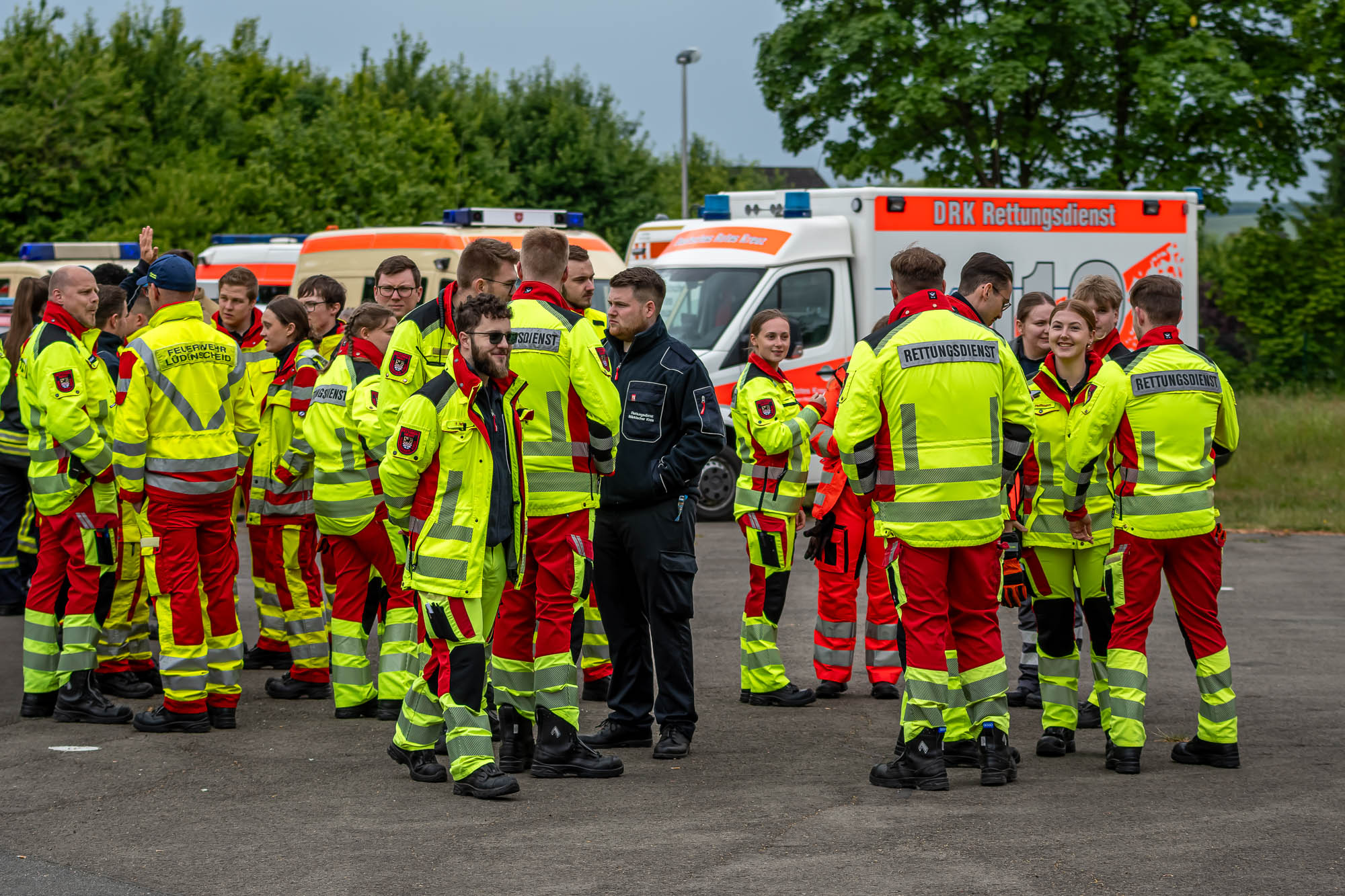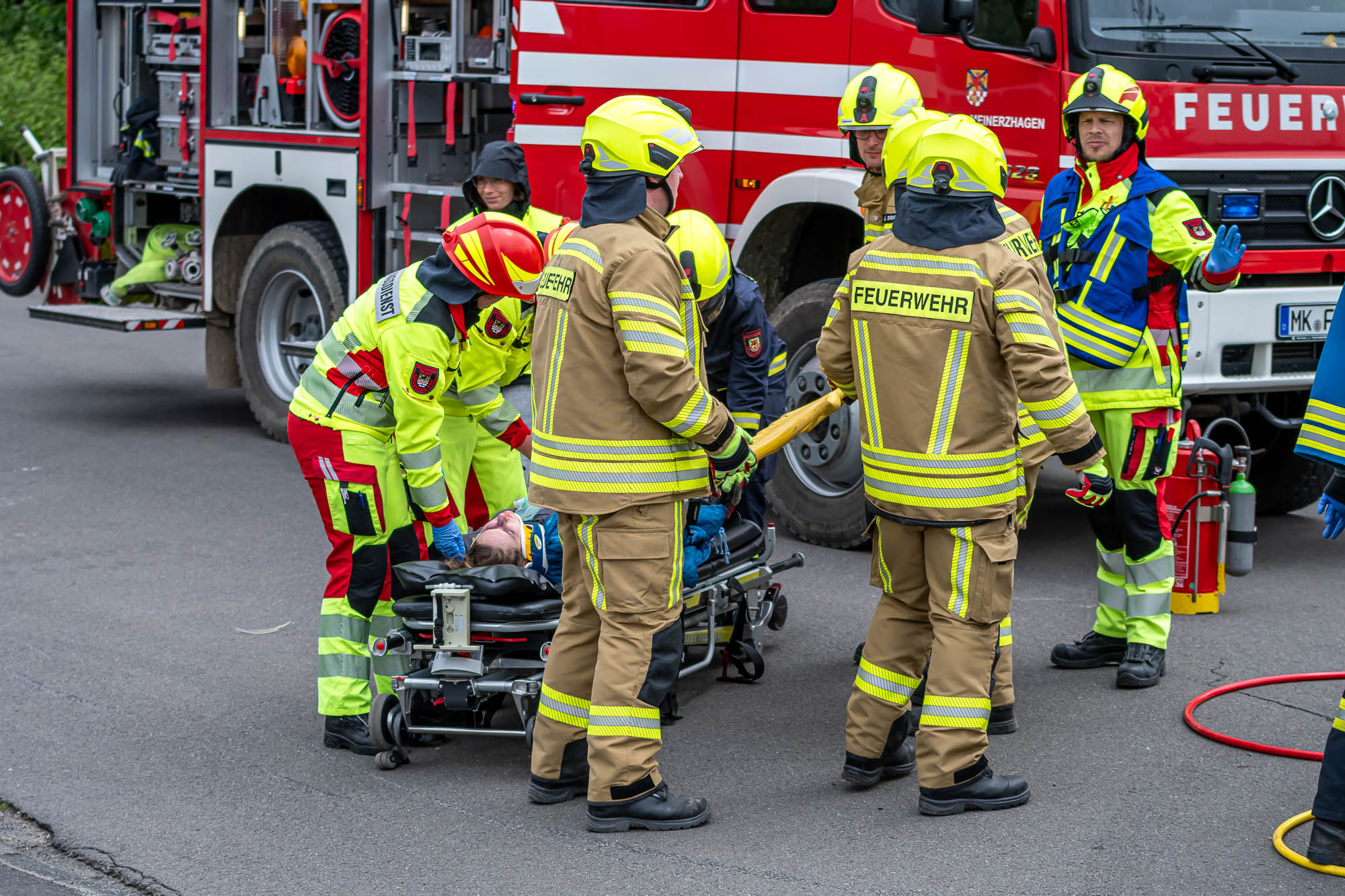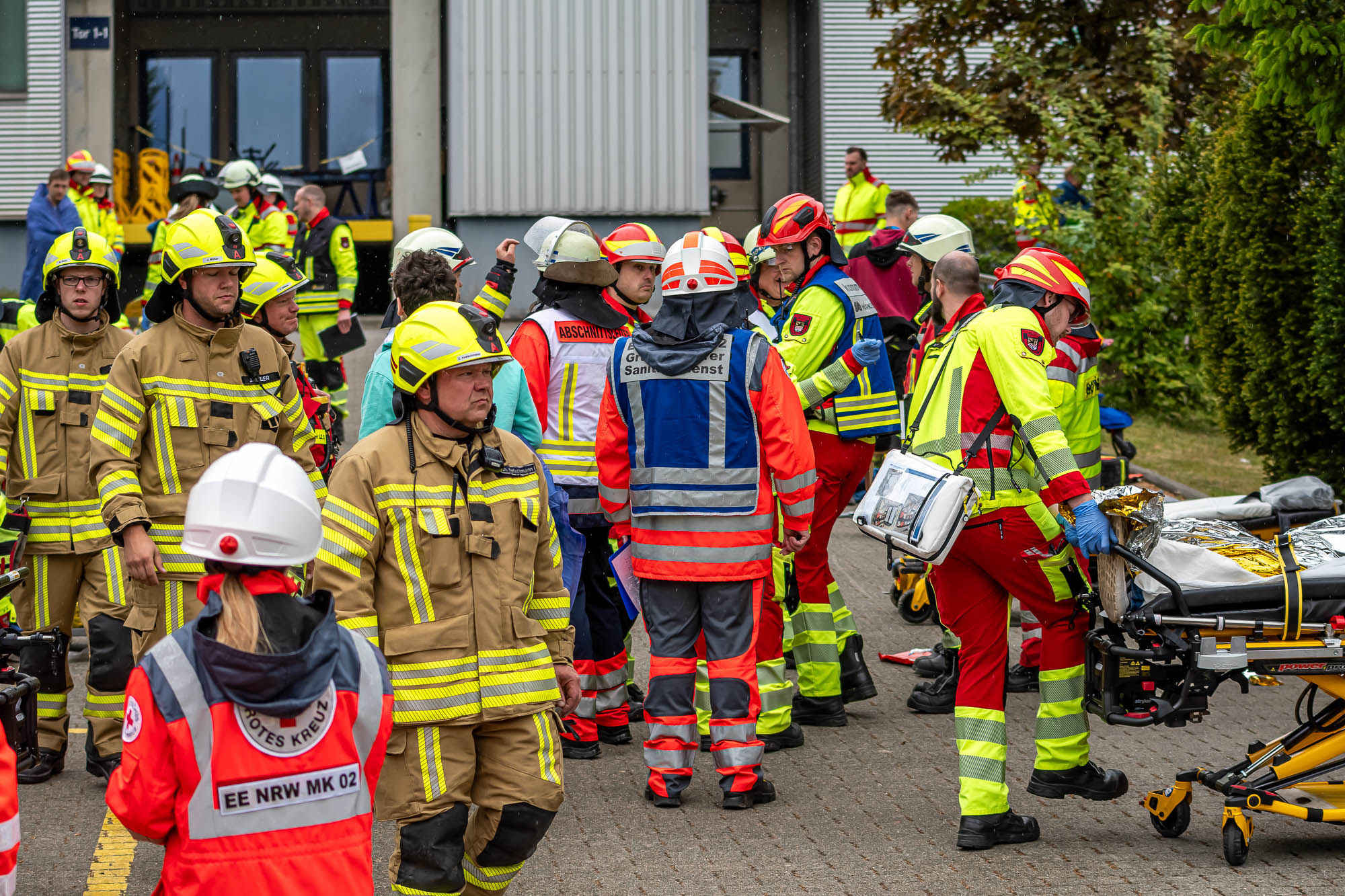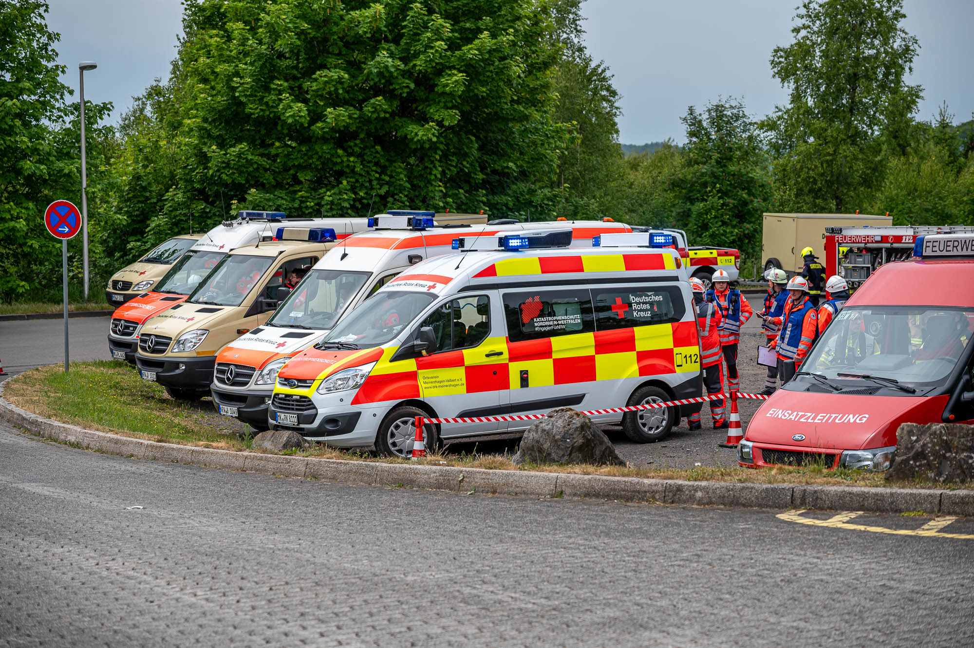 MEINERZHAGEN / MÄRKISCHER KREIS (mk) Am Ende war Kreisbrandmeister Michael Kling sichtlich zufrieden und erleichtert: Rund 200 Einsatzkräfte von Feuerwehr, Rettungsdienst und weiteren Hilfsorganisationen haben am Samstagnachmittag, 24. Mai, eine Großübung absolviert, die nicht nur durch ihren Umfang bemerkenswert war. Es kam auch eine Besonderheit dazu, die sogar einen elementaren Aspekt der Trainingsmaßnahme ausmachte: Bei dem erdachten Szenario handelte sich nicht nur um einen besonders schlimmen Verkehrsunfall, sondern obendrein um eine Bedrohungslage. Eine Situation, den allen Beteiligten auch seelisch viel abverlangte, obwohl es sich nicht um einen Ernstfall handelte.