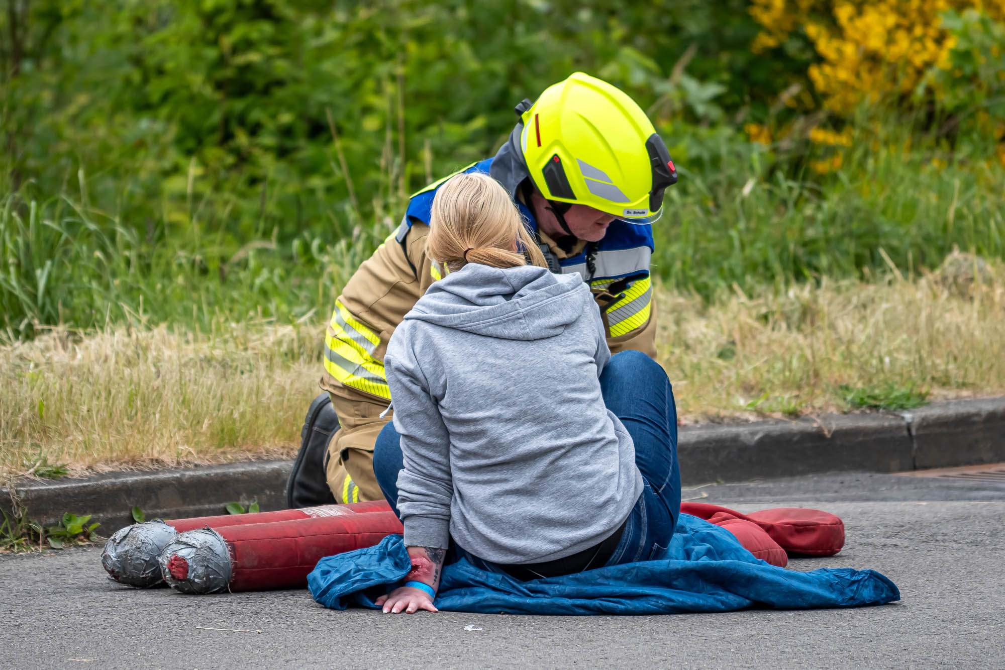 Der handwerkliche Teil der Übung klappte sowieso wie am Schnürchen: Die Insassen des kleinen VW werden in patientenschonender Vorgehensweise aus dem völlig demolierten Kleinwagen gerettet, dabei setzen die Hilfskräfte auch schweres Gerät ein. Tatsächlich handelt es sich dabei um einen Einsatz, der sich in dieser Form fast täglich irgendwo im Kreisgebiet ereignet. Doch besonders der Start ist vom Eigenschutz geprägt. Bevor sich die Einsatzkräfte der Unfallstelle beziehungsweise dem Tatort nähern, sind Frage zu klären: “Wann können wir loslegen, müssen wir selbst damit rechnen, angegriffen zu werden?” In diesem Szenario wurde von einem Einzeltäter ausgegangen, der andere Menschen mit einem Messer gefährlich verletzte. Eine Situation, die leider auch keineswegs realitätsfern ist. Hinsichtlich der fiktiven IS-Drohung kommt noch dazu: Niemand kann sicher sagen, dass nicht noch weitere Täter zuschlagen wollen und dabei möglicherweise über Waffen mit einer deutlich höheren Wirkung und Reichweite verfügen.