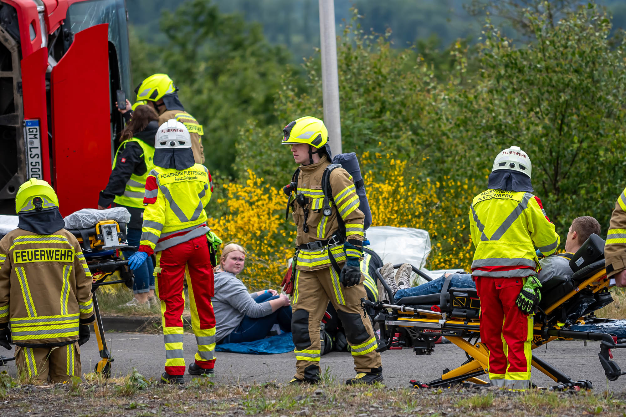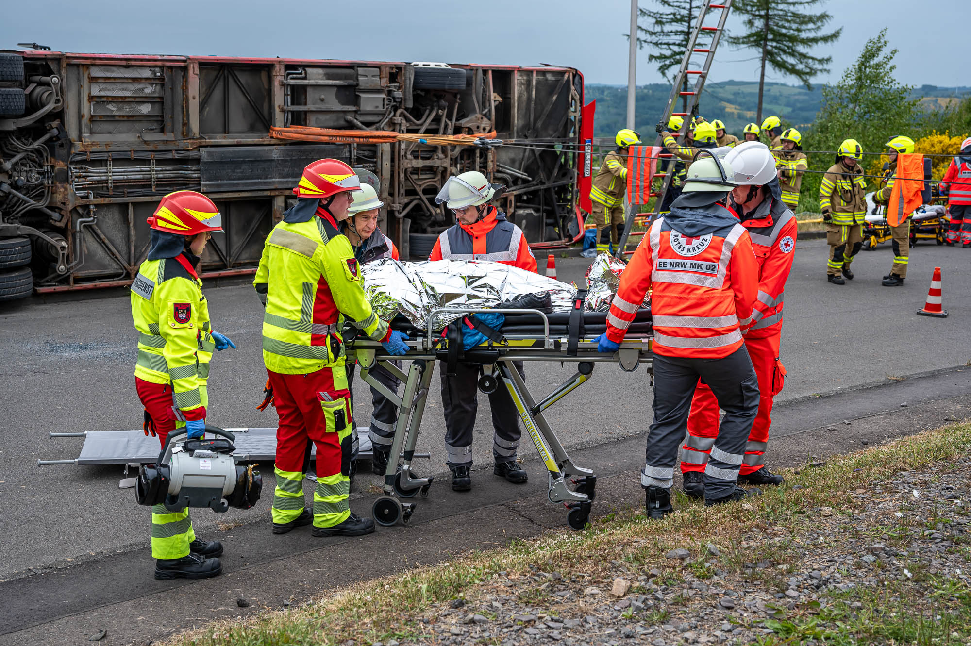 Die Kollision zwischen einem PKW und einem Linienbus fordert zahlreiche Schwerstverletzte. Unter dem umgekippten Bus liegt ein Radfahrer, und obendrein müssen sich die Rettungskräfte auf eine besondere Bedrohung einstellen: Viele der Betroffenen wurden nämlich nicht primär durch das Unfallgeschehen verletzt, sondern durch Messerangriffe. Die aktuelle Lage im Weltgeschehen zeigt: Rettungsorganisationen und beteiligte Behörden handeln verantwortlich, wenn sie sich auf solche Situationen einstellen.