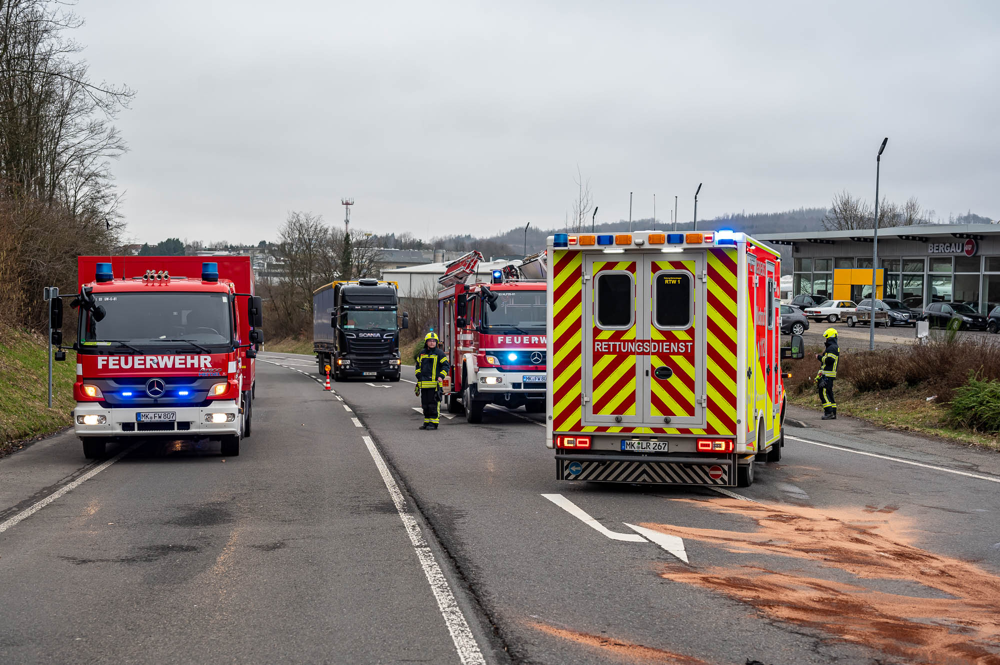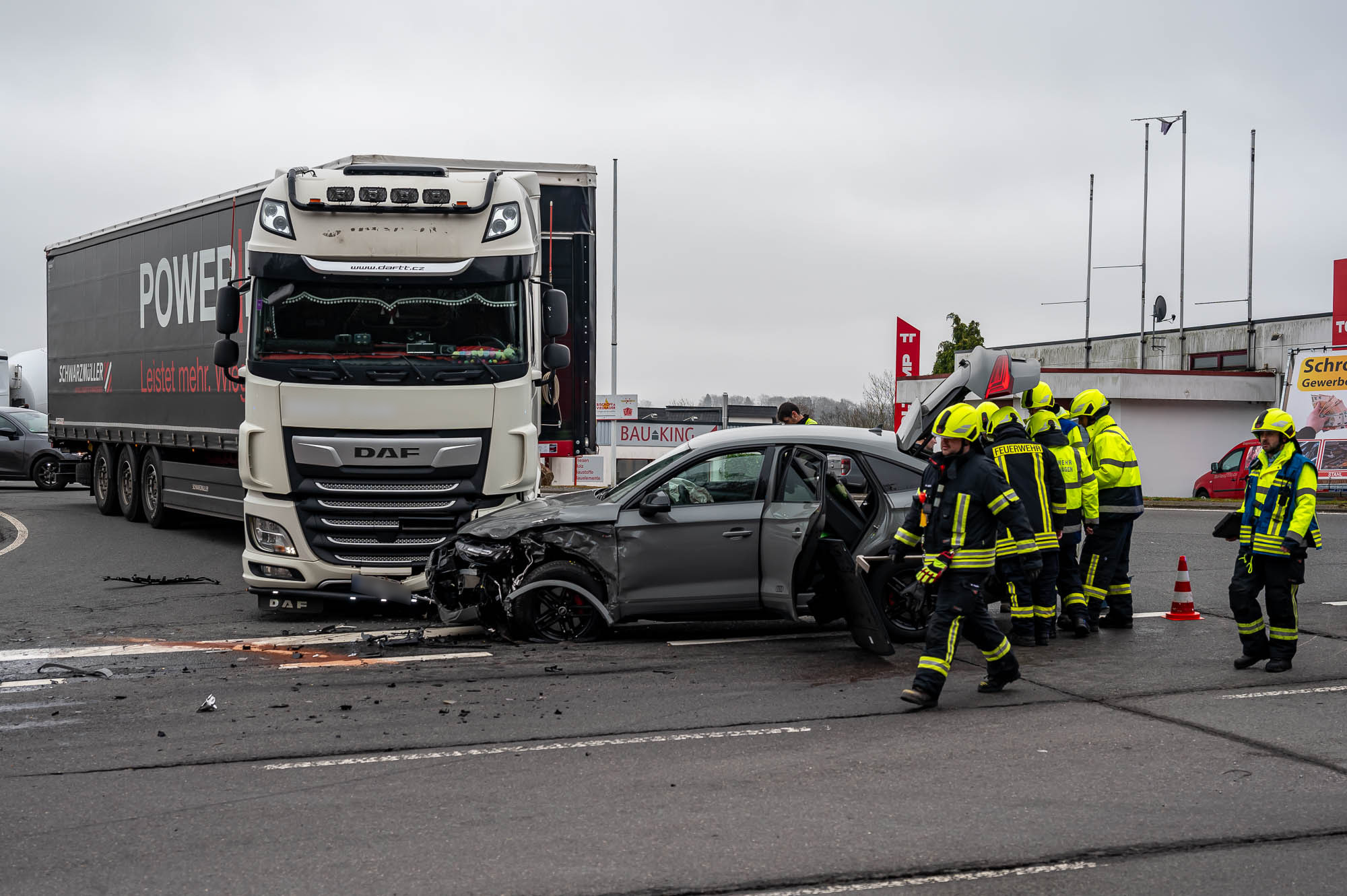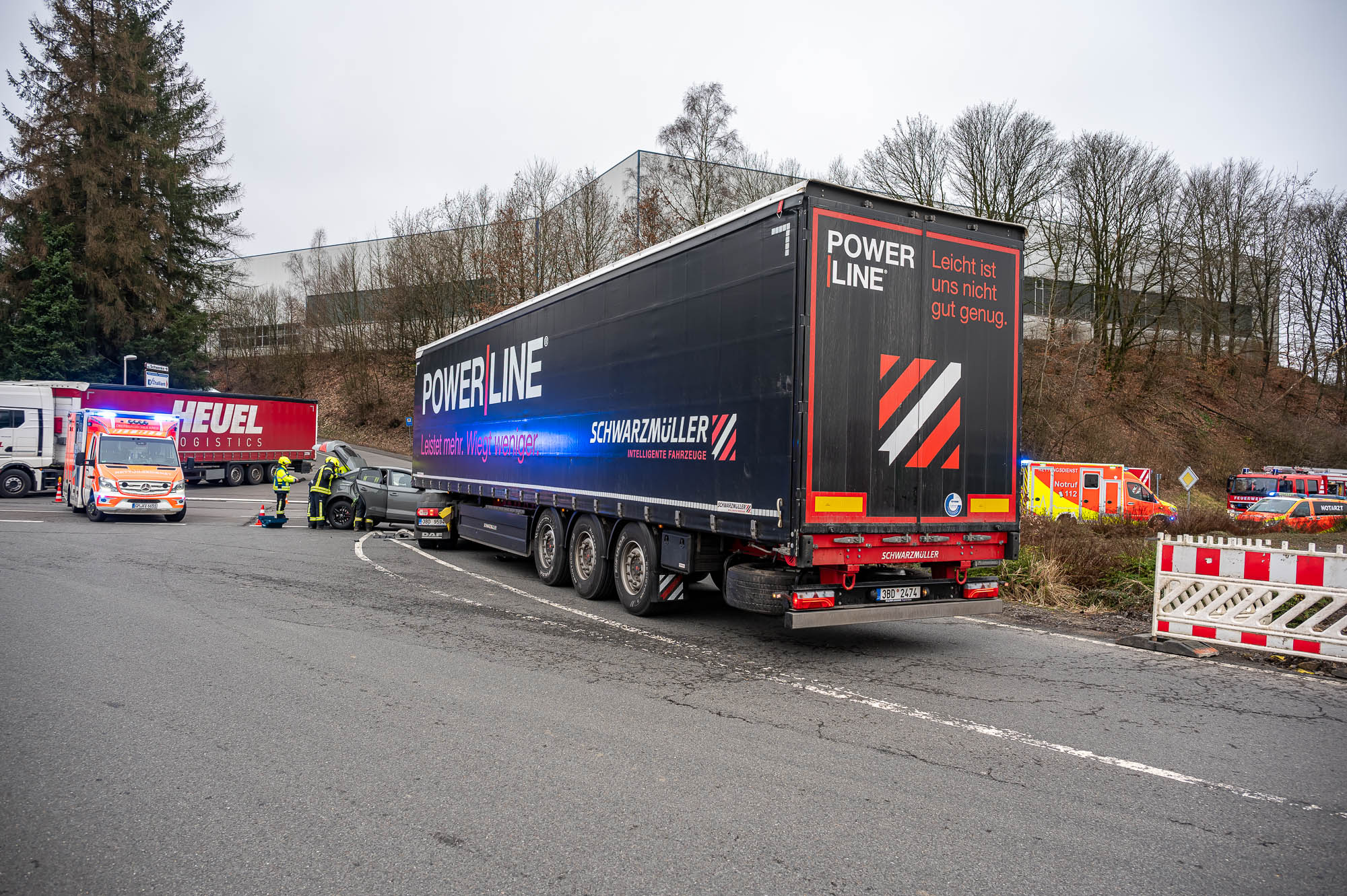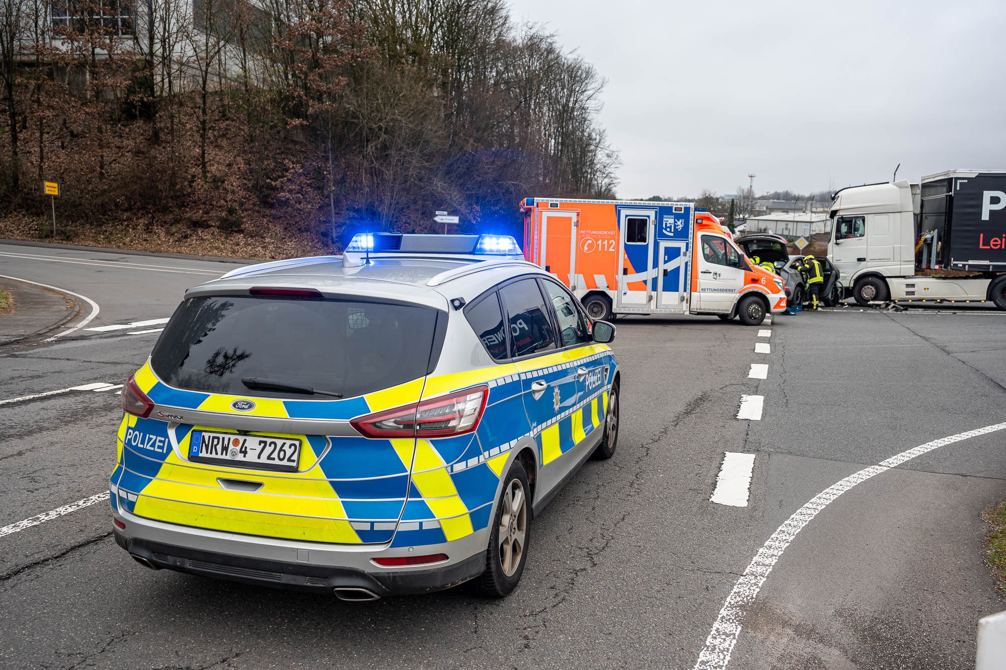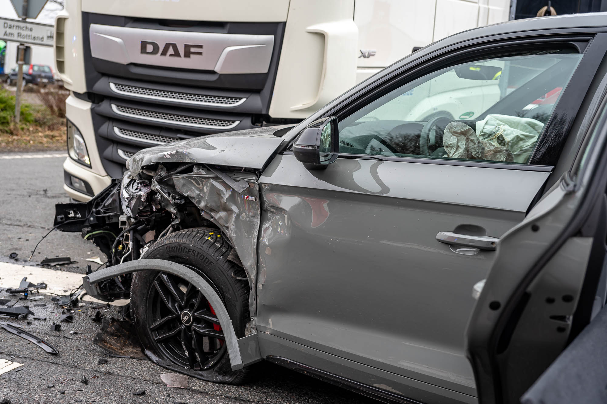 MEINERZHAGEN (mk) Glücklicherweise wohl nur leichtverletzt wurden zwei der Unfallbeteiligten, aber der Sachschaden ist enorm. Ein Paketkurier hat am Mittwochmorgen, 21. Februar, vom Eisenweg auf die L173 in Richtung Meinerzhagen abbiegen wollen, dabei aber einen vorfahrtsberechtigten Audi übersehen. Der befuhr die Landstraße aus Drolshagen kommend in dieselbe Richtung. Beide konnten die Kollision nicht mehr verhindern: Der Sprinter schob den SUV gegen einen Sattelschlepper, der eigentlich das Industriegebiet Darmcher Grund verlassen wollte.