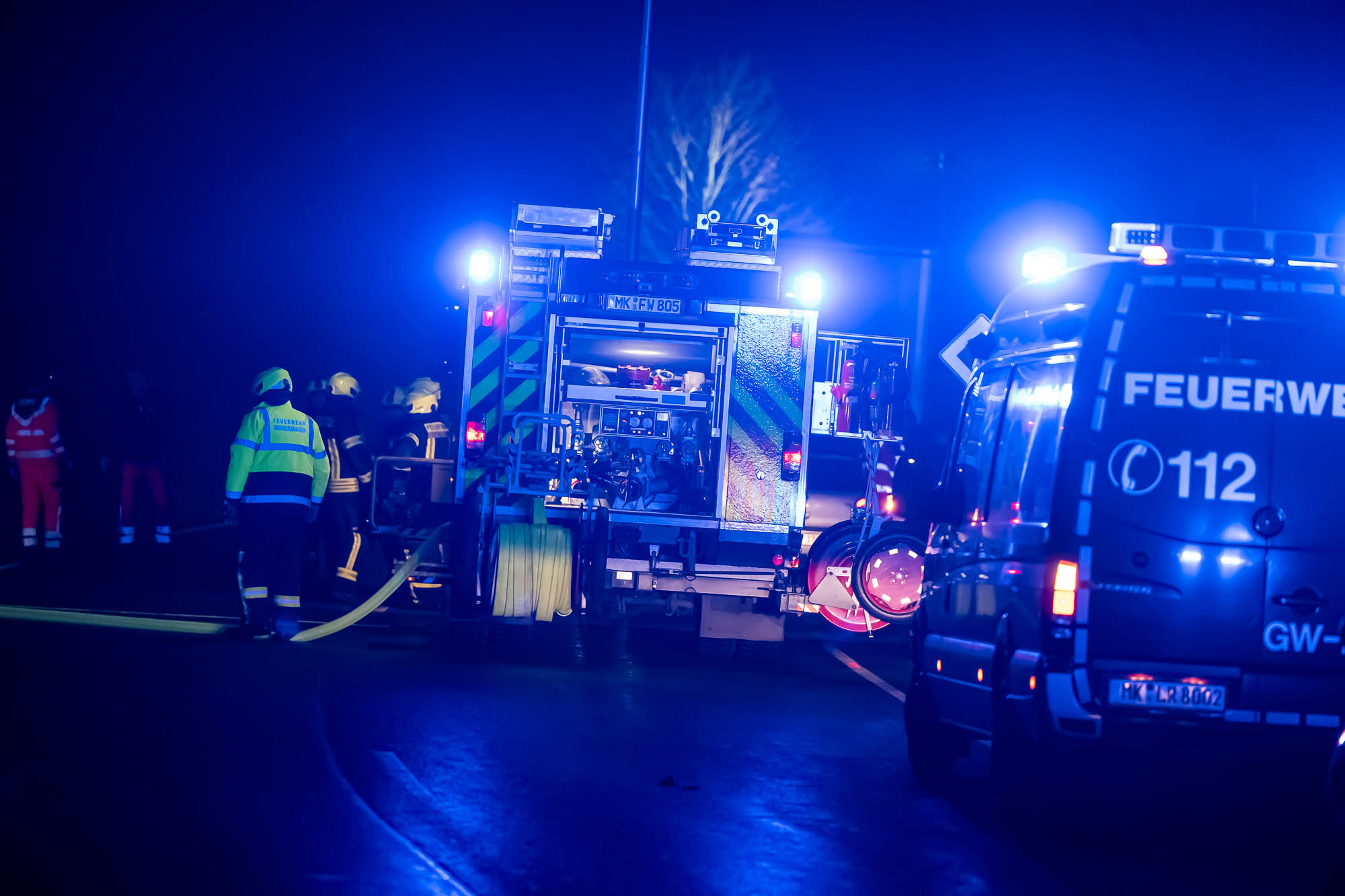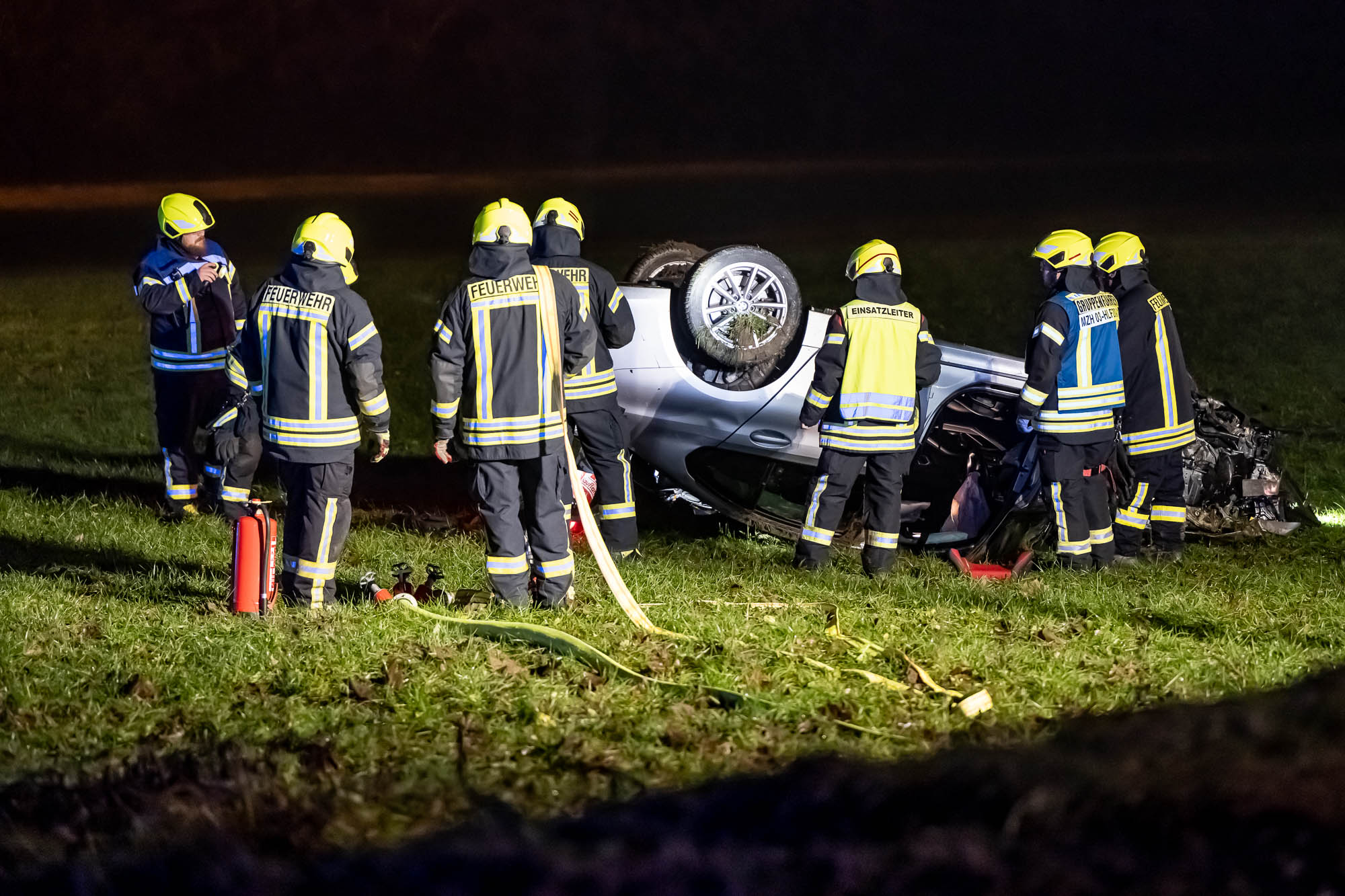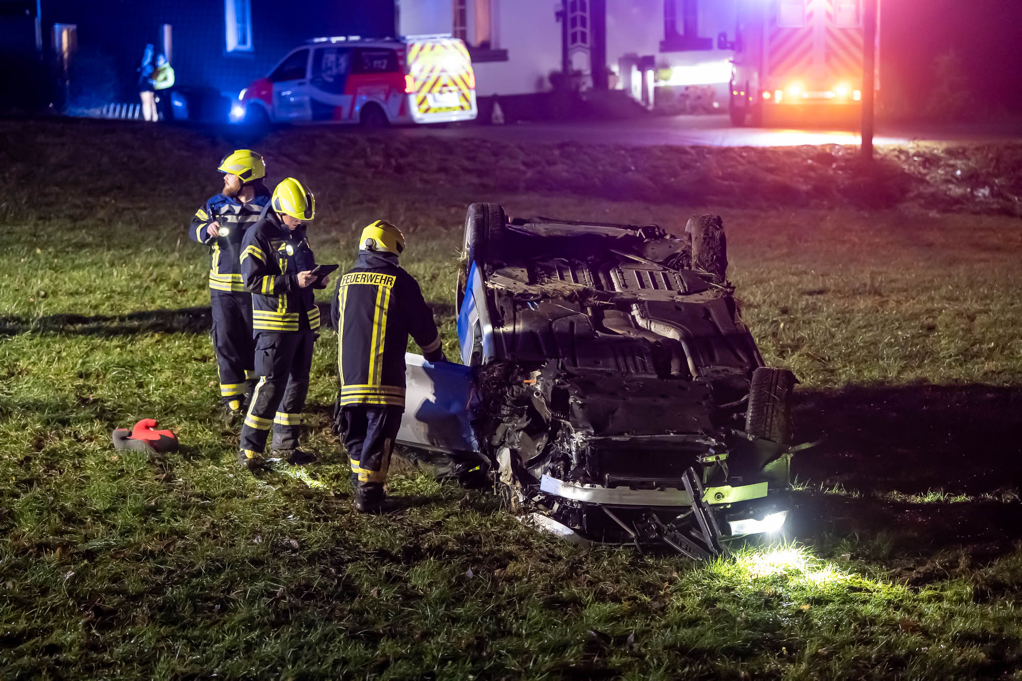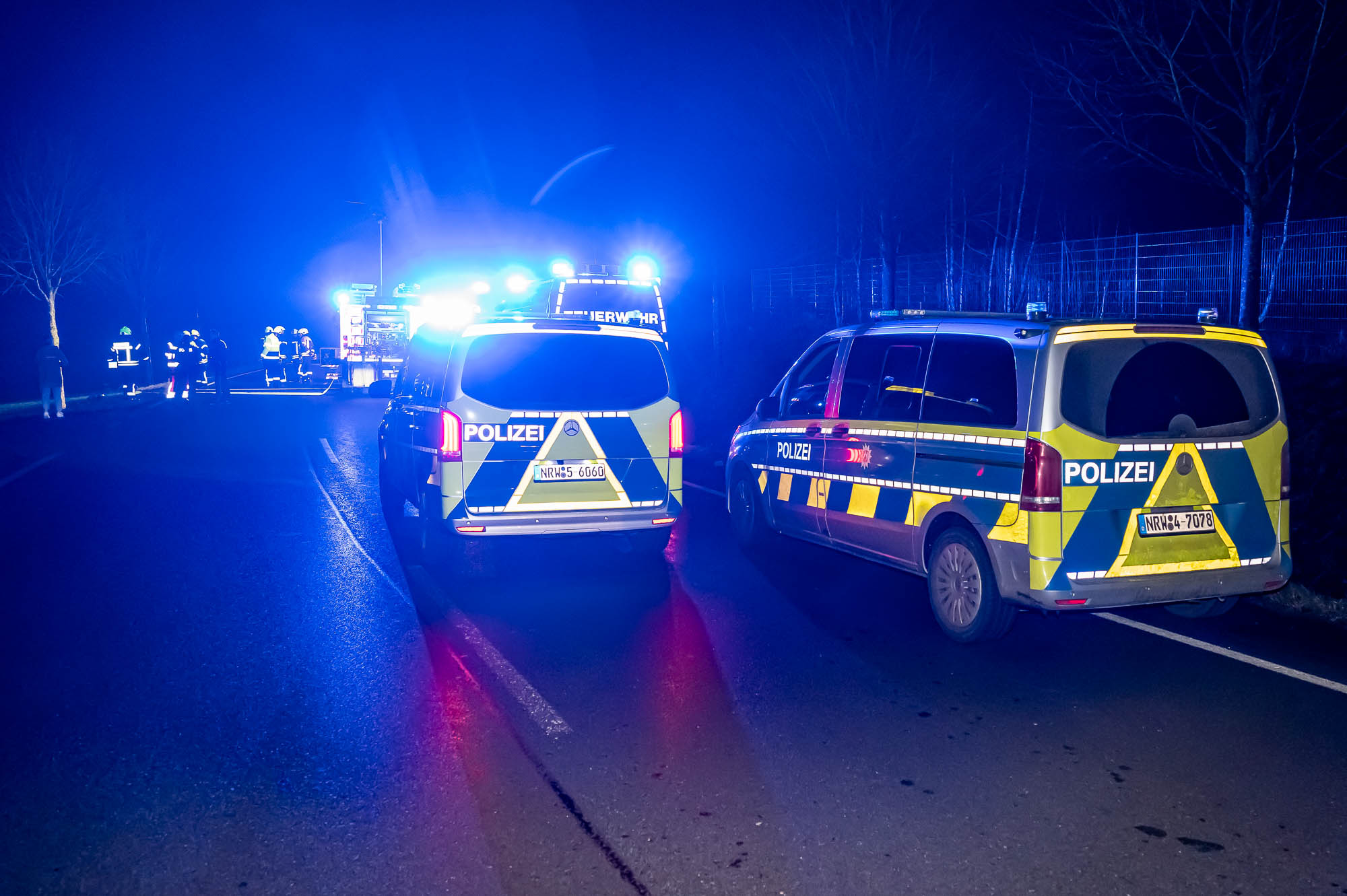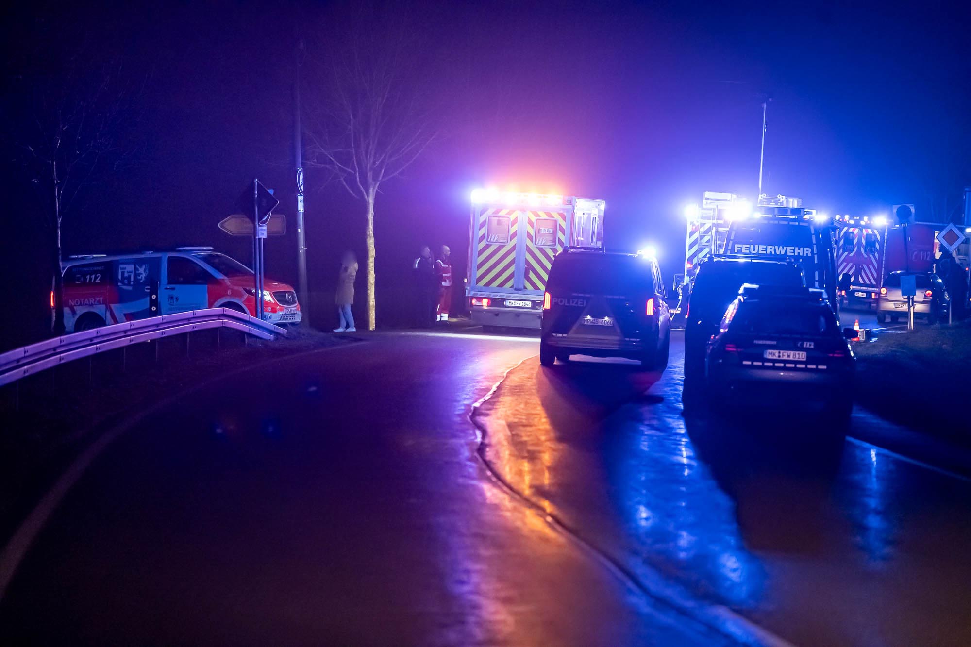 Neben der Polizei, mehreren Rettungswagen und Notärzten war auch die Feuerwehr mit etlichen Kräften vor Ort. Die ersten Alarmierung lautete zunächst auf “Eingeklemmte Person”, weshalb neben der Löschgruppe Willertshagen auch ein Rüstwagen des Löschzugs Stadtmitte ausgerückt waren. Auch Kräfte der Löschgruppe Lengelscheid wurde zunächst alarmiert, brauchte aber nicht mehr auszurücken. Die ersten Rettungskräfte fanden an der Unfallstelle das leere Unfallwrack vor und befürchteten, die Insassen hätten sich in hilfloser Lage entfernt. Zur Suche sollte eine Drohne mit Wärmebildkamera eingesetzt werden.