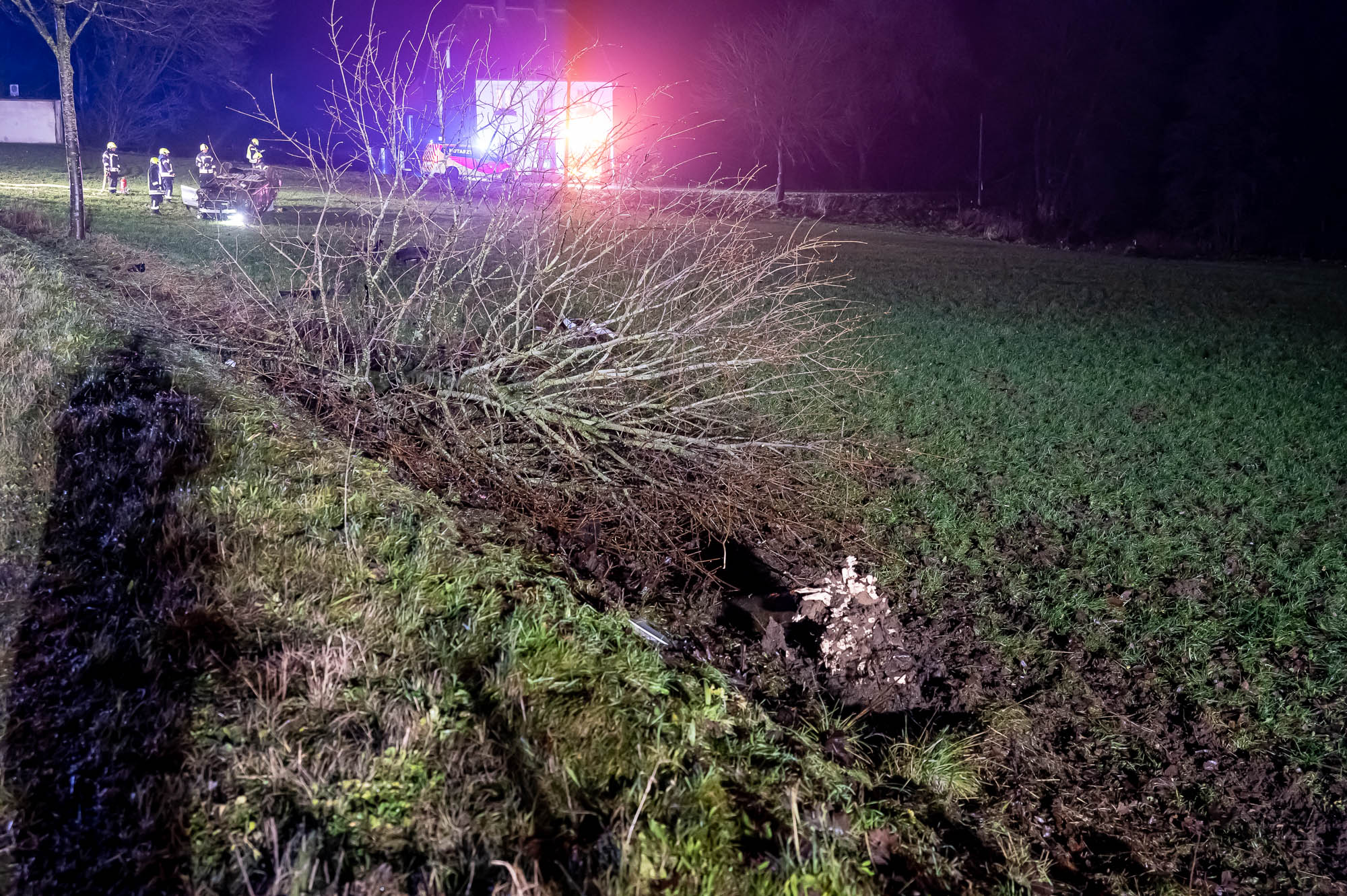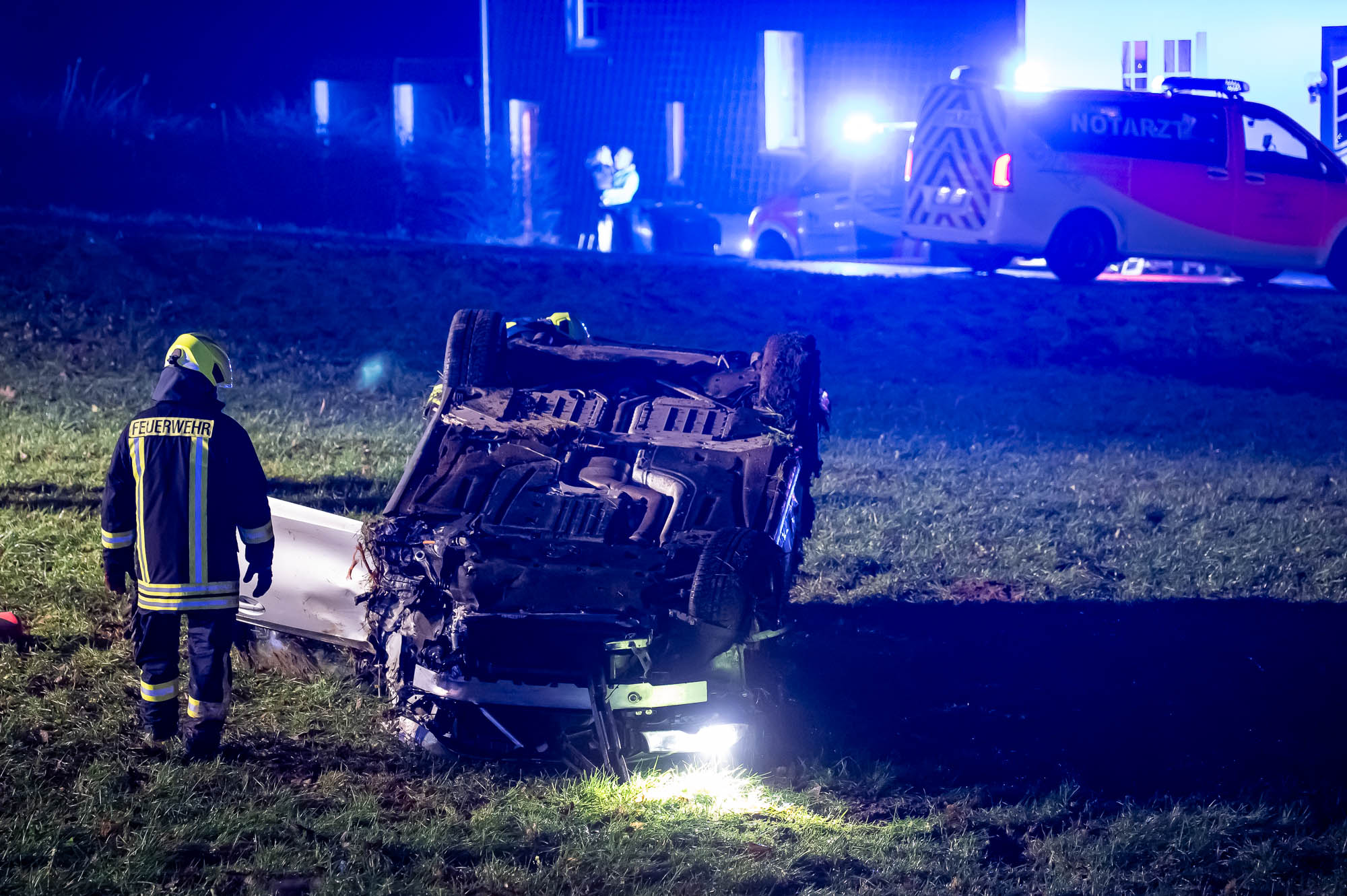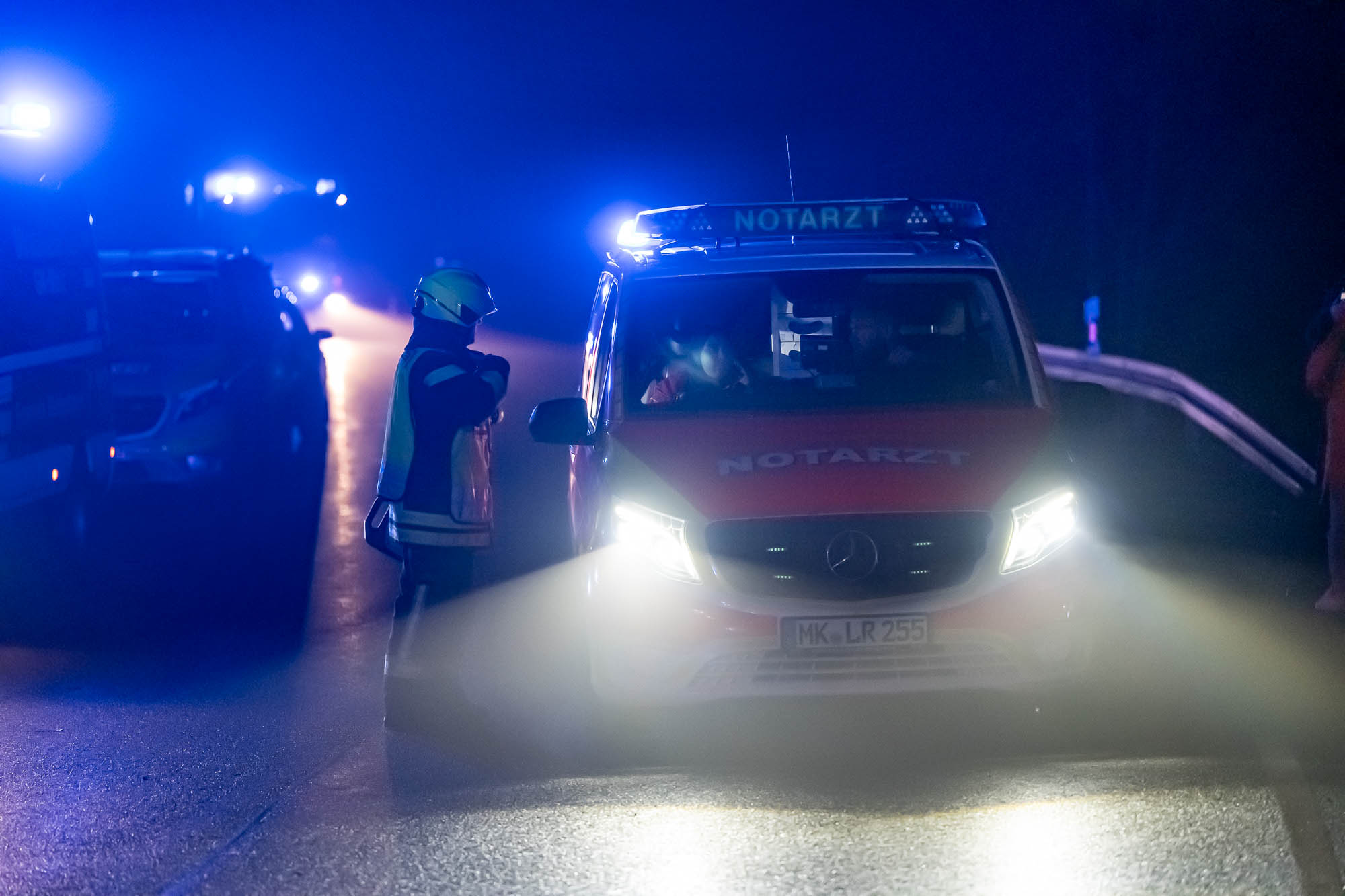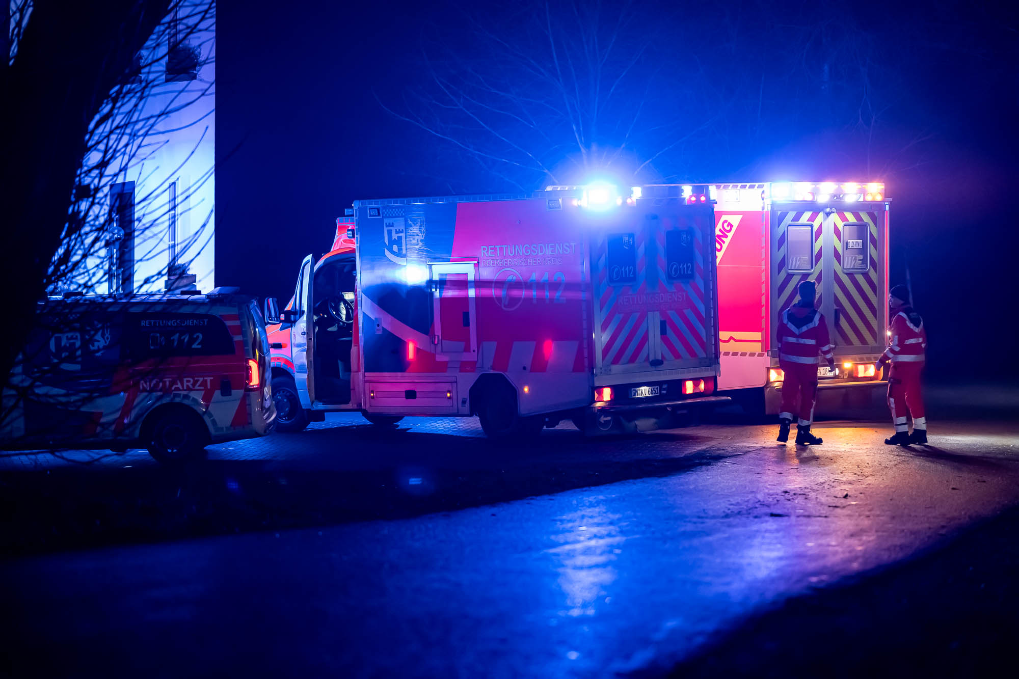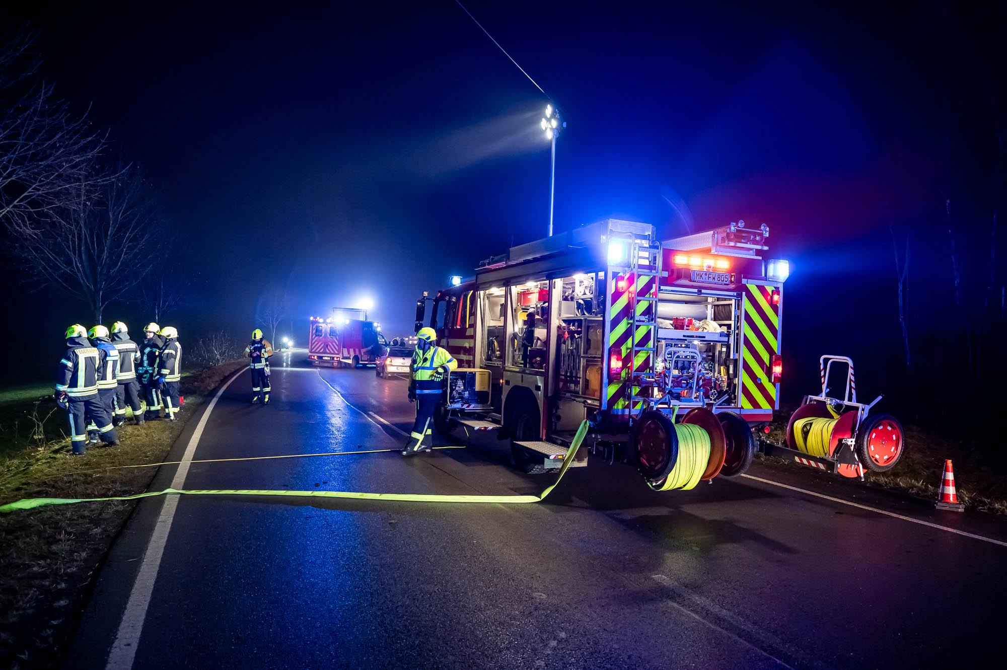 Neben der Polizei, mehreren Rettungswagen und Notärzten war auch die Feuerwehr mit etlichen Kräften vor Ort. Die ersten Alarmierung lautete zunächst auf “Eingeklemmte Person”, weshalb neben der Löschgruppe Willertshagen auch ein Rüstwagen des Löschzugs Stadtmitte ausgerückt waren. Auch Kräfte der Löschgruppe Lengelscheid wurde zunächst alarmiert, brauchte aber nicht mehr auszurücken. Die ersten Rettungskräfte fanden an der Unfallstelle das leere Unfallwrack vor und befürchteten, die Insassen hätten sich in hilfloser Lage entfernt. Zur Suche sollte eine Drohne mit Wärmebildkamera eingesetzt werden.